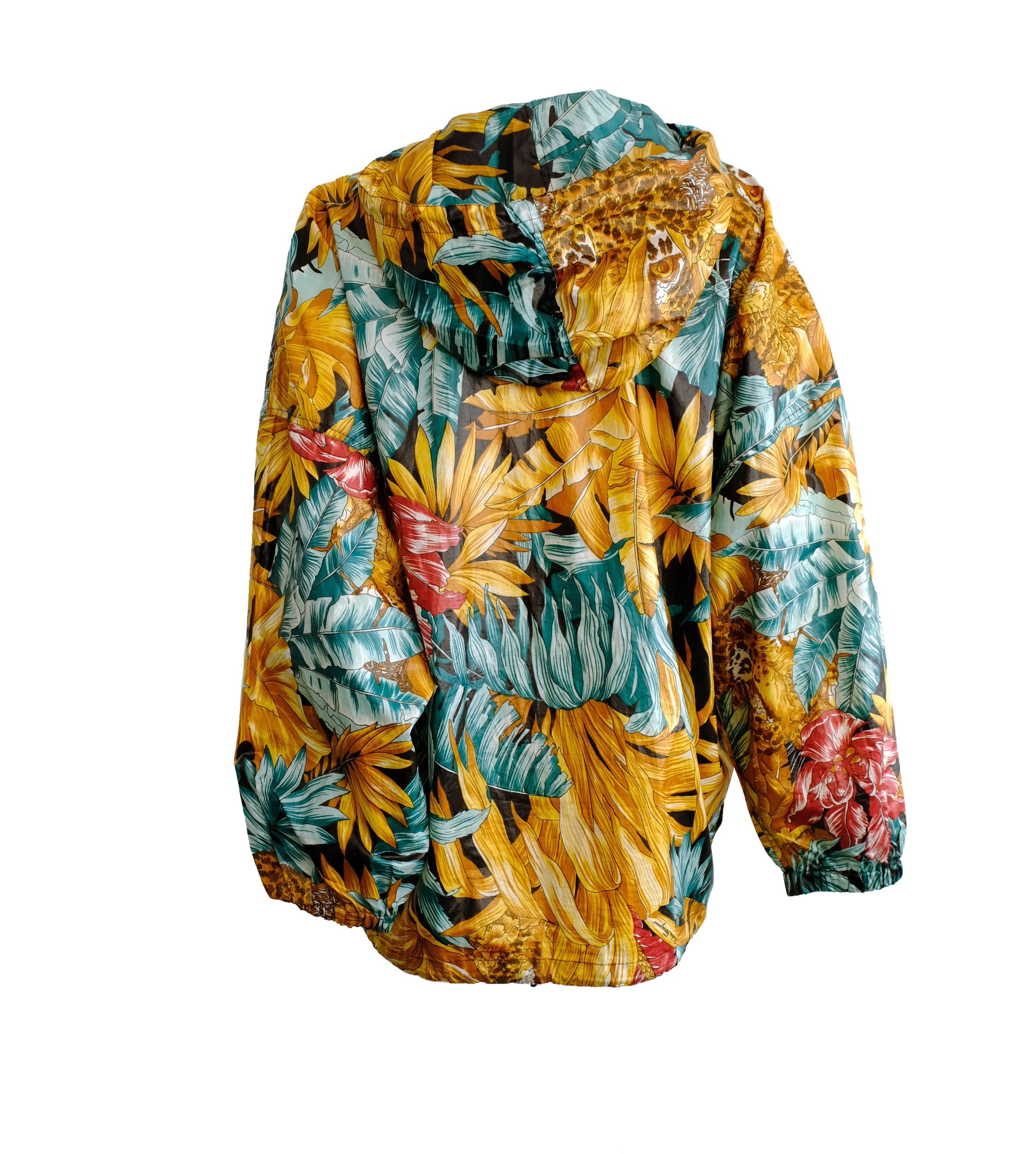 A fantastic lightweight 1990s vintage blouson jacket by Salvatore Ferragamo in luscious jungle print coated polyester fabric.  Fabulous signature print of jungle cats, palms and foliage in gold and  green tones with red details.