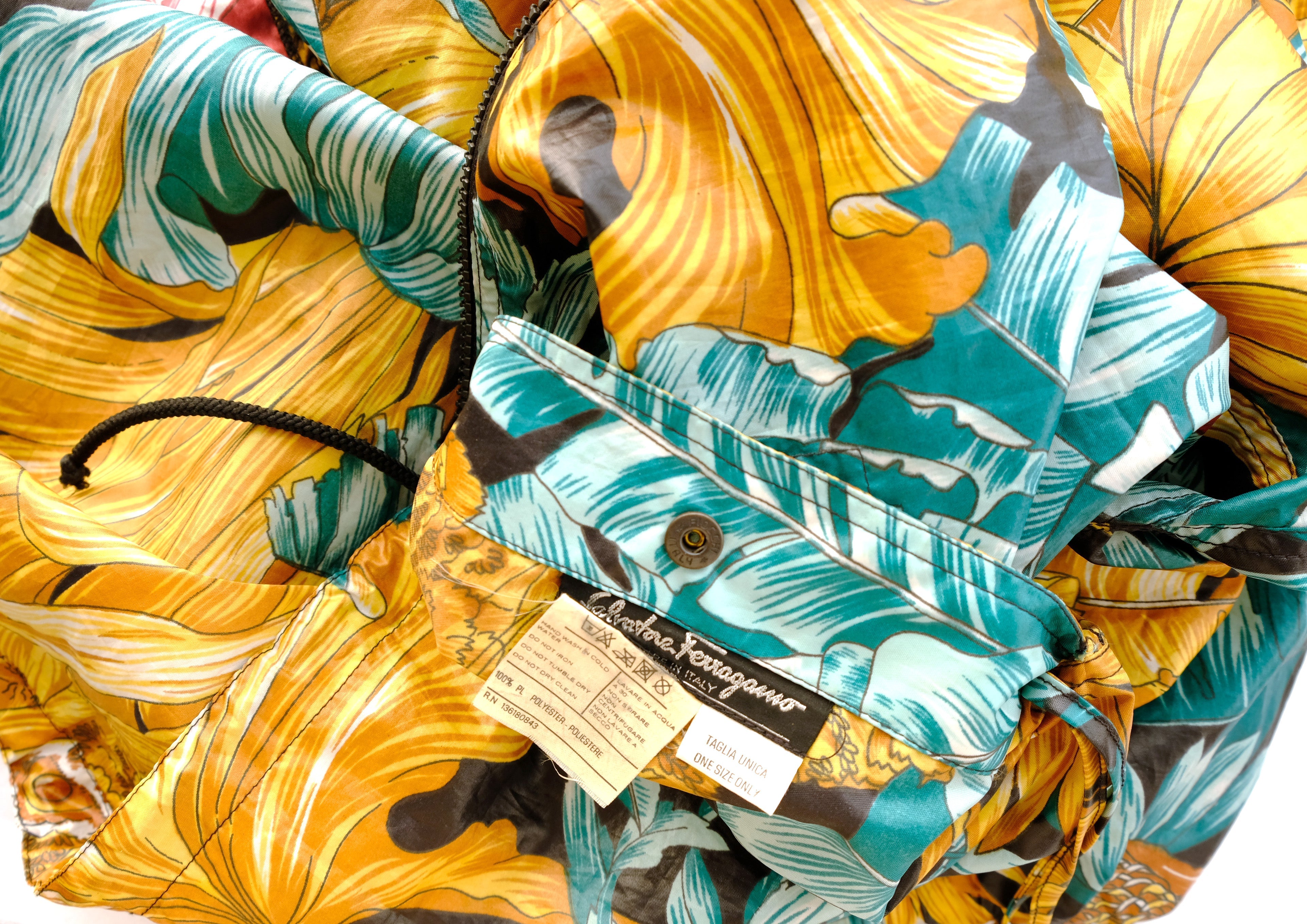 A fantastic lightweight 1990s vintage blouson jacket by Salvatore Ferragamo in luscious jungle print coated polyester fabric. Fabulous signature print of jungle cats, palms and foliage in gold and green tones with red details.