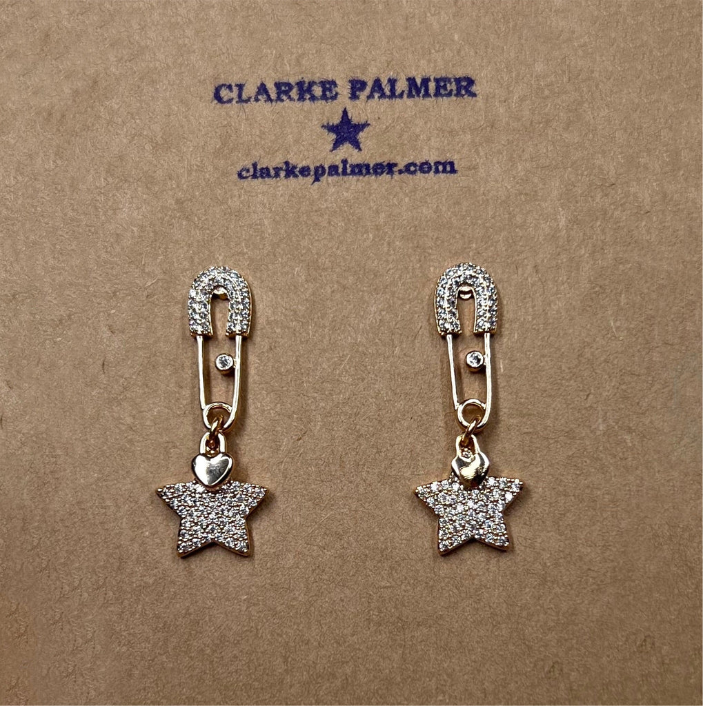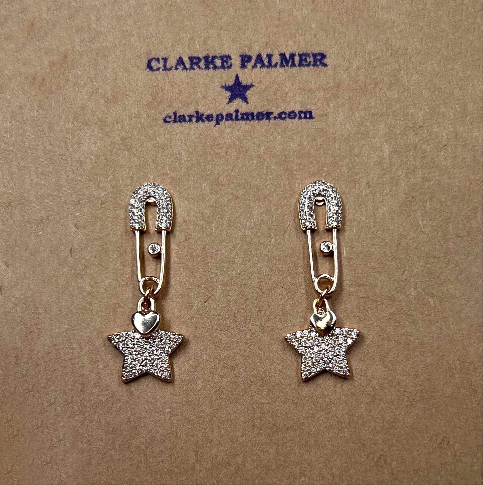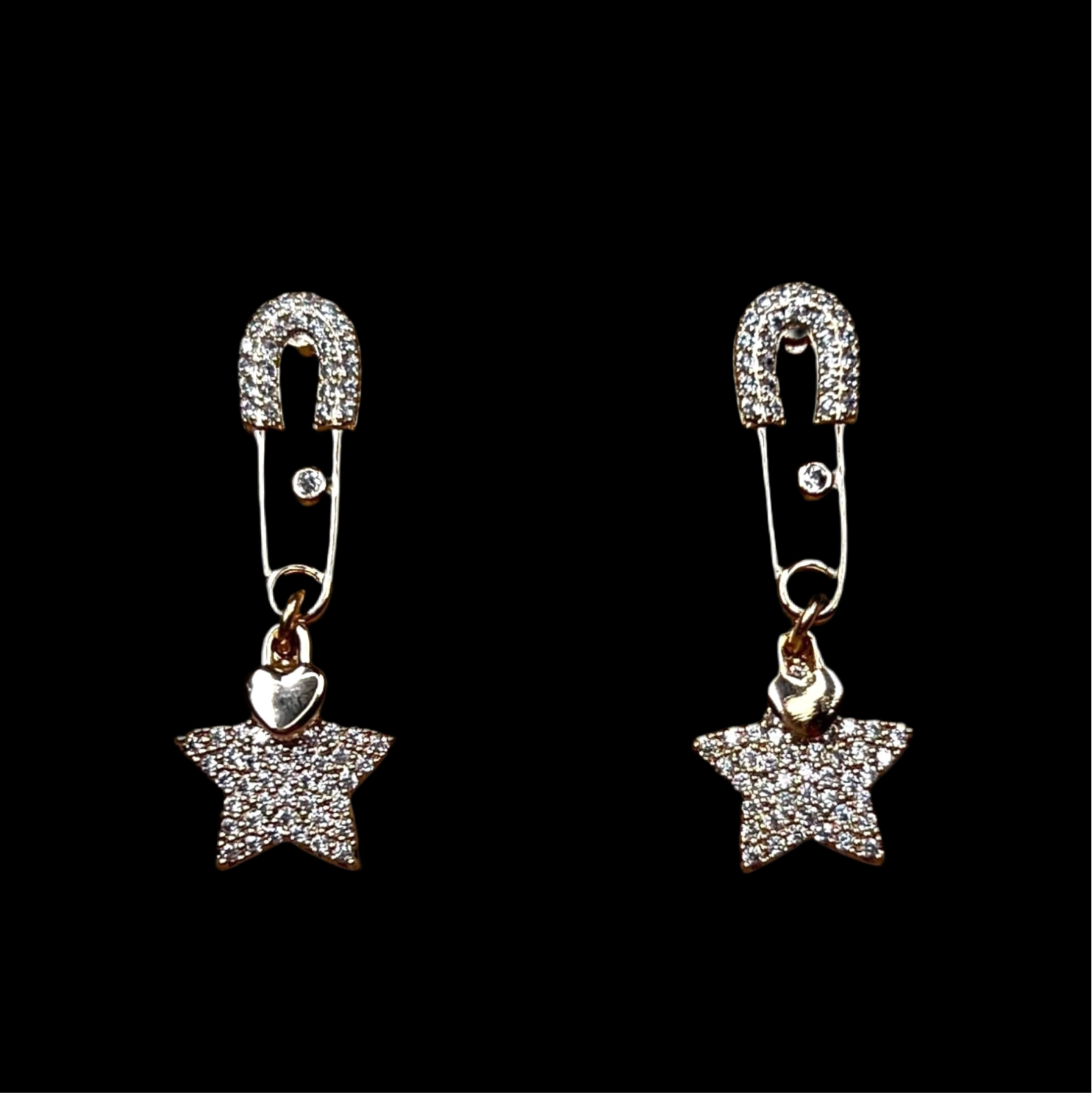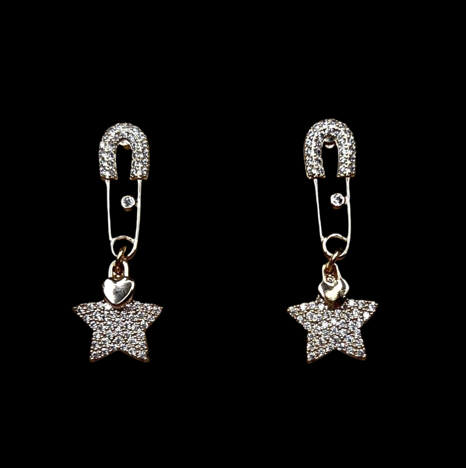 These beautiful 24 kt rose gold vermeil earrings have a large star studded with clear CZ stones and heart charm in Safety Pin Style.