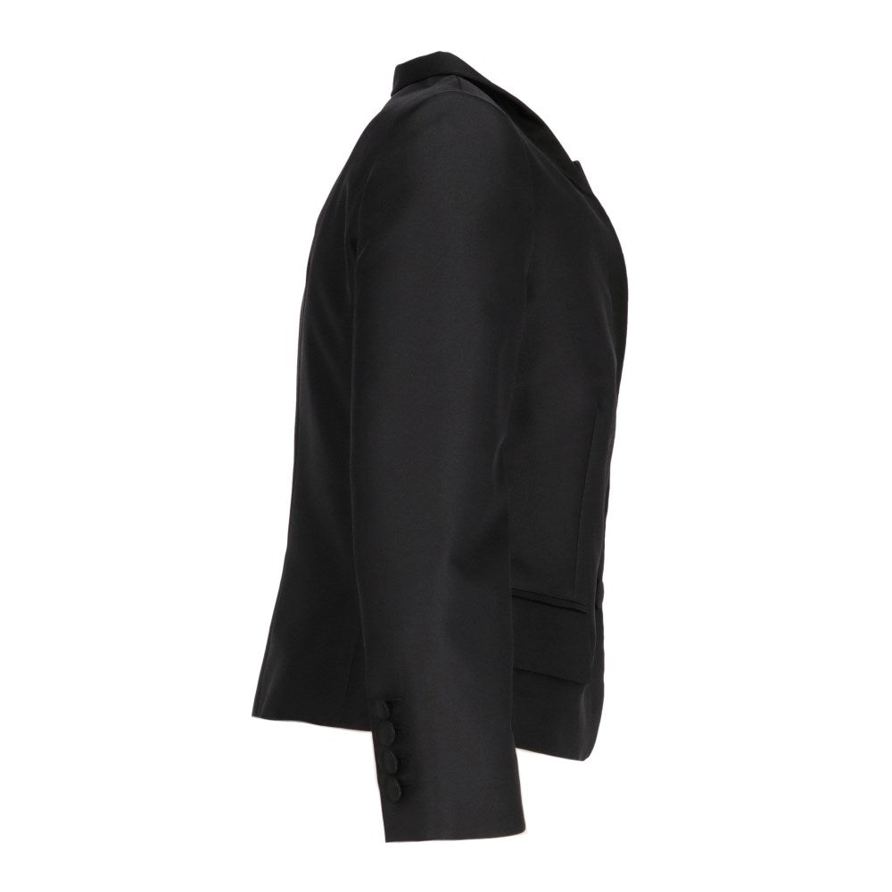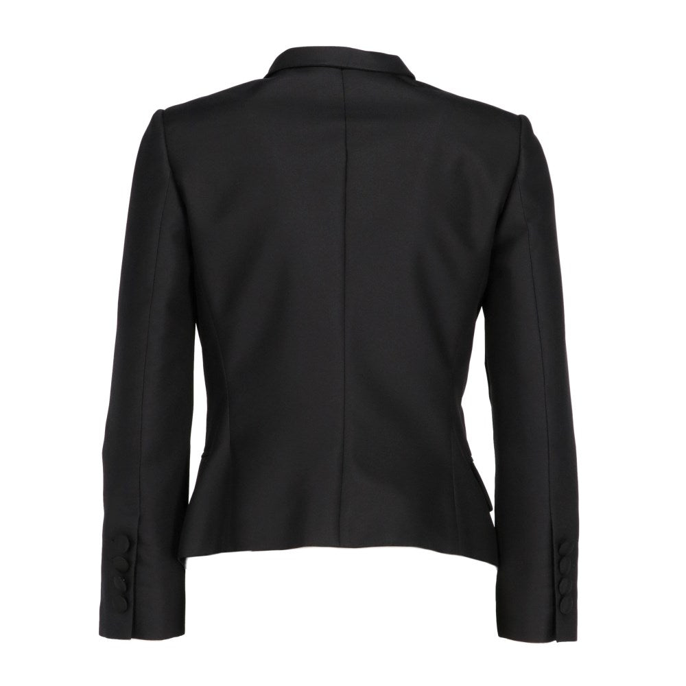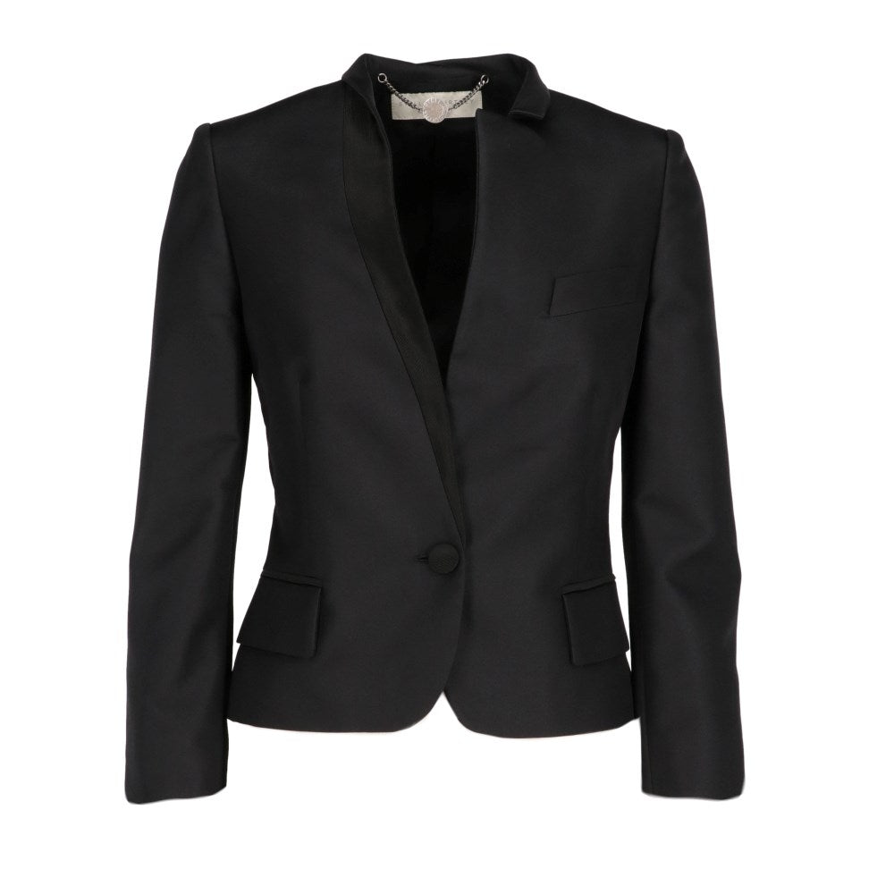 Stella McCartney black polyester blend 2000s jacket. Shawl collar on one side and classic on the other. A faux pocket on the chest, closure with a single button front.
