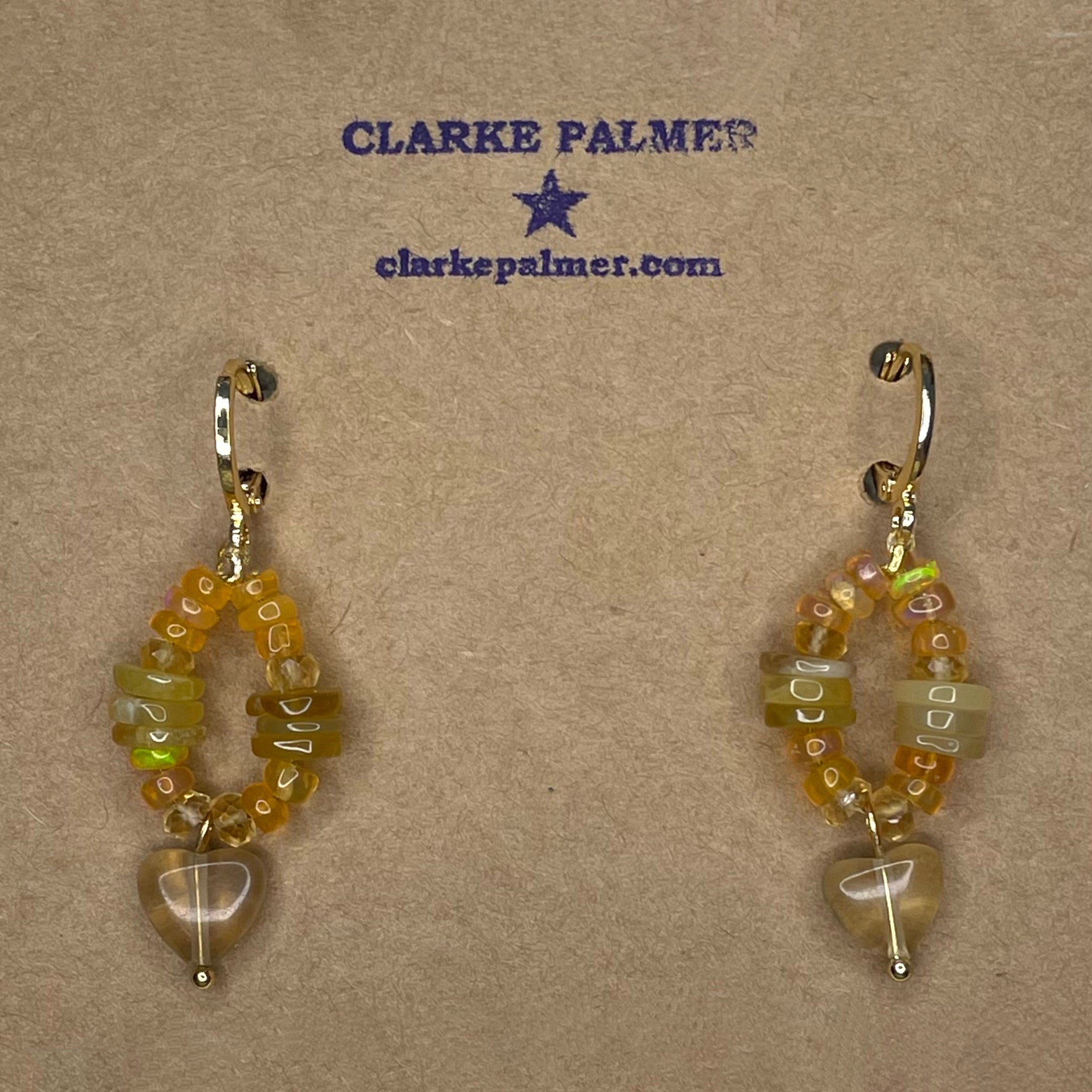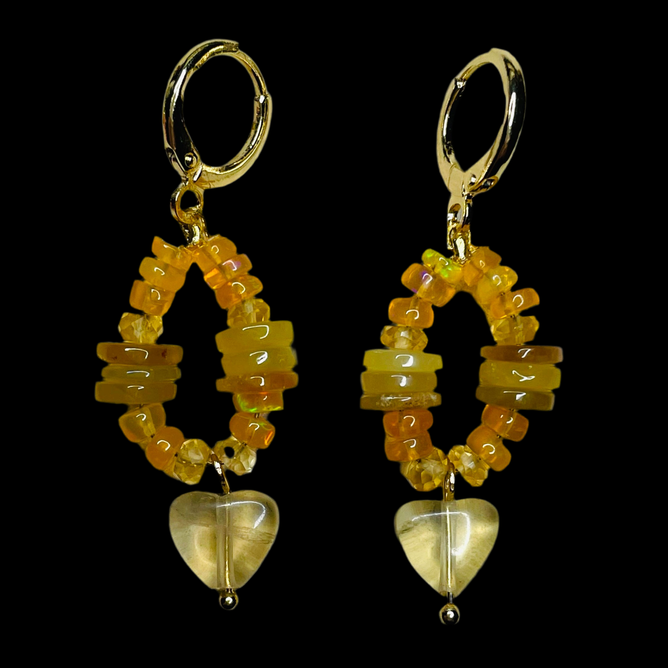 Part of our Precious Elements Collection, these 'Sunshine' earrings are handmade from golden rondelle and tyre opals, hand cut faceted citrine rondelles and flourite heart drops