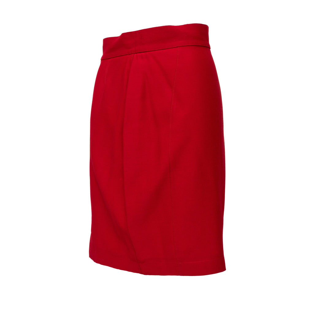 Part of the 'Les Infernales' collection, this wool-rayon set showcases a midi skirt and a single-button blazer that perfectly accentuates the body's silhouette.