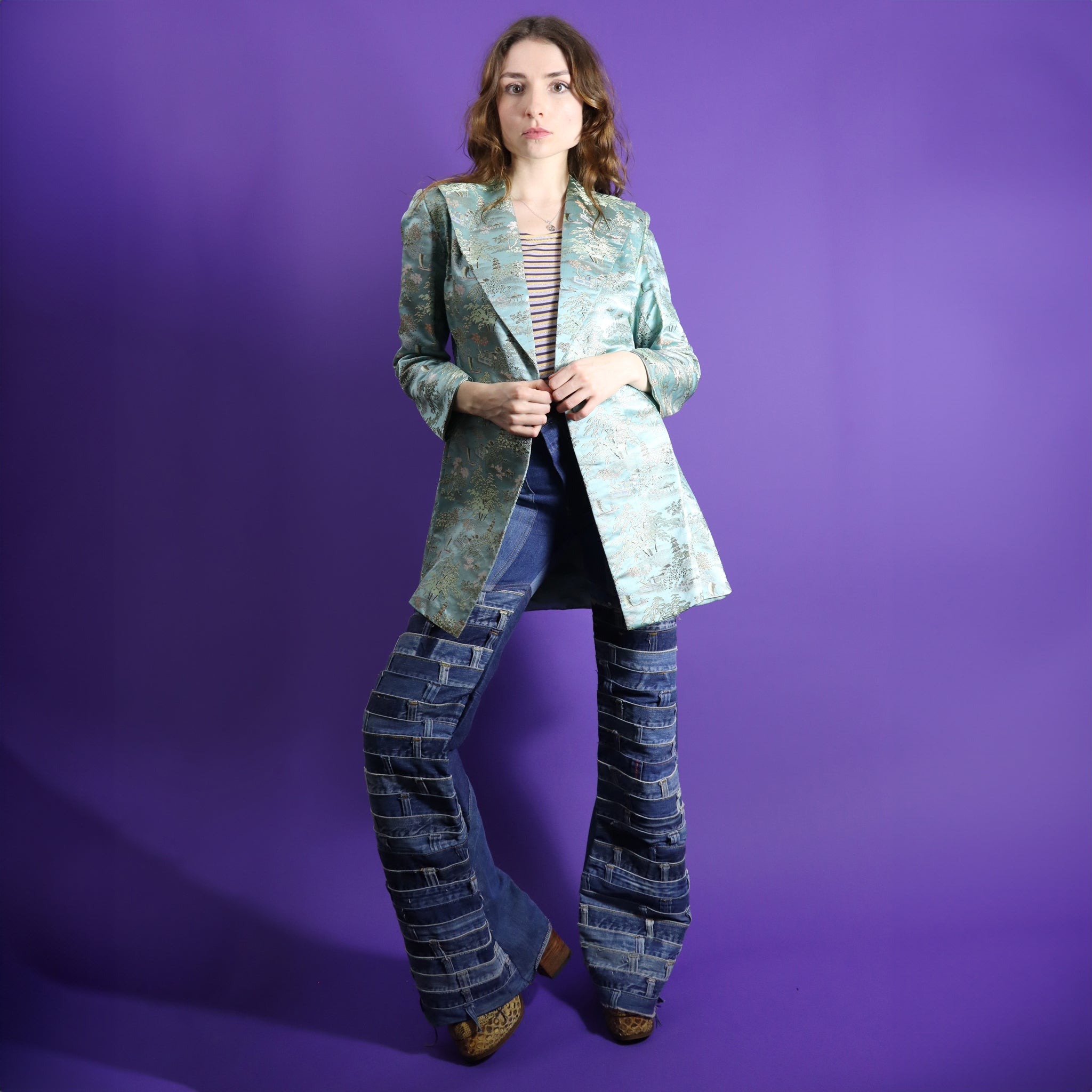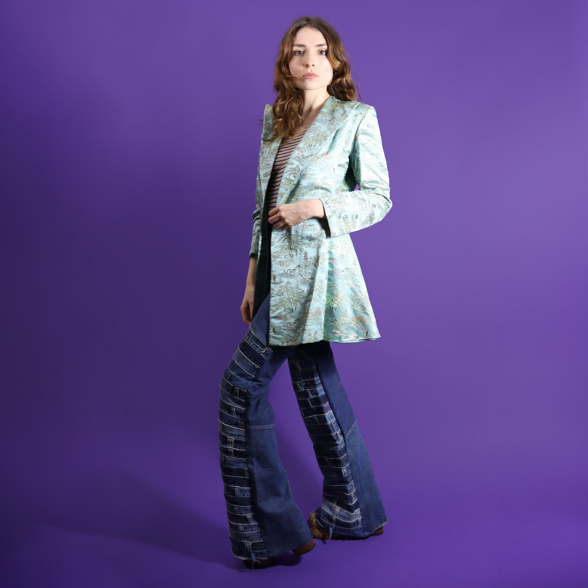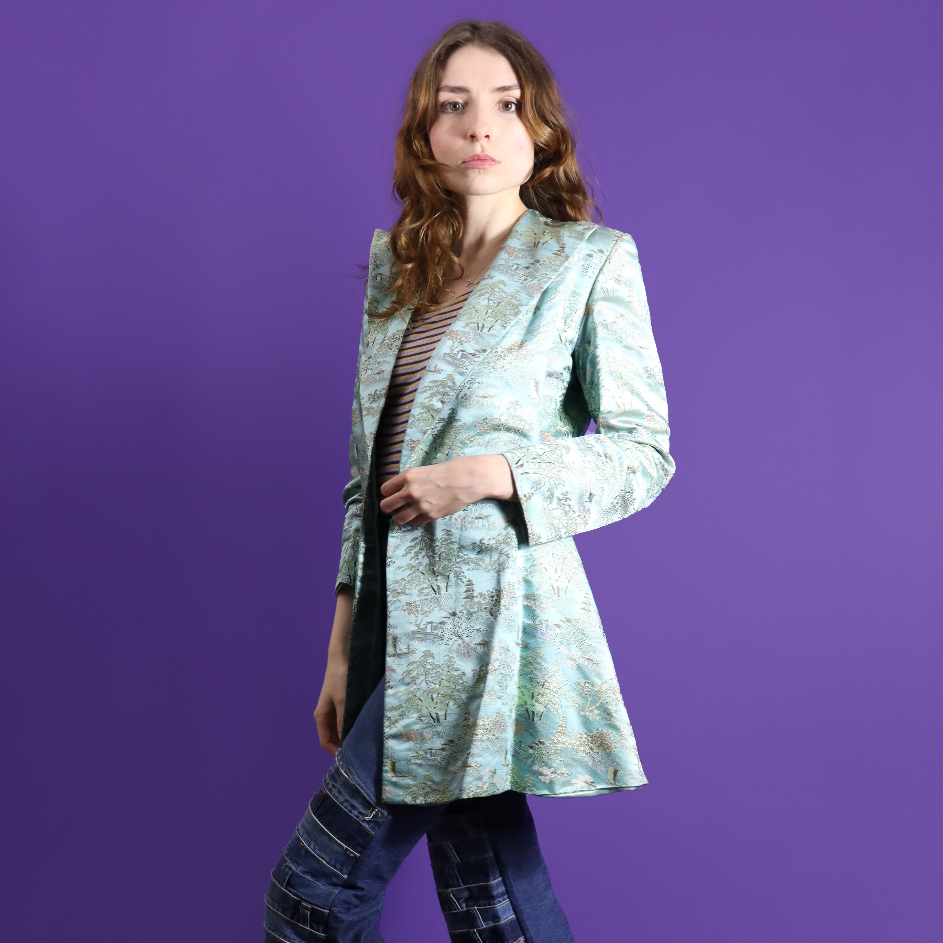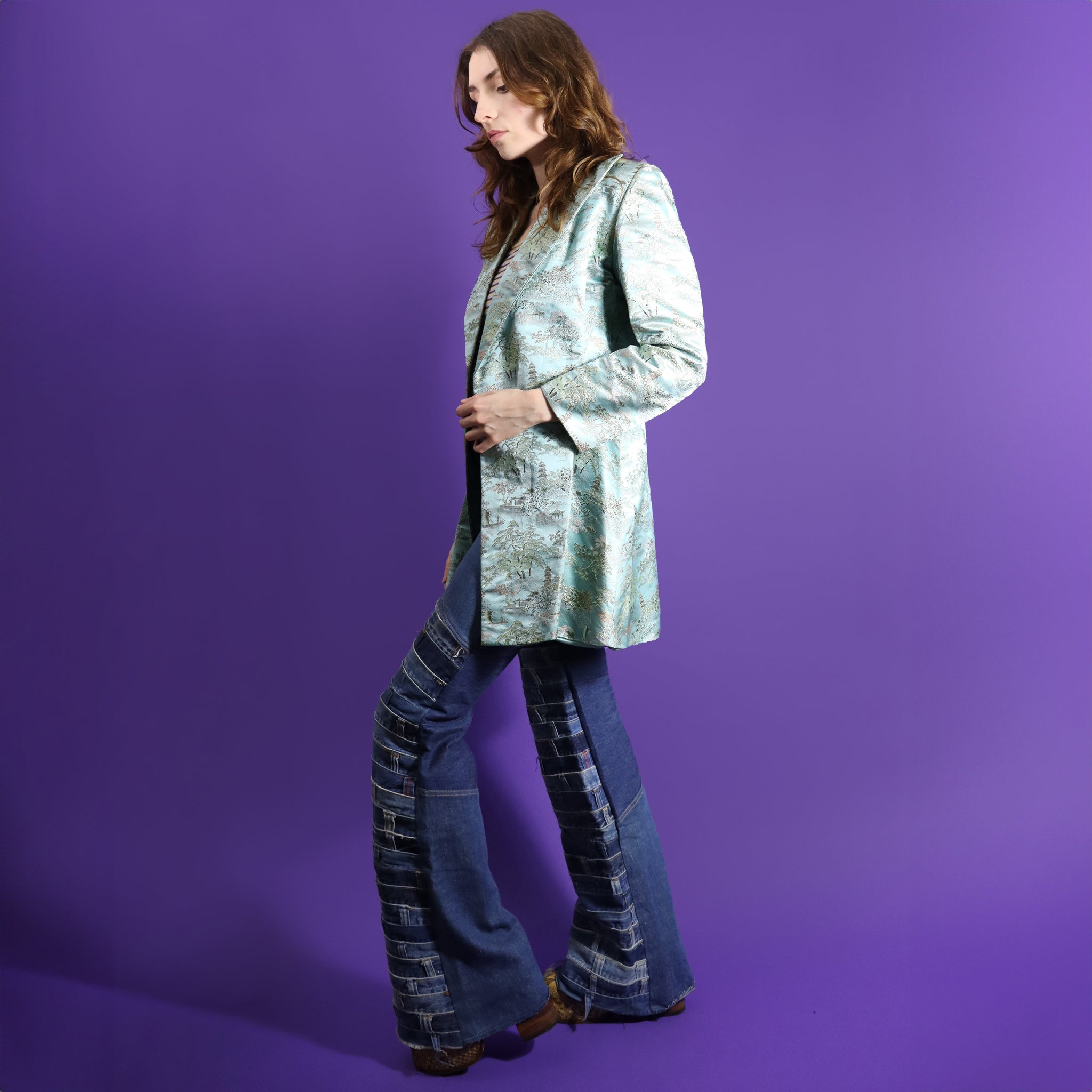 Luxurious vintage 1970s silk satin blazer. Handmade in China using high quality aqua coloured silk satin with fine embroidery. The cut is so sculptural and amazing; shoulder pads, wide lapel, structural folds and pleats, cinched waist and an open design. Ultimate glam rock piece! In immaculate, possibly unworn condition.