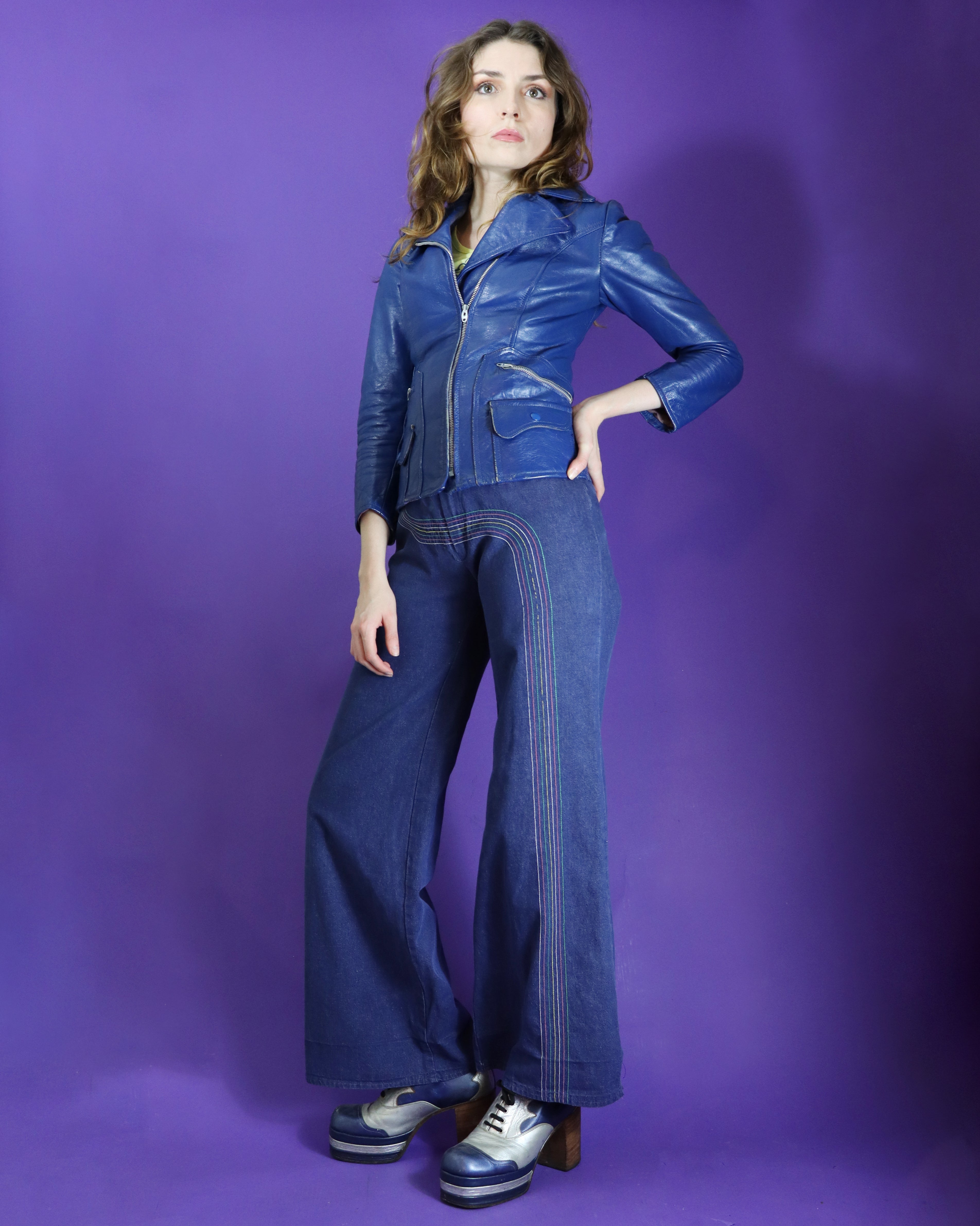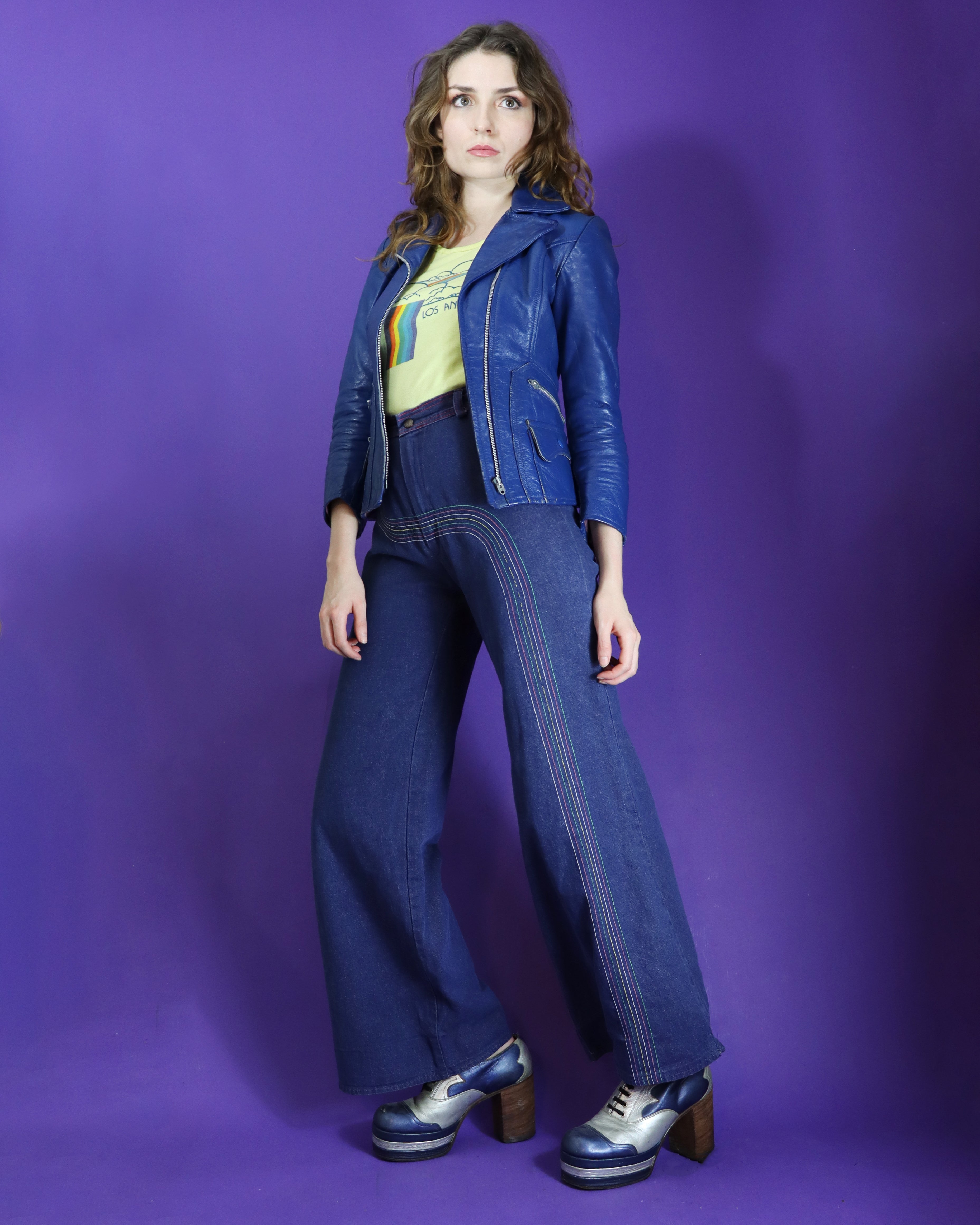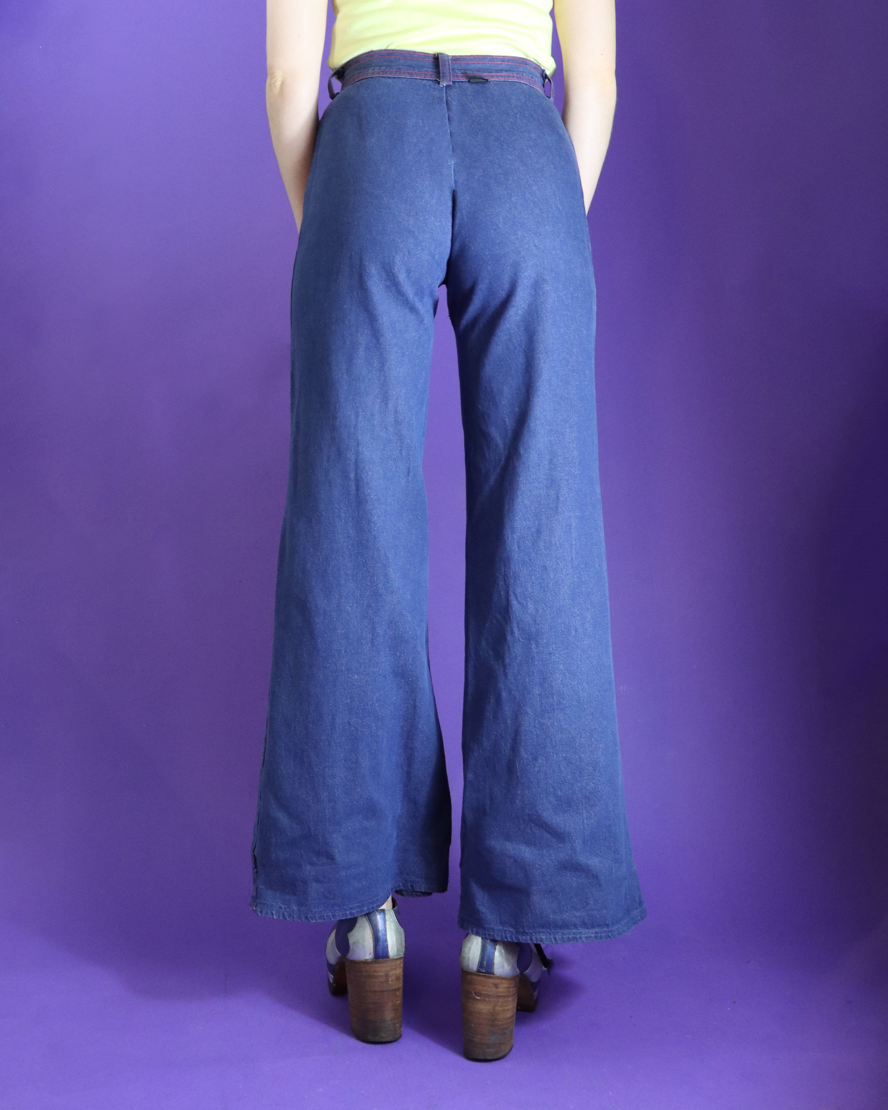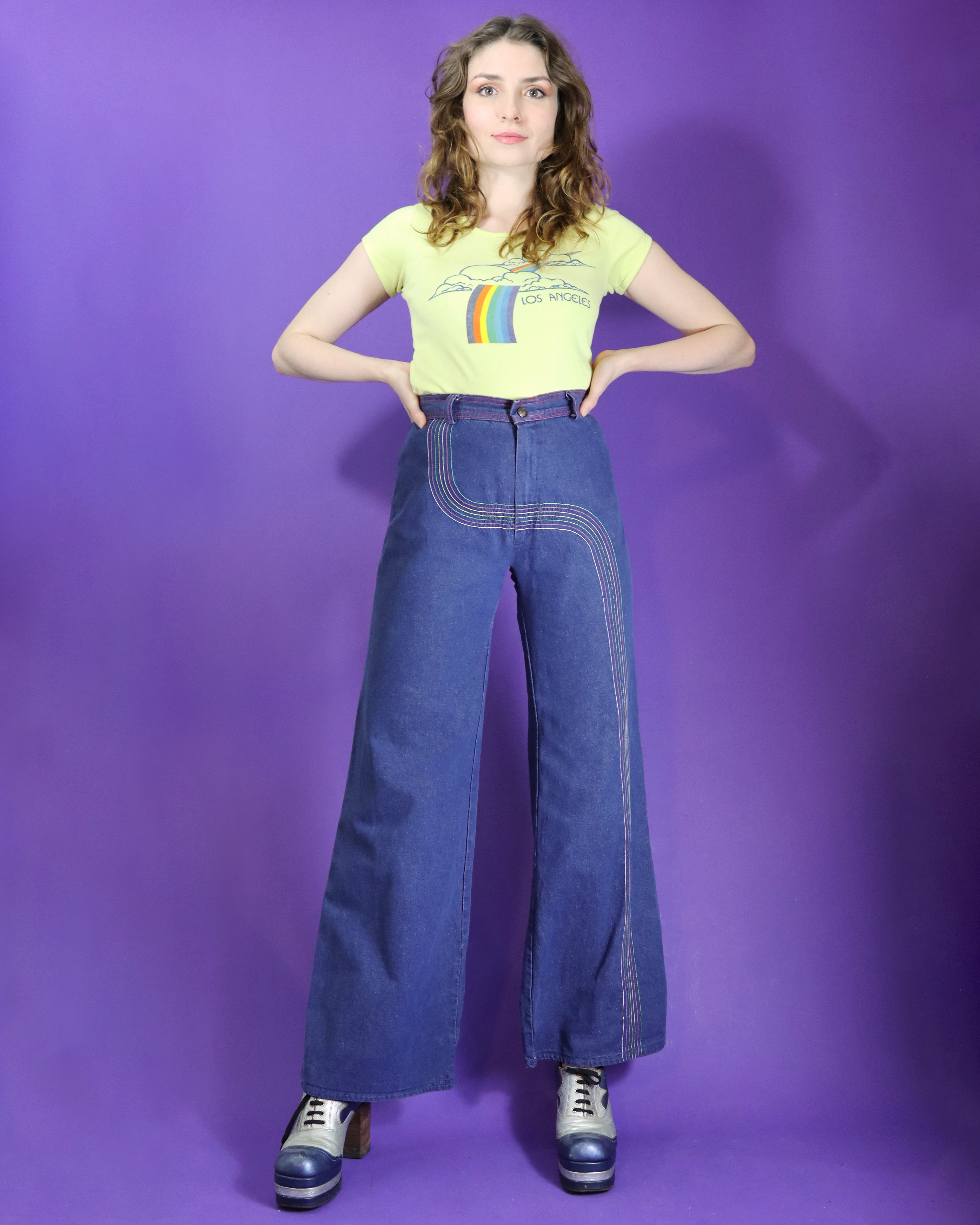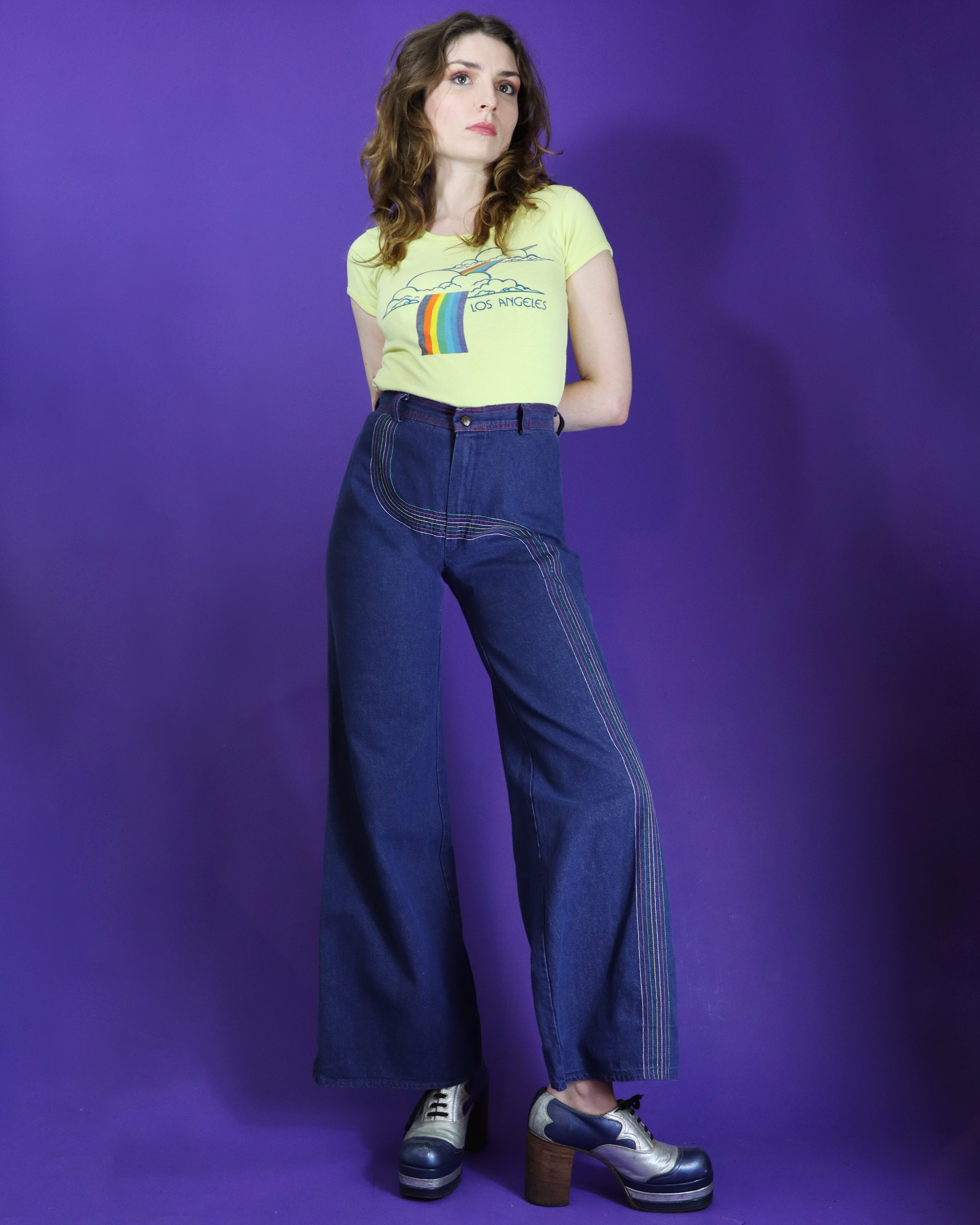 Vintage 1970s Rainbow jeans by California Market label. Indigo denim with rainbow embroidery detail wrapping around the legs. High waisted with wide leg flare. Such an iconic piece! The rainbow stitch detail elongates the leg and is so emblematic of 70s California roller girl.