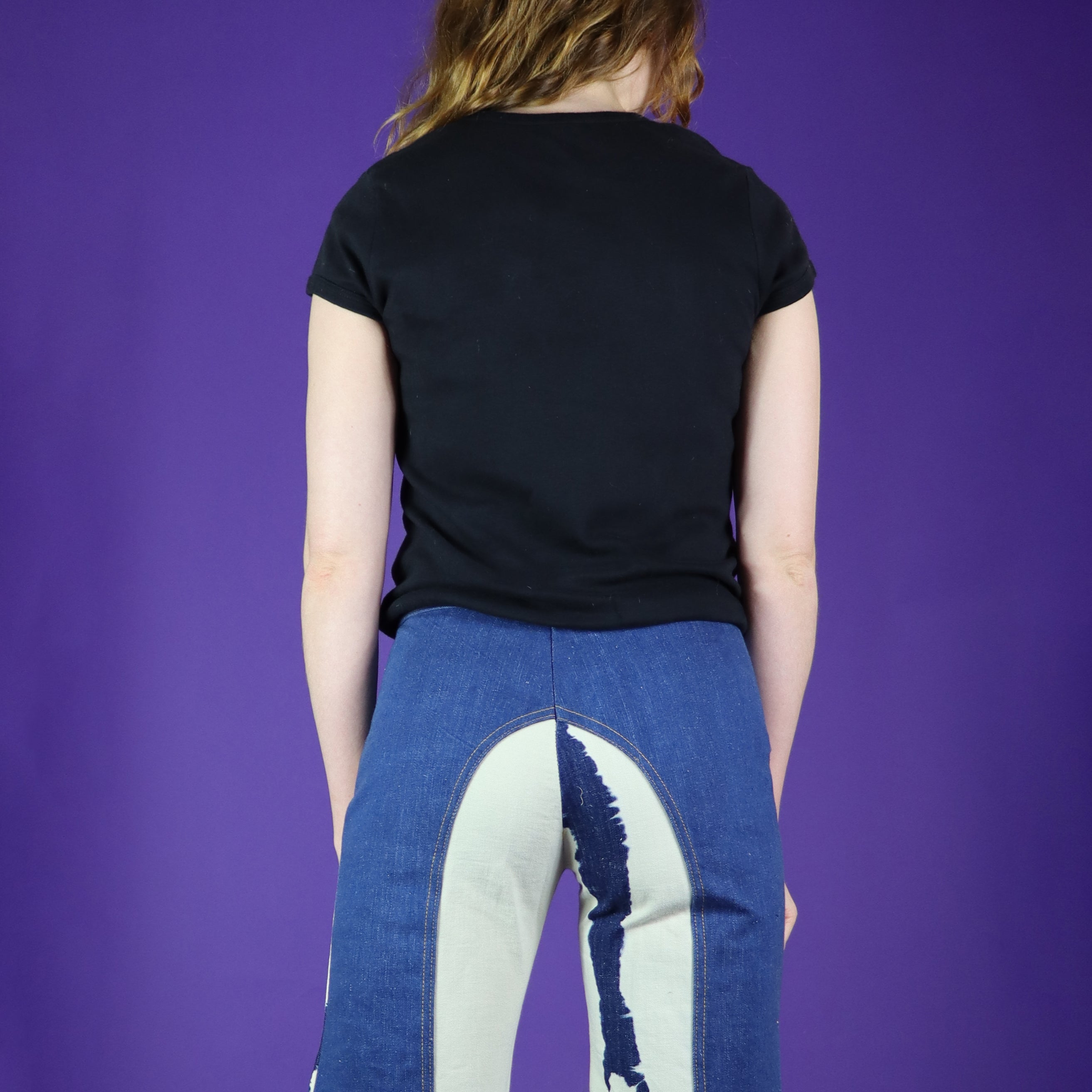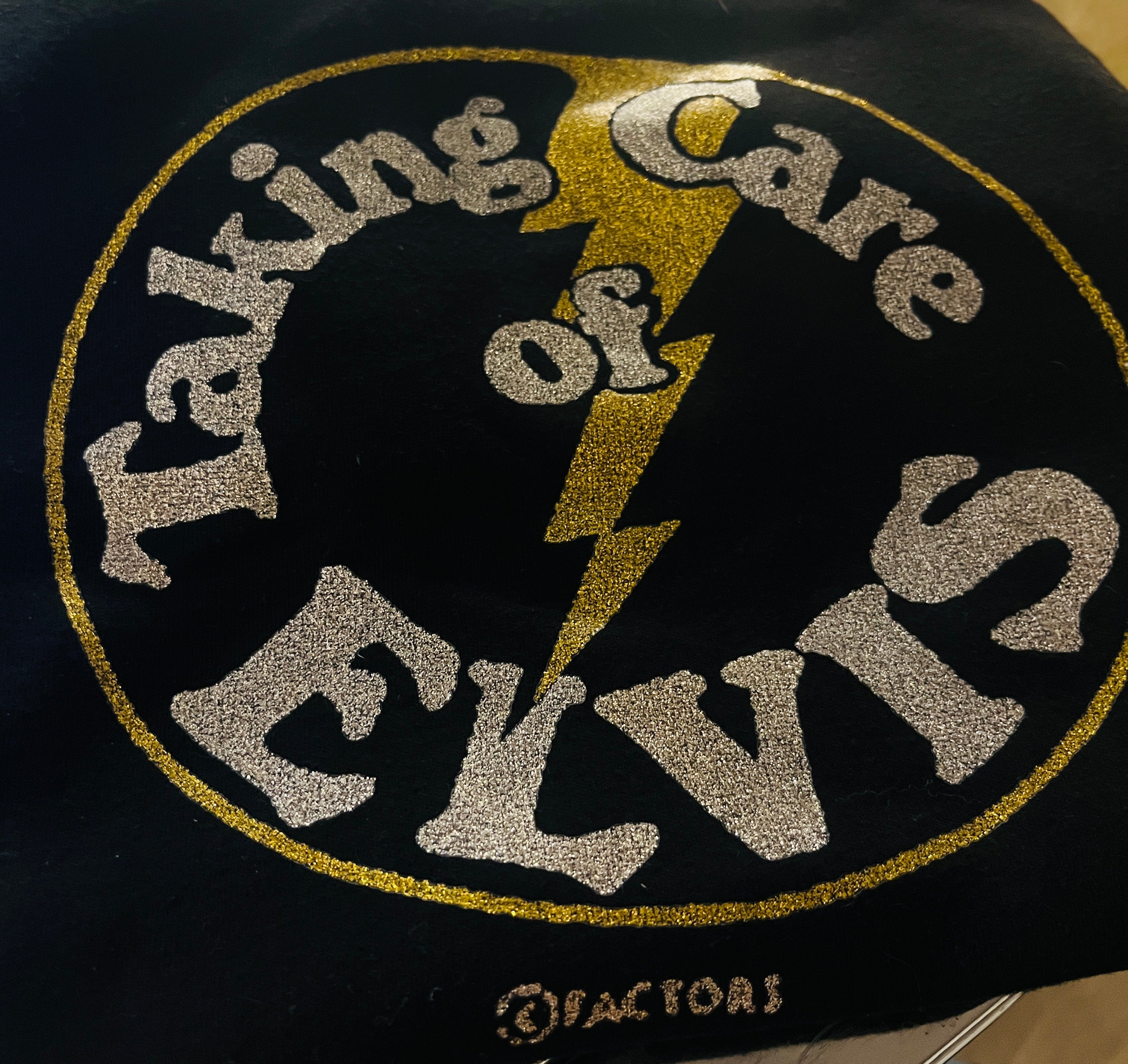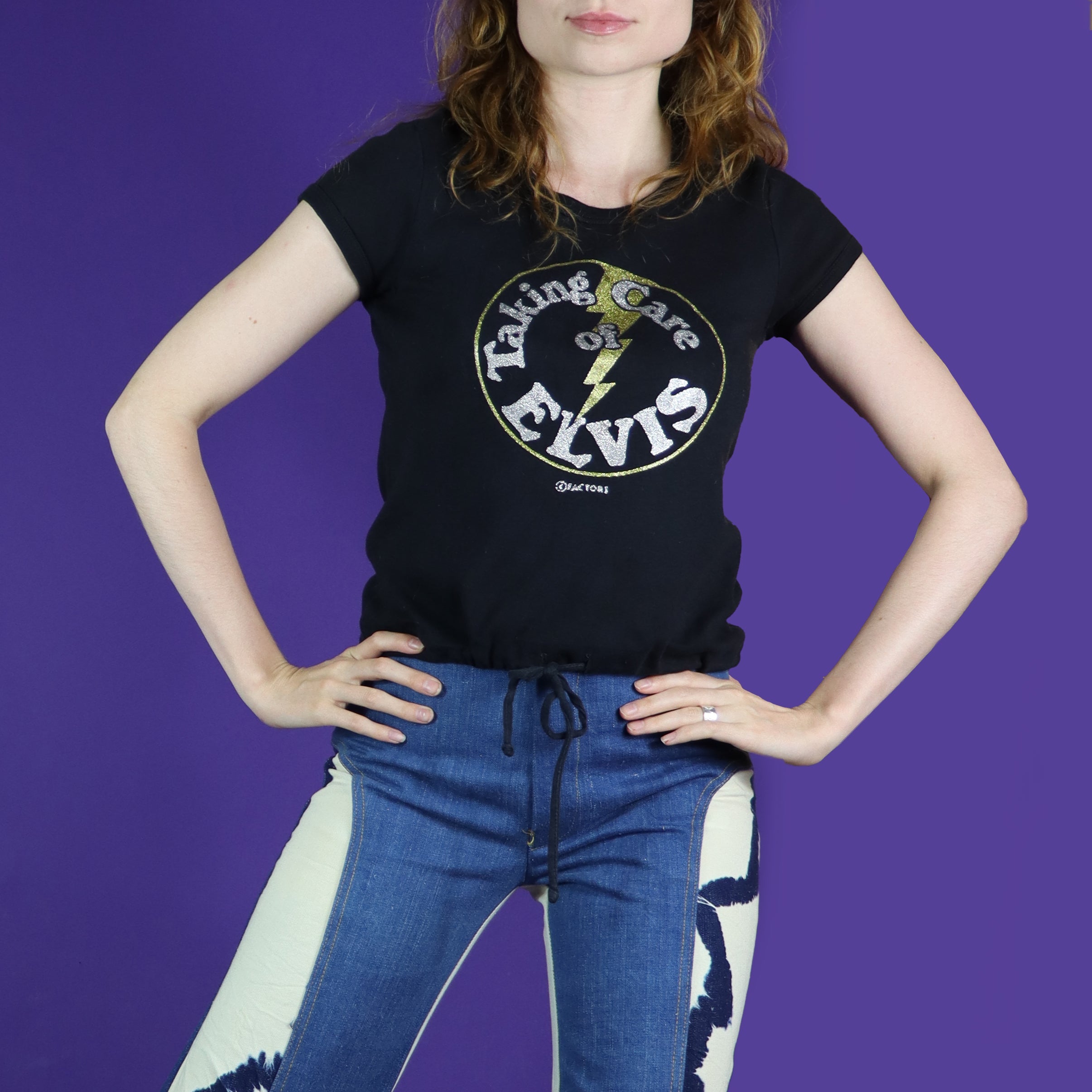 Vintage 1970s 'Taking Care of Elvis' fan t-shirt. Taking Care of Business, or TCB was Elvis Presley's mantra- he used it as an emblem, logo, band name, and more. The letters appear as a logo or emblem, along with a lightning bolt, which means 'taking care of business in a flash'. It was adjusted and adopted as a Fan Club magazine title in the 70s - 'Taking Care of Elvis'. Printed in glittery font in gold and silver on a classic black cotton t-shirt which also features a tie belt at the waist.