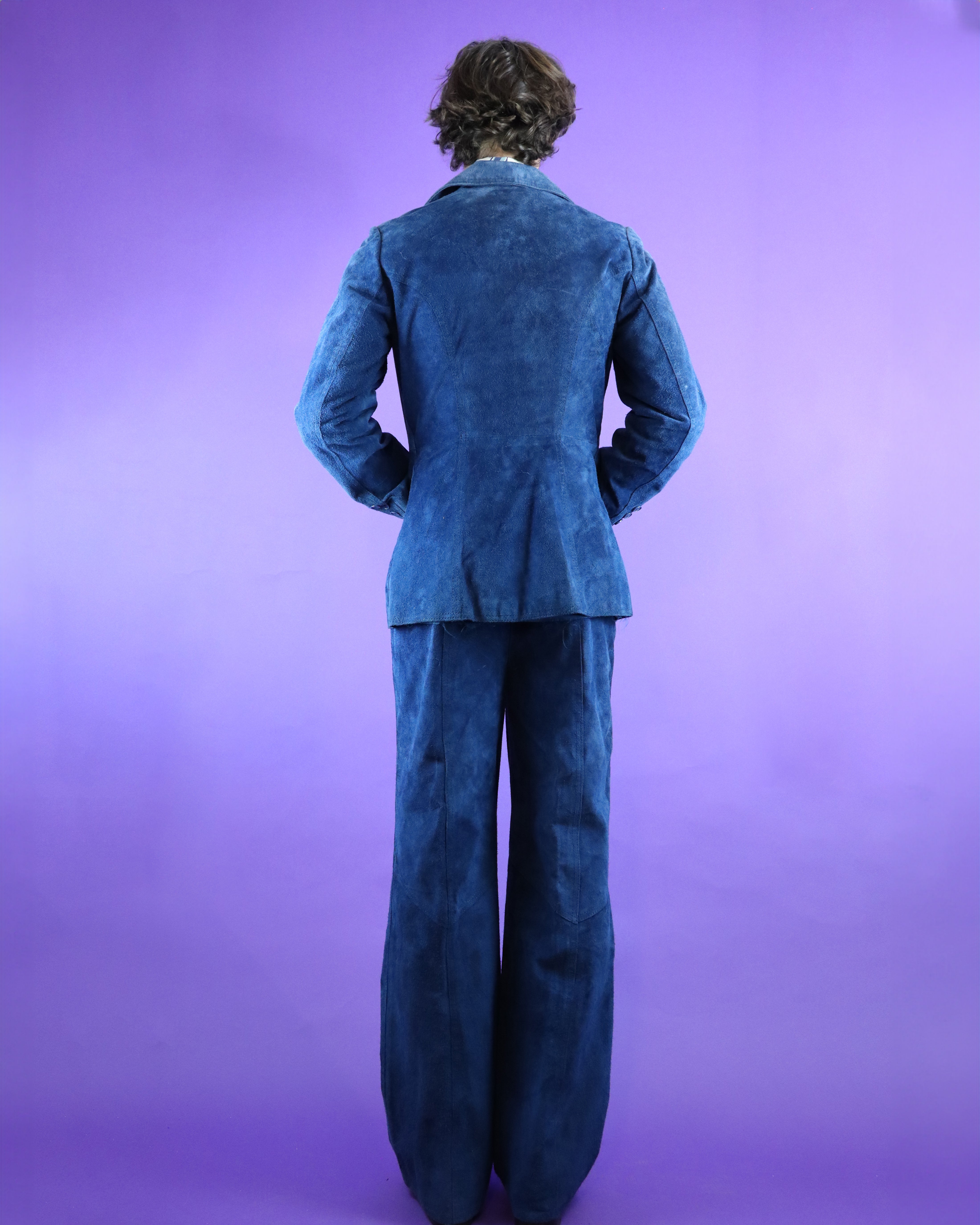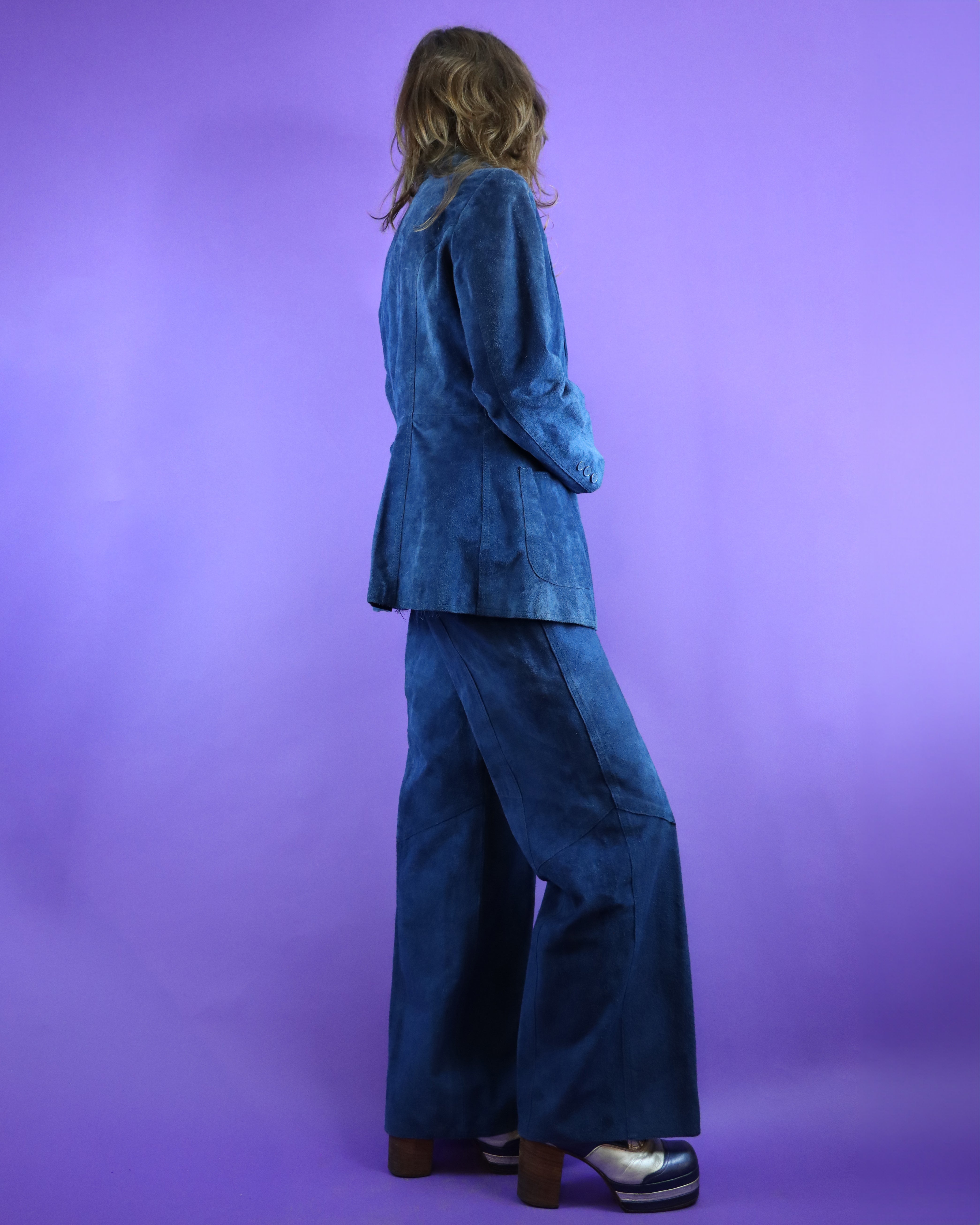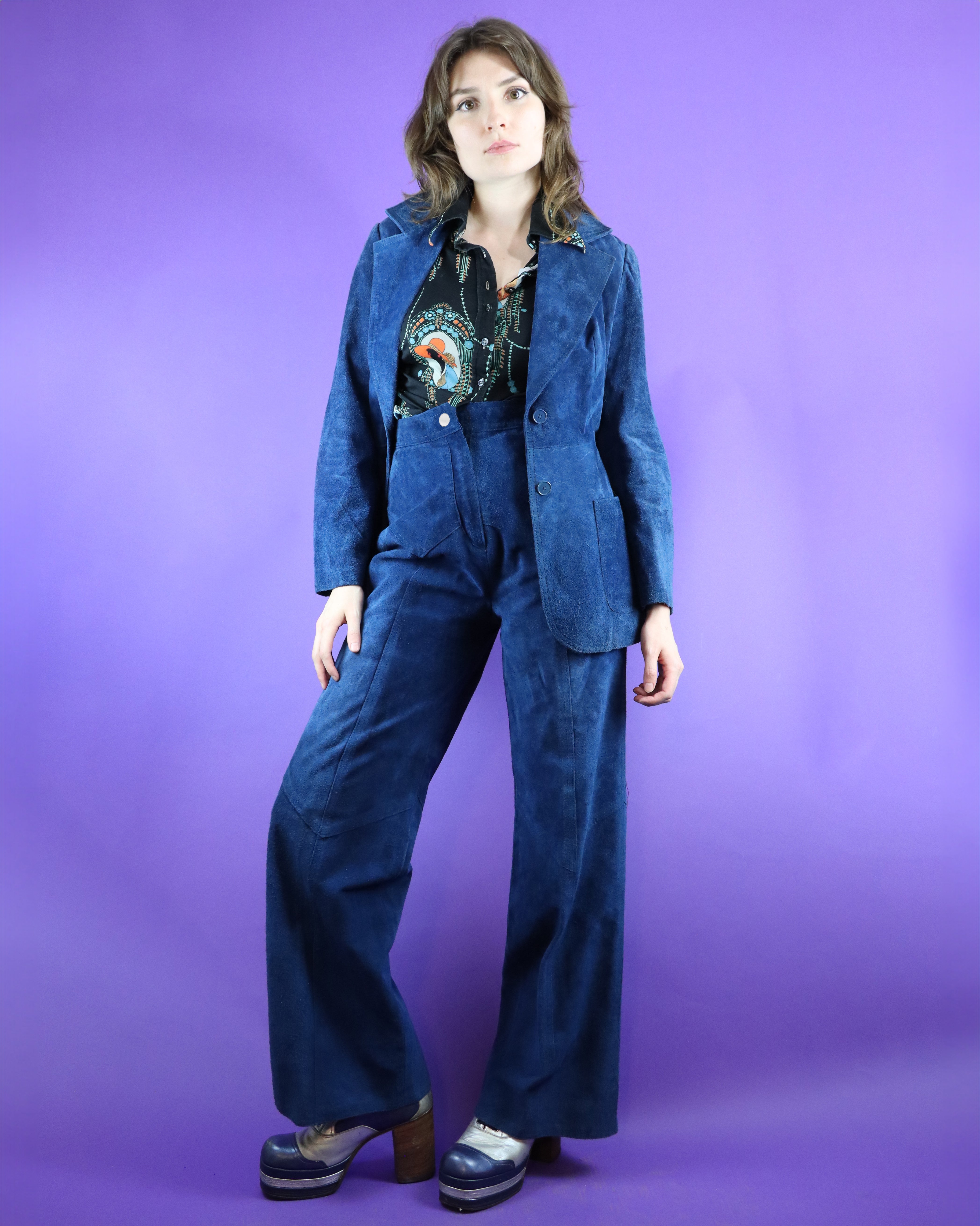 Show-stopping vintage 1970s teal blue suede suit. Made using a supple suede in a strikingly beautiful colour & cut with an equally striking wide lapelled button up blazer and high waisted wide leg flares with arrow panelling. A vintage rarity & a show stopping party piece! In impeccable condition too. So unusual to find a suede set in this colour!