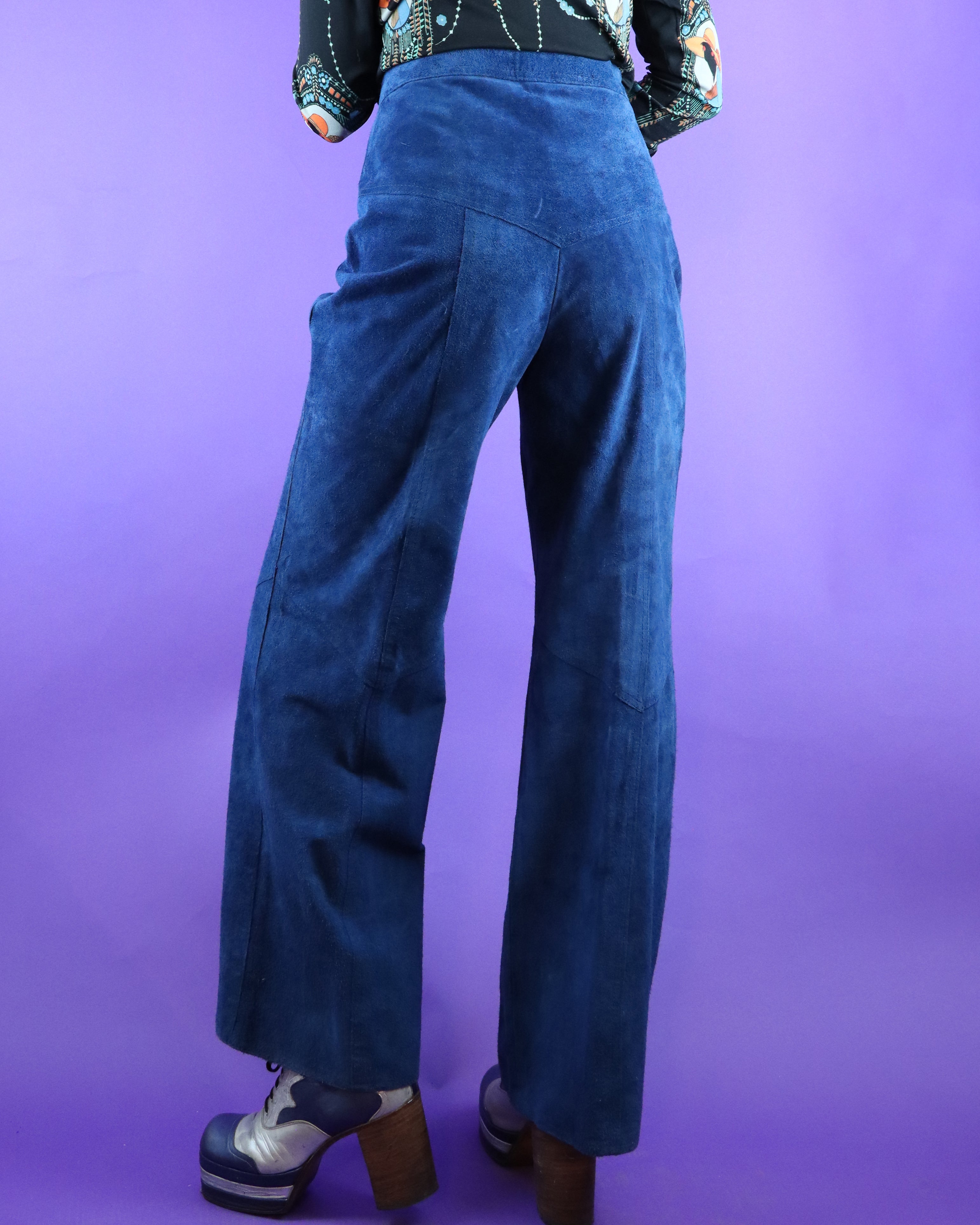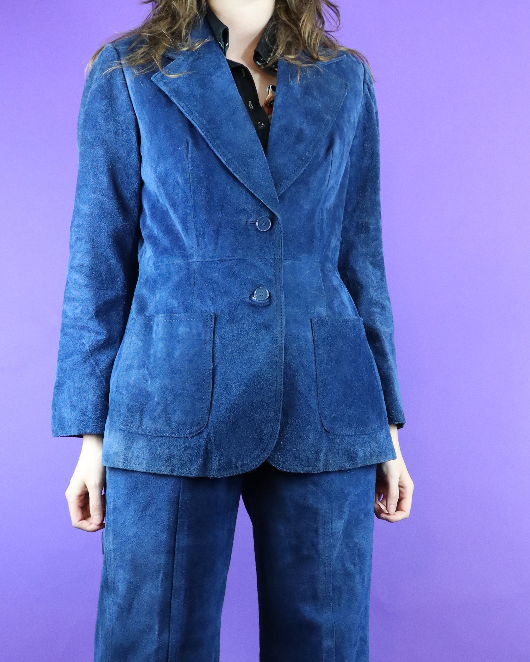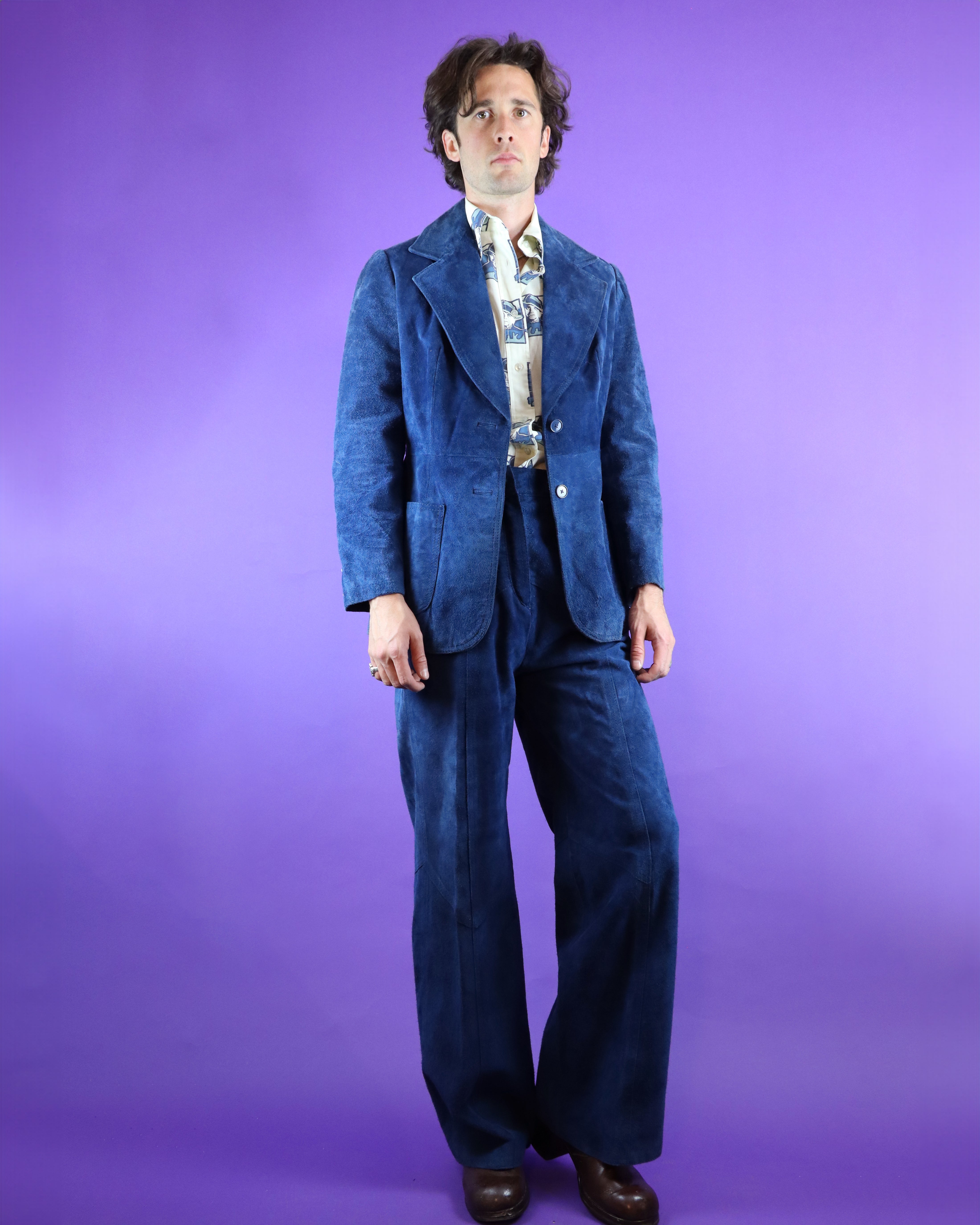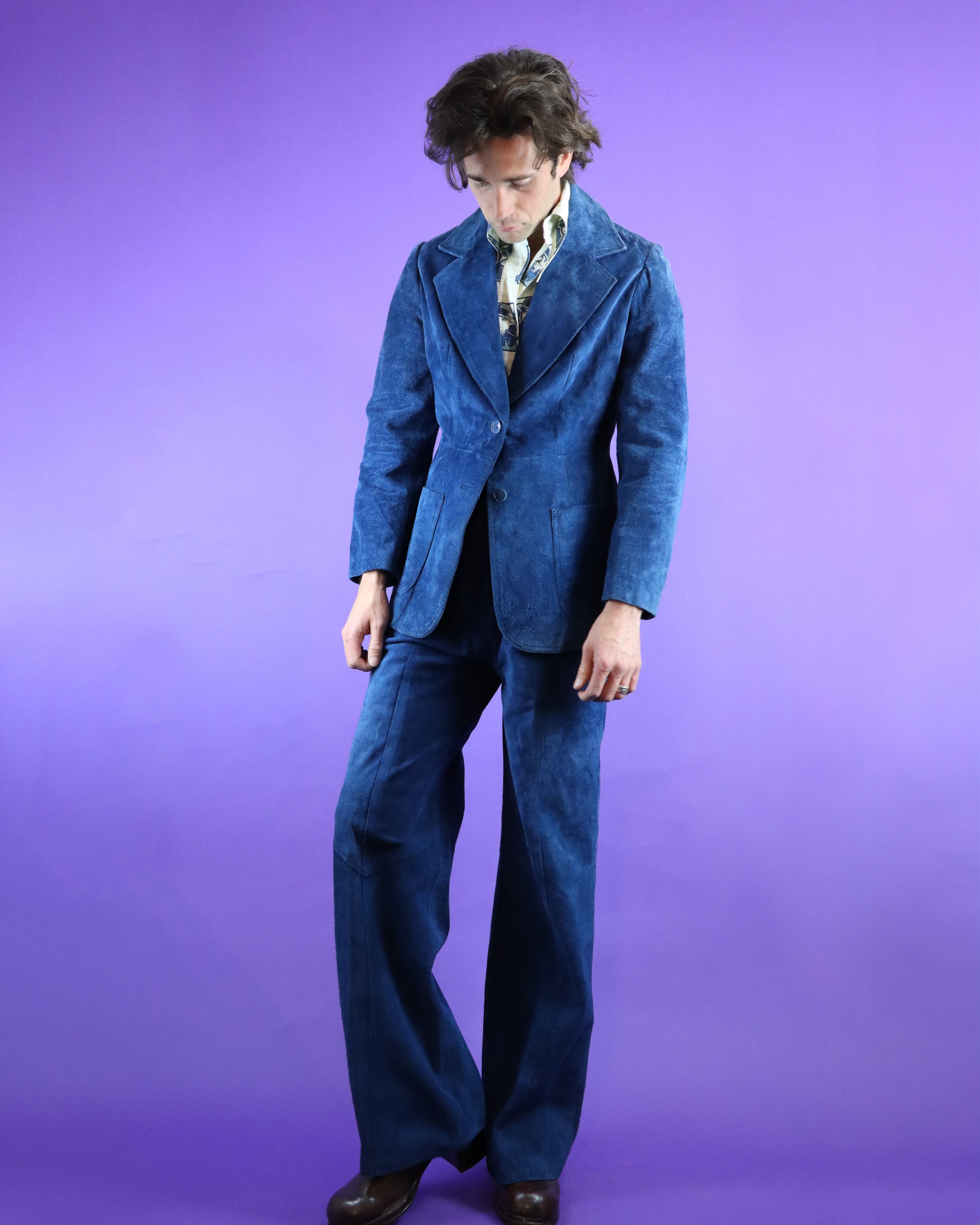 Show-stopping vintage 1970s teal blue suede suit. Made using a supple suede in a strikingly beautiful colour & cut with an equally striking wide lapelled button up blazer and high waisted wide leg flares with arrow panelling. A vintage rarity & a show stopping party piece! In impeccable condition too. So unusual to find a suede set in this colour!