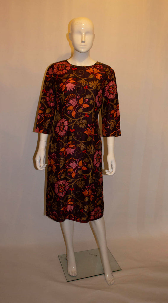 A wonderful silk dress by Bernard Freres , London and Paris, in a Liberty print. The dress has a brown background , with a pink and orange design . It has a round neckline , elbow length sleaves and is fully lined. Measurements: Bust up to 40'', length 42''