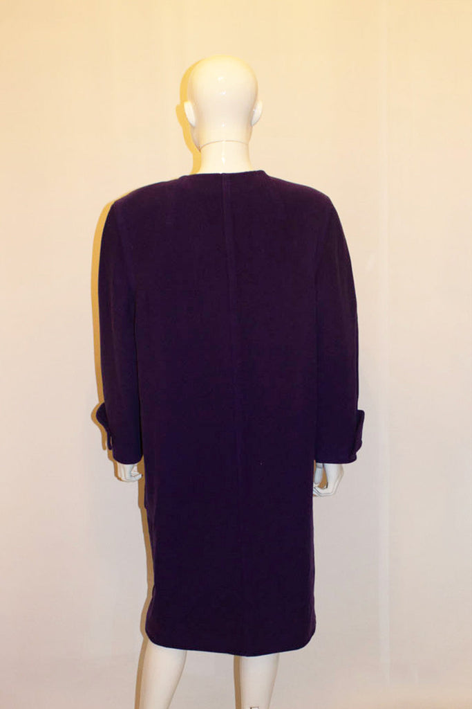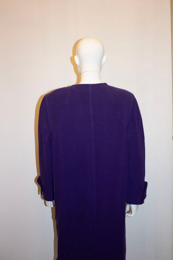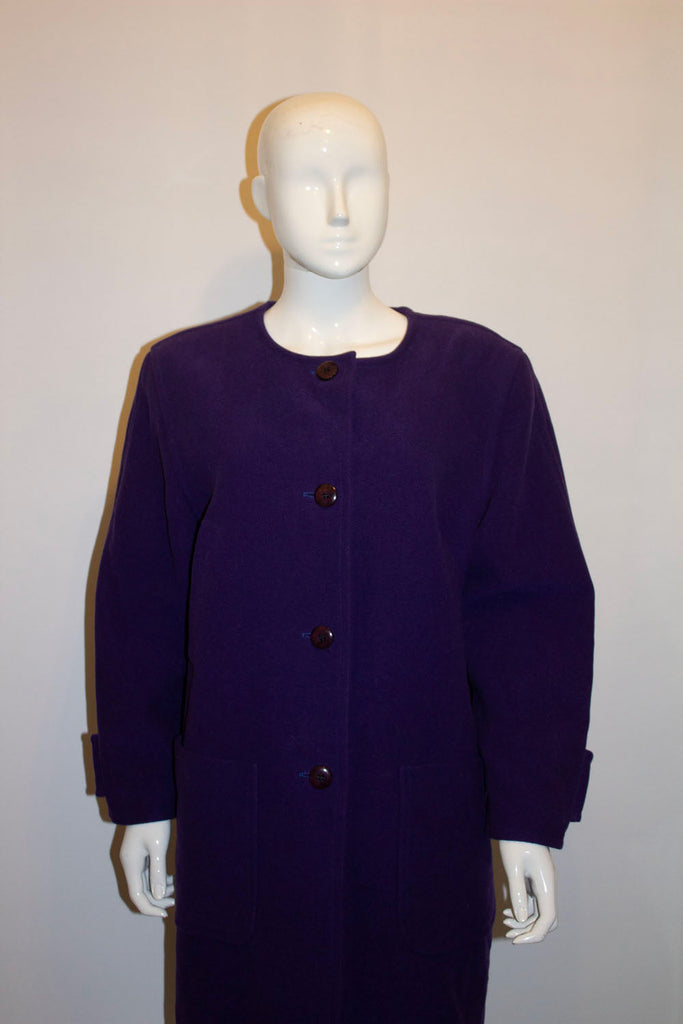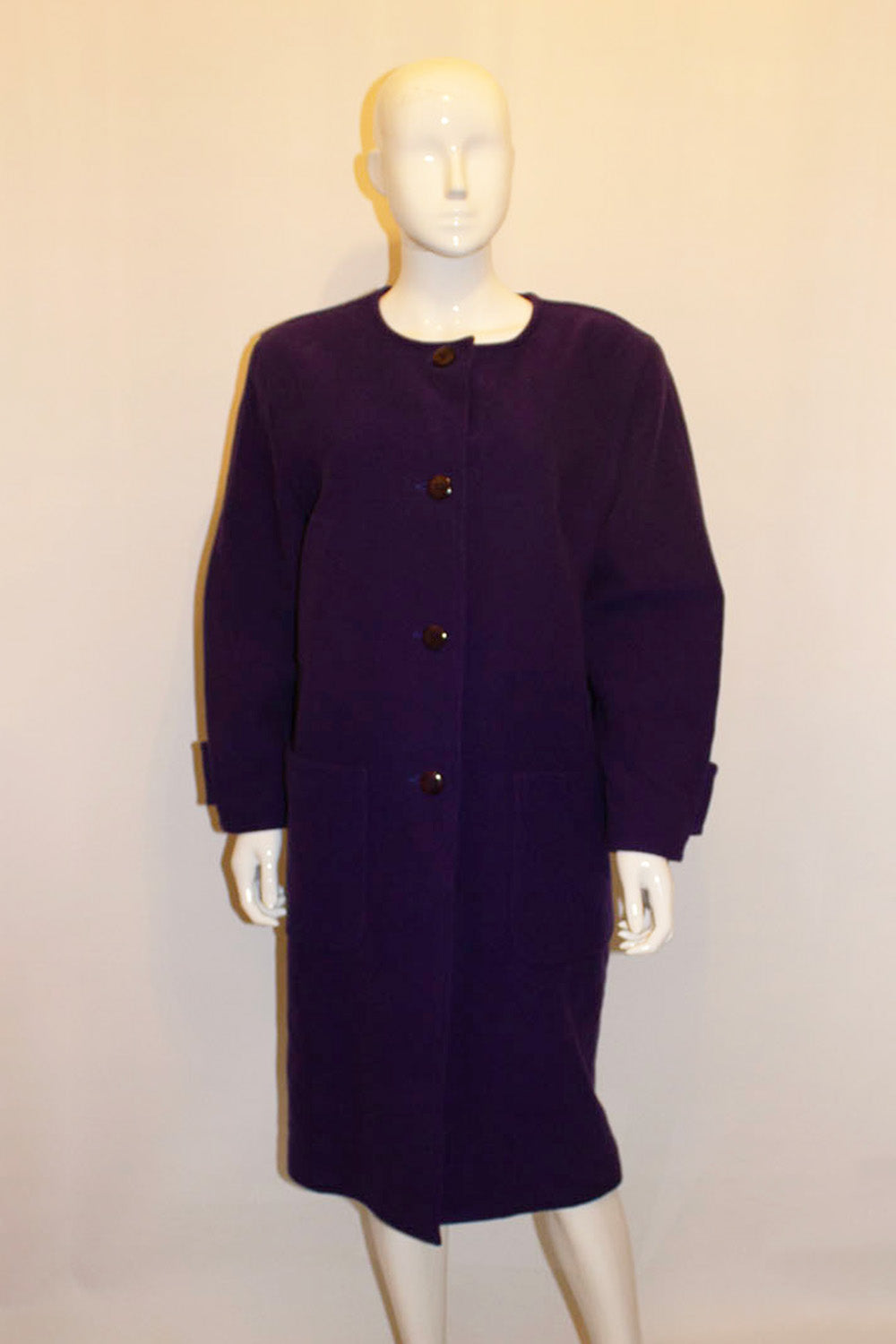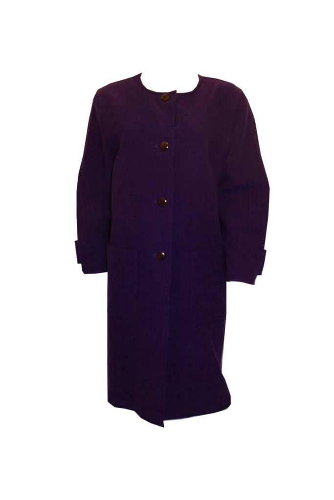 A wonderful and warm vintage coat by Courreges. The coat is in a vibrant purple colour , and is collarless with a button front opening. It is fully lined, and has two top pockets and two lower patch pockets. Size 40. Measurements: Bust up to 44'', length 43''