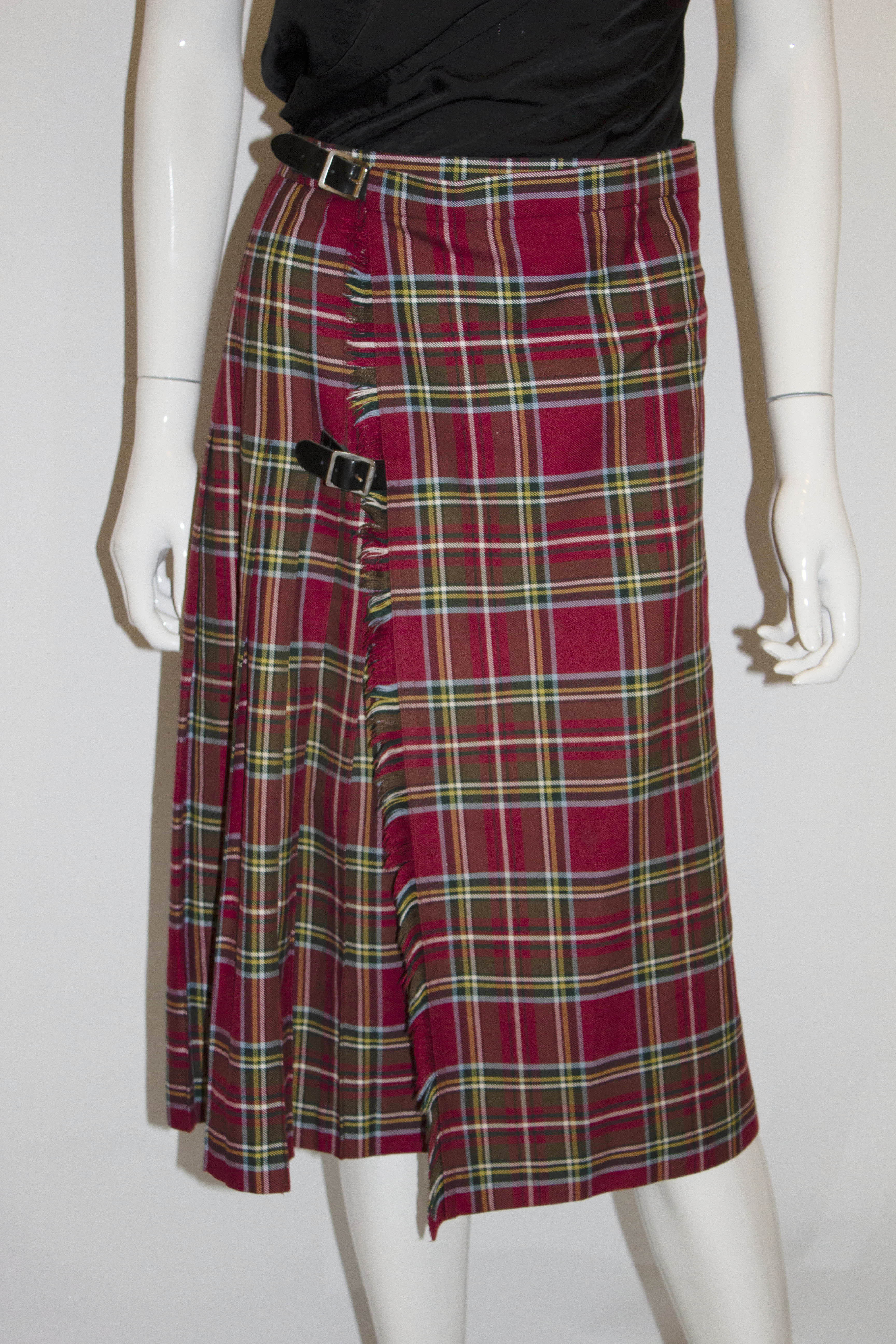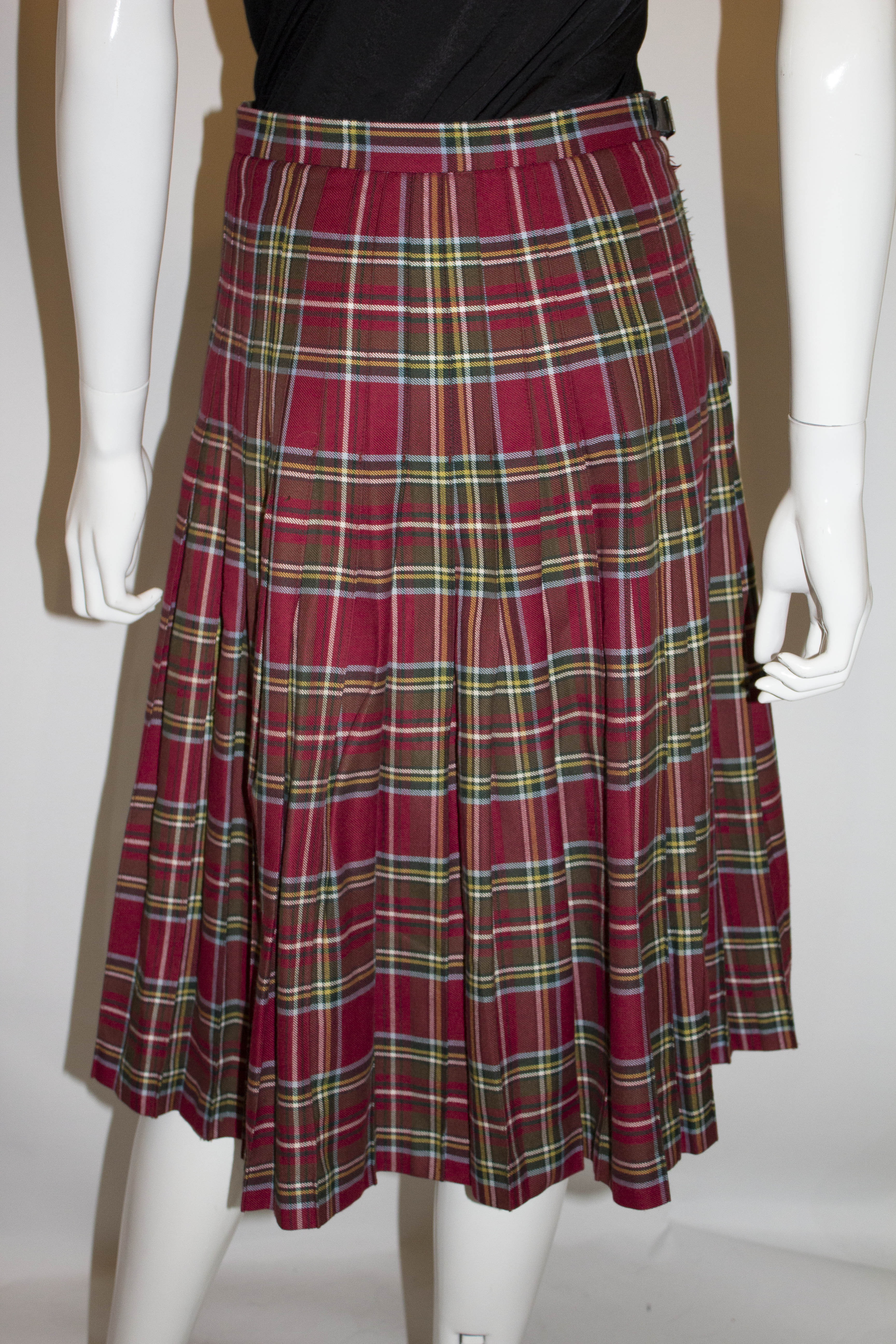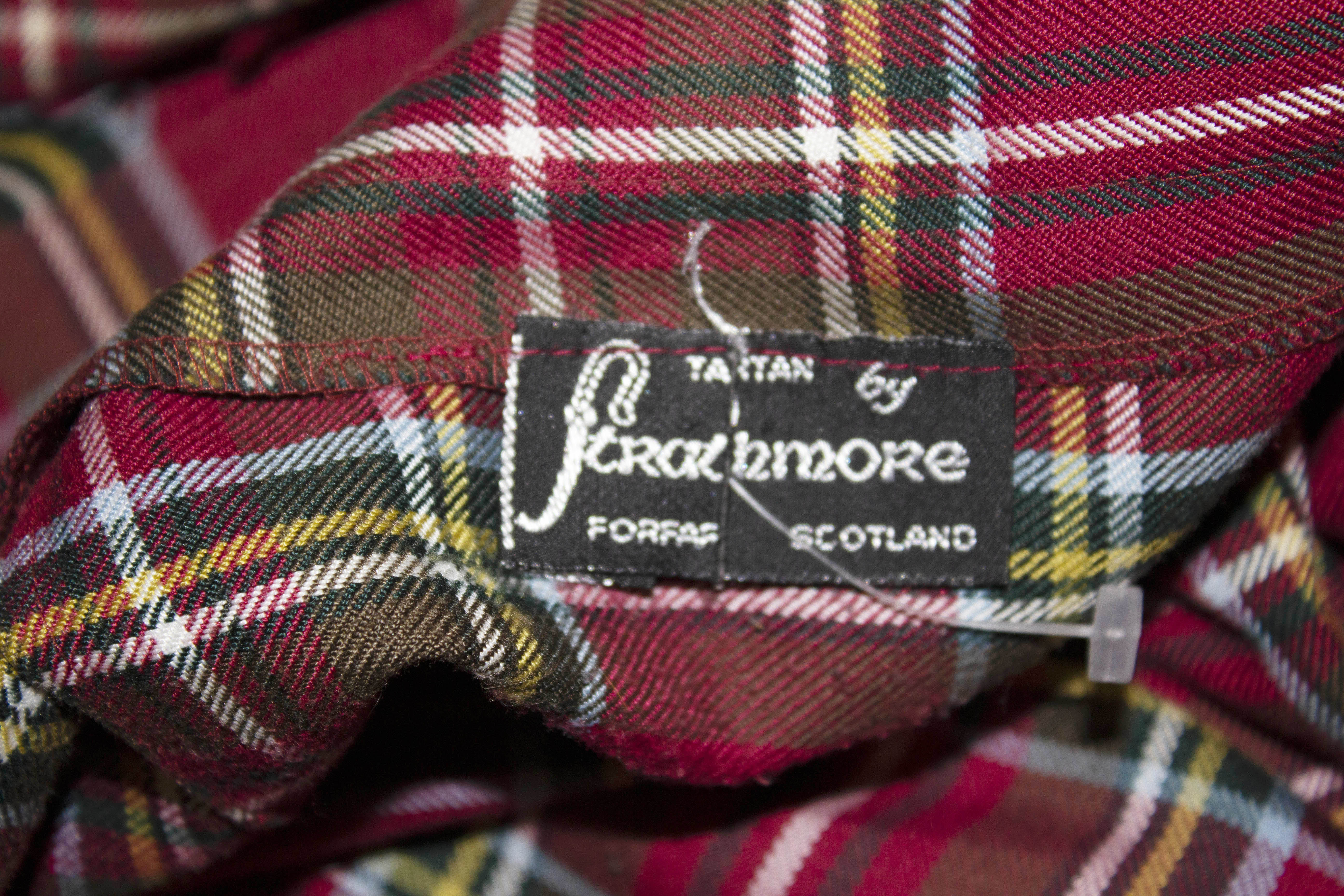 A lovely vintage kilt for Fall by Strathmore of Forfar Scotland. The kilt has a red background , with a yellow, green and pale blue stripe. It has sewn down pleats from the waistband and wraps over. It is unlined.