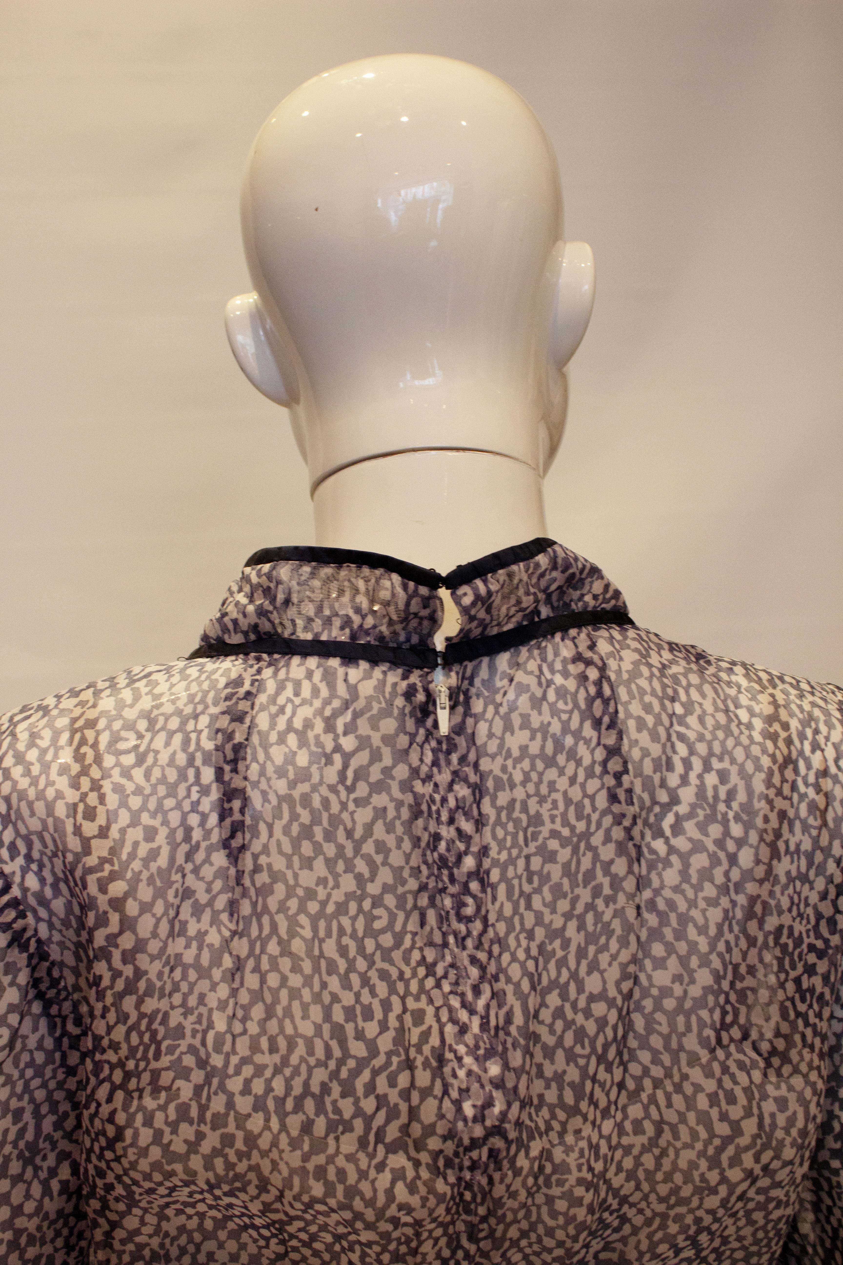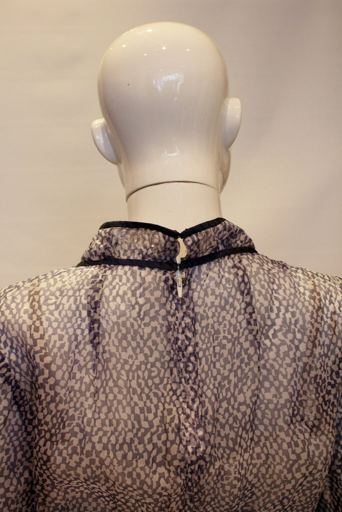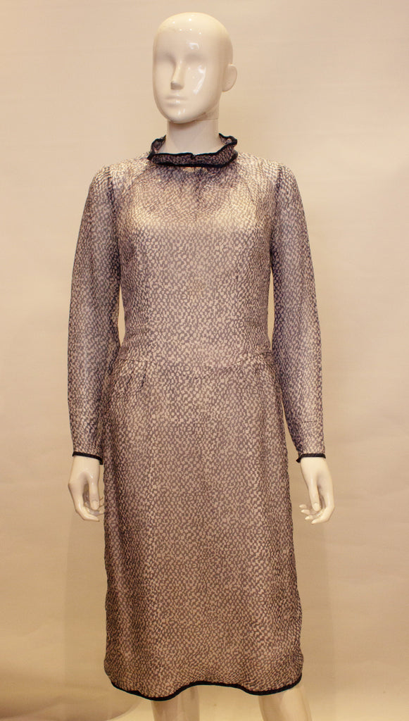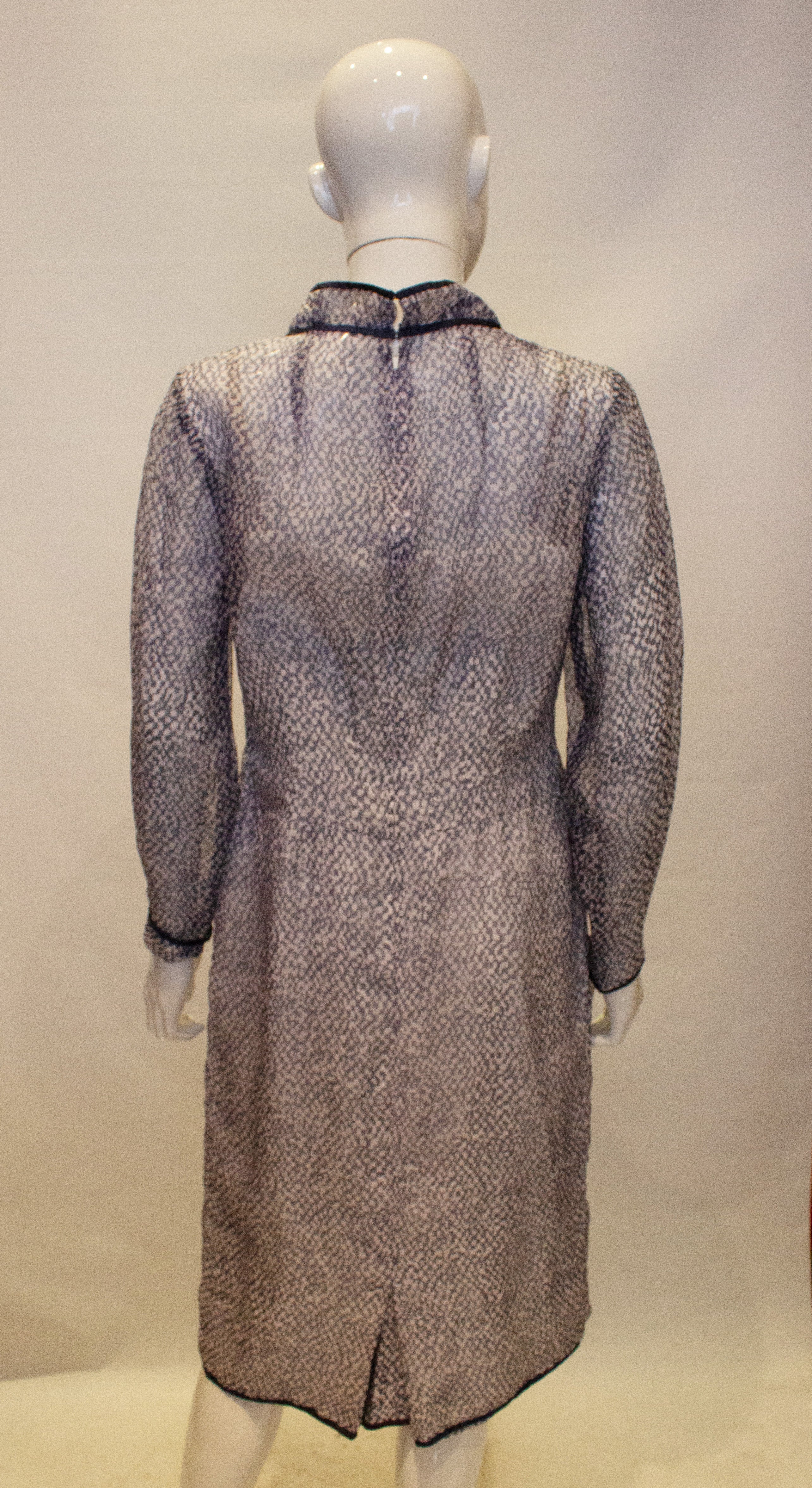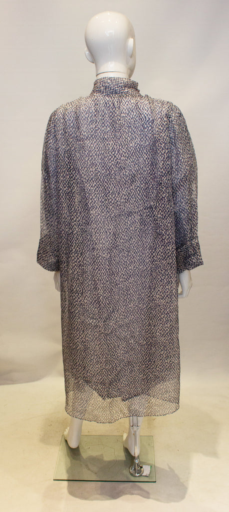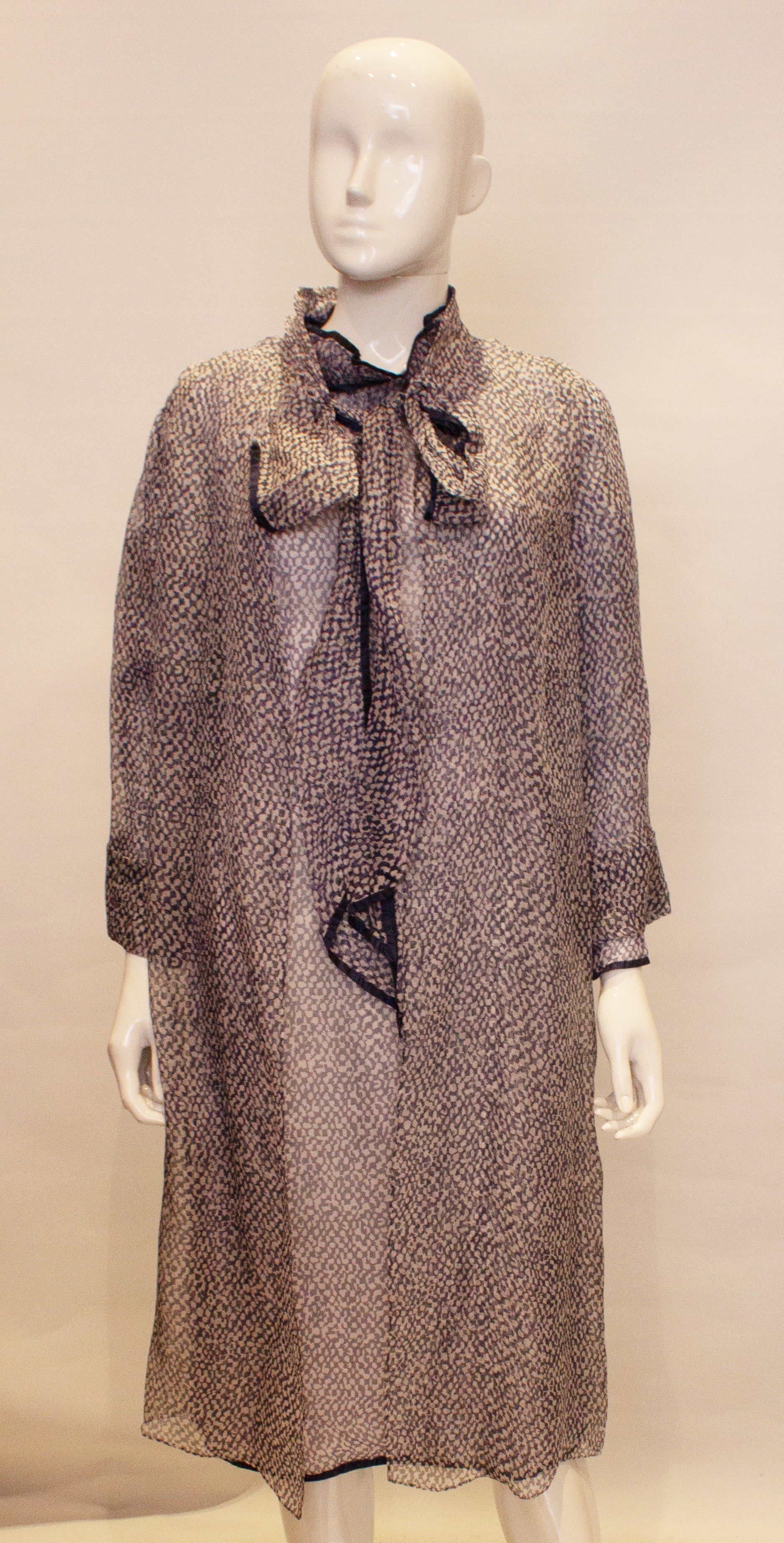 A stunning vintage silk chiffon dress and matching coat by La Chasse. In a pretty blue and white print, the dress has a frill at the neckline with ribbon trim, and is fully lined with a central back zip . The matching coat ties at the neck and has elbow length sleaves.