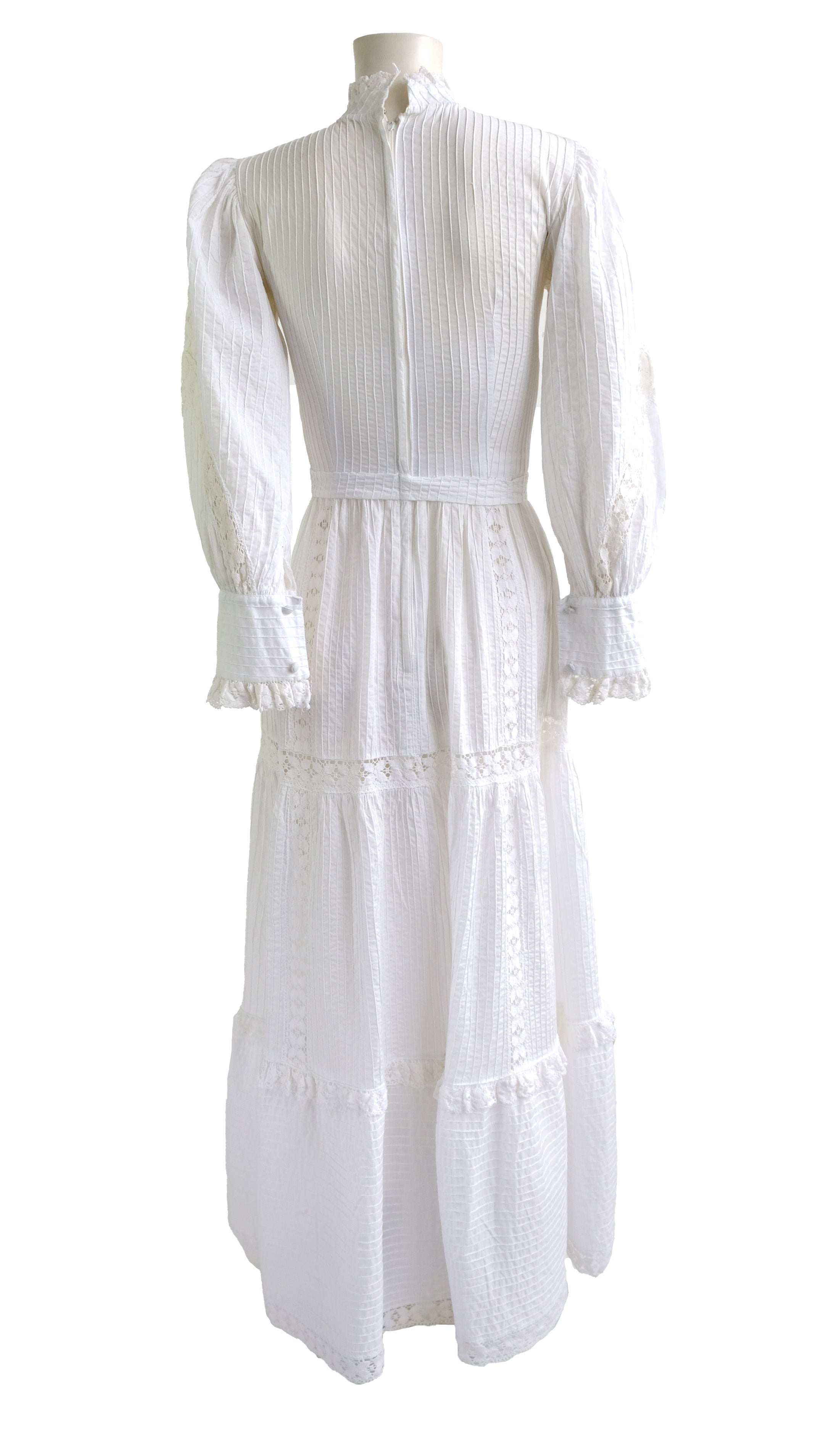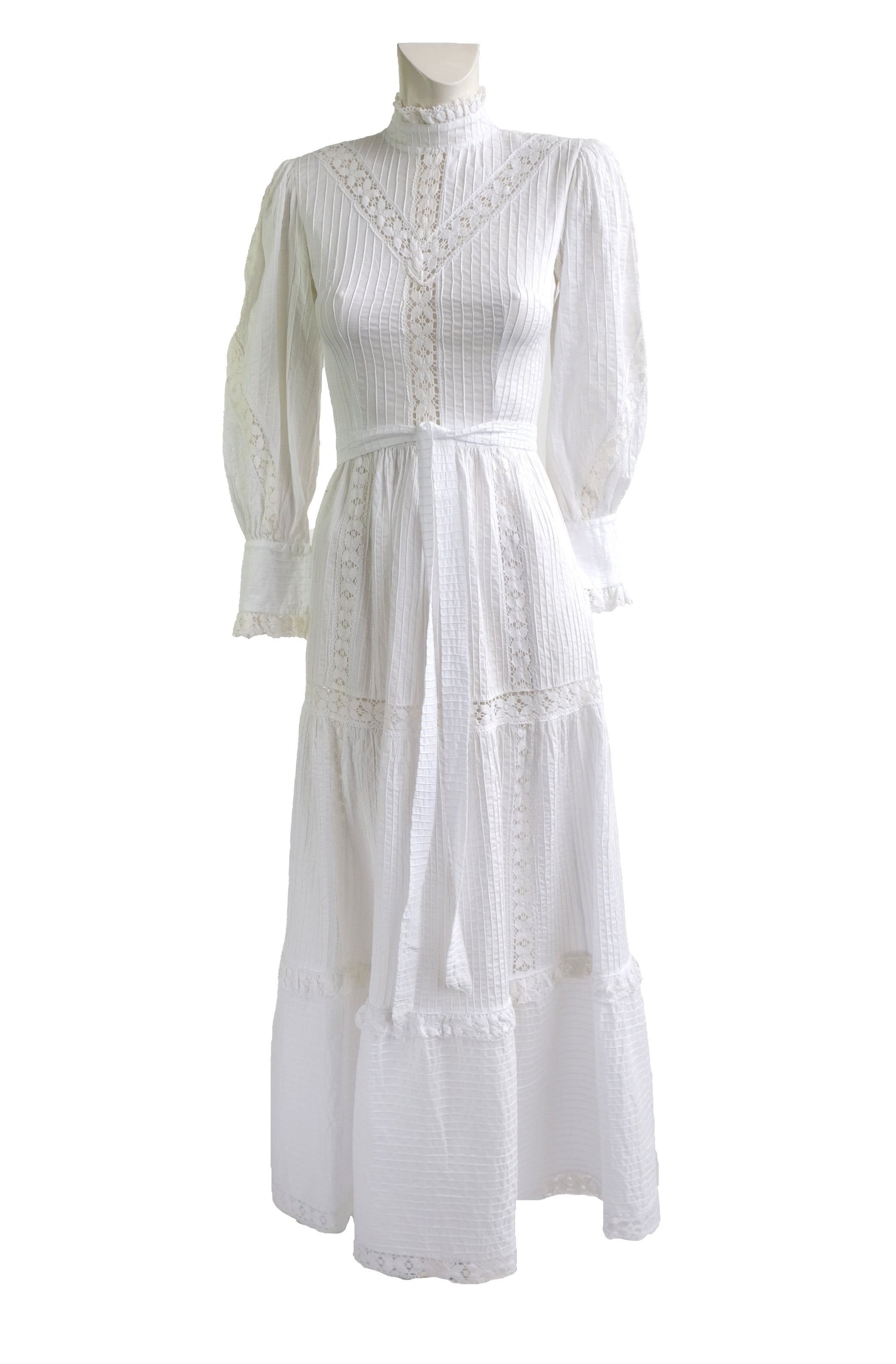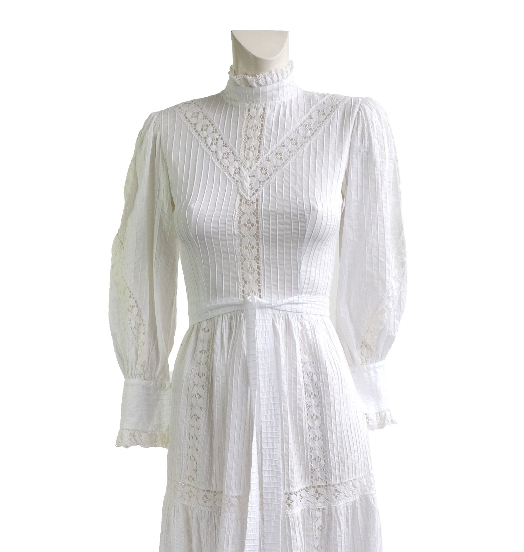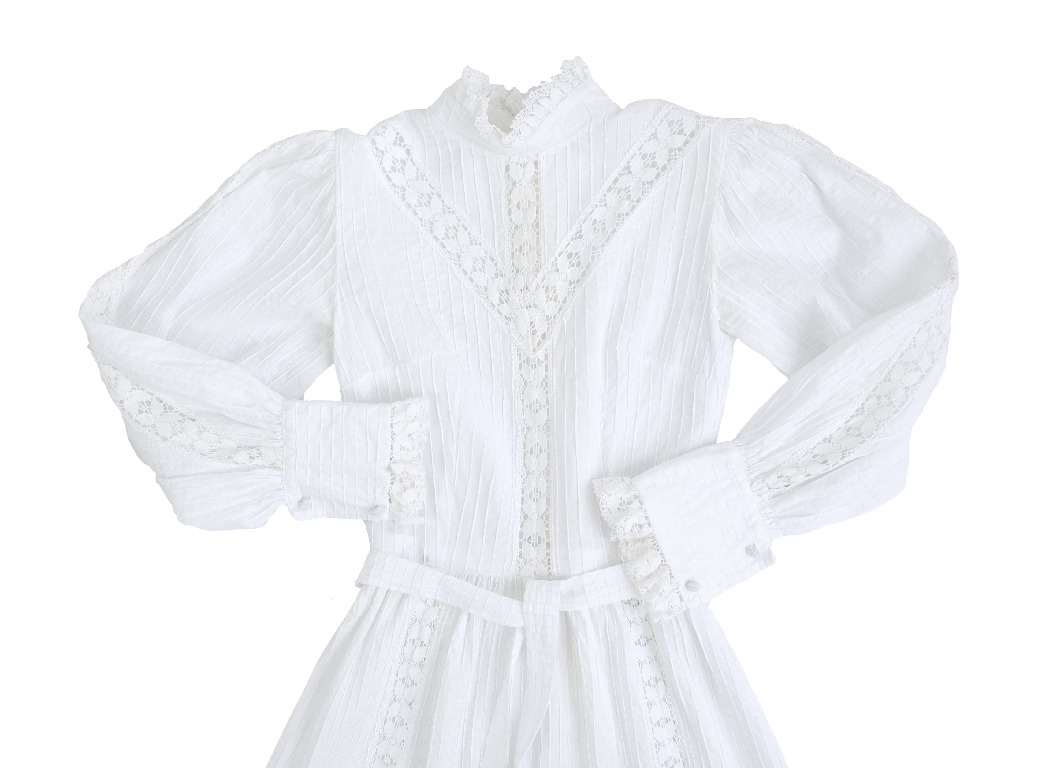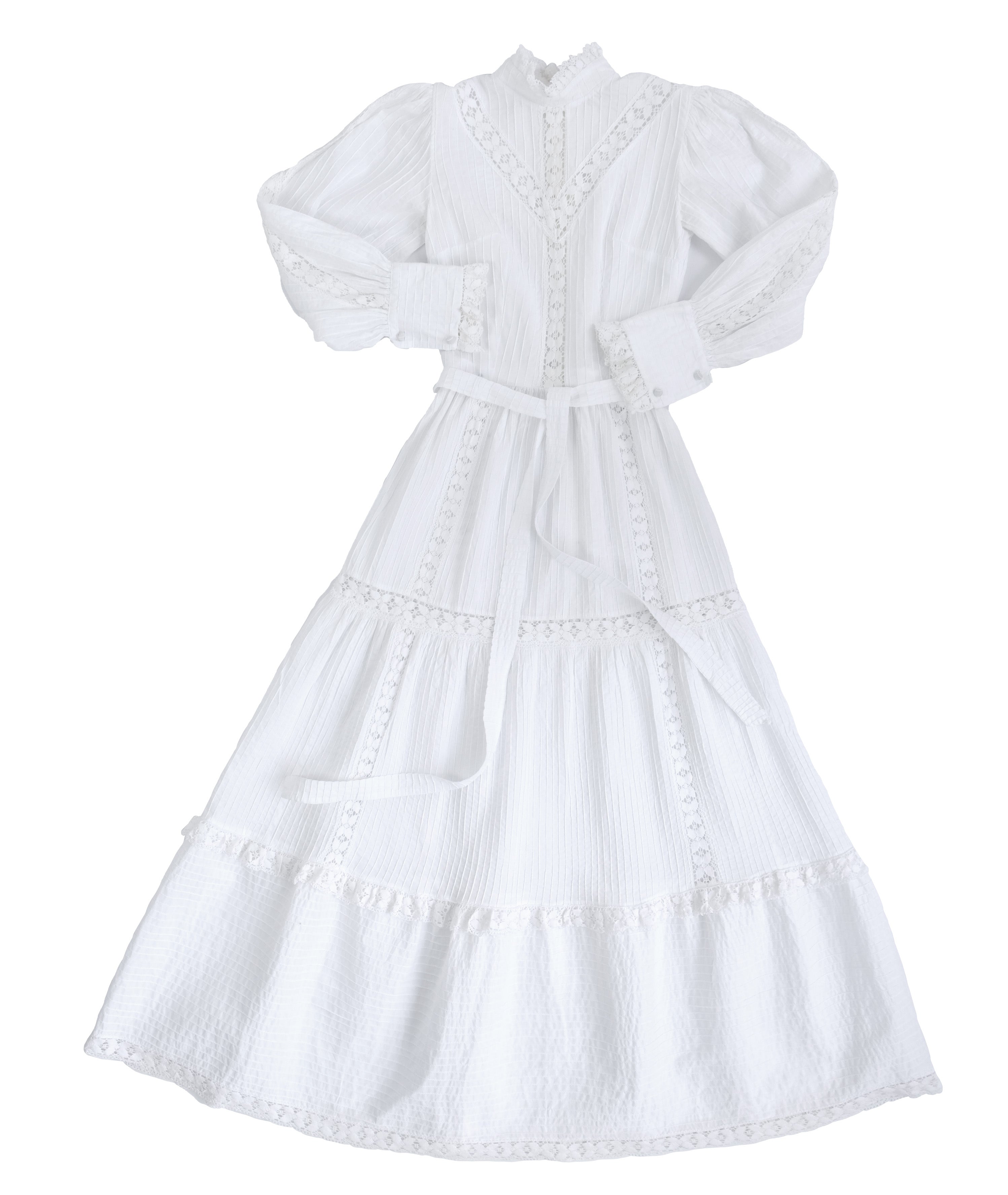 Made of wonderful, unbleached, crisp white cotton, the dress has a high neck edged with crochet lace, on a fitted bodice with pin tuck panel and lace inserts. Wide puff sleeves with crochet lace inserts and buttoned cuffs.