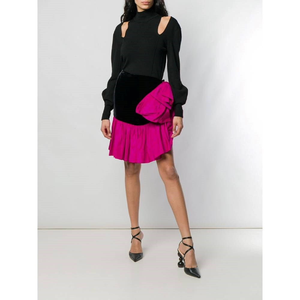 Yves Saint Laurent black velvet 80s skirt. Fuchsia contrast flounce. Side closure with hooks.