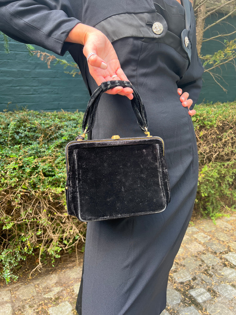 A very fine black Soprarizzo velvet and brass hardware bag circa late 1940s to early 1950s. With exquisite craftsmanship and materials, it was almost certainly made in Venice and is possibly a very early example by Roberto di Camerino or Cesare Puccini; the bag is without a maker's mark. It is debossed with an intricate pattern that recalls the stained glass windows of grand churches. It features a large flap pocket on the outside, which closes with an intricate brass and black leather pull clasp. The black top handle is crafted from strands of black velvet, held together with a wider velvet band with thick black braided stitches. Detailed with intricate brass hardware, it locks at the top and the unusual arrow-shaped key is tied to the handle. Lined with burgundy leather, it has a zip pocket and slip pocket inside. In very good vintage condition overall, minor wear to some of the edges and corners of the front flap pocket noted; very small hole to interior leather on flap, some light surface scratches to interior burgundy leather.