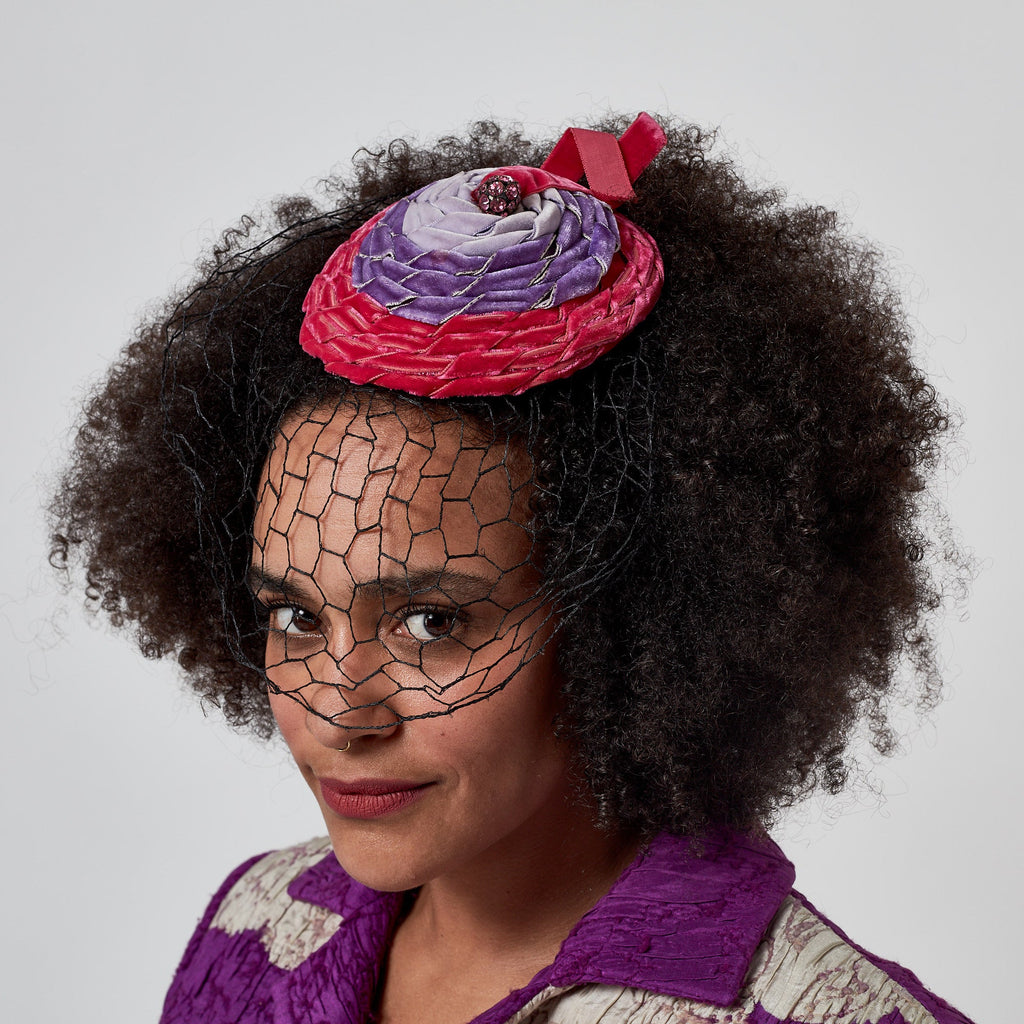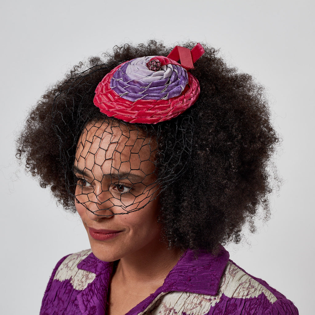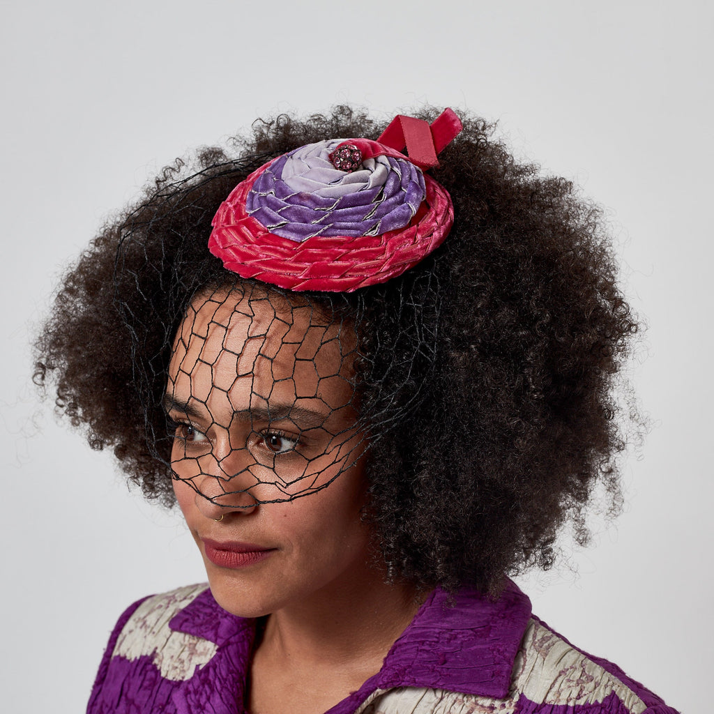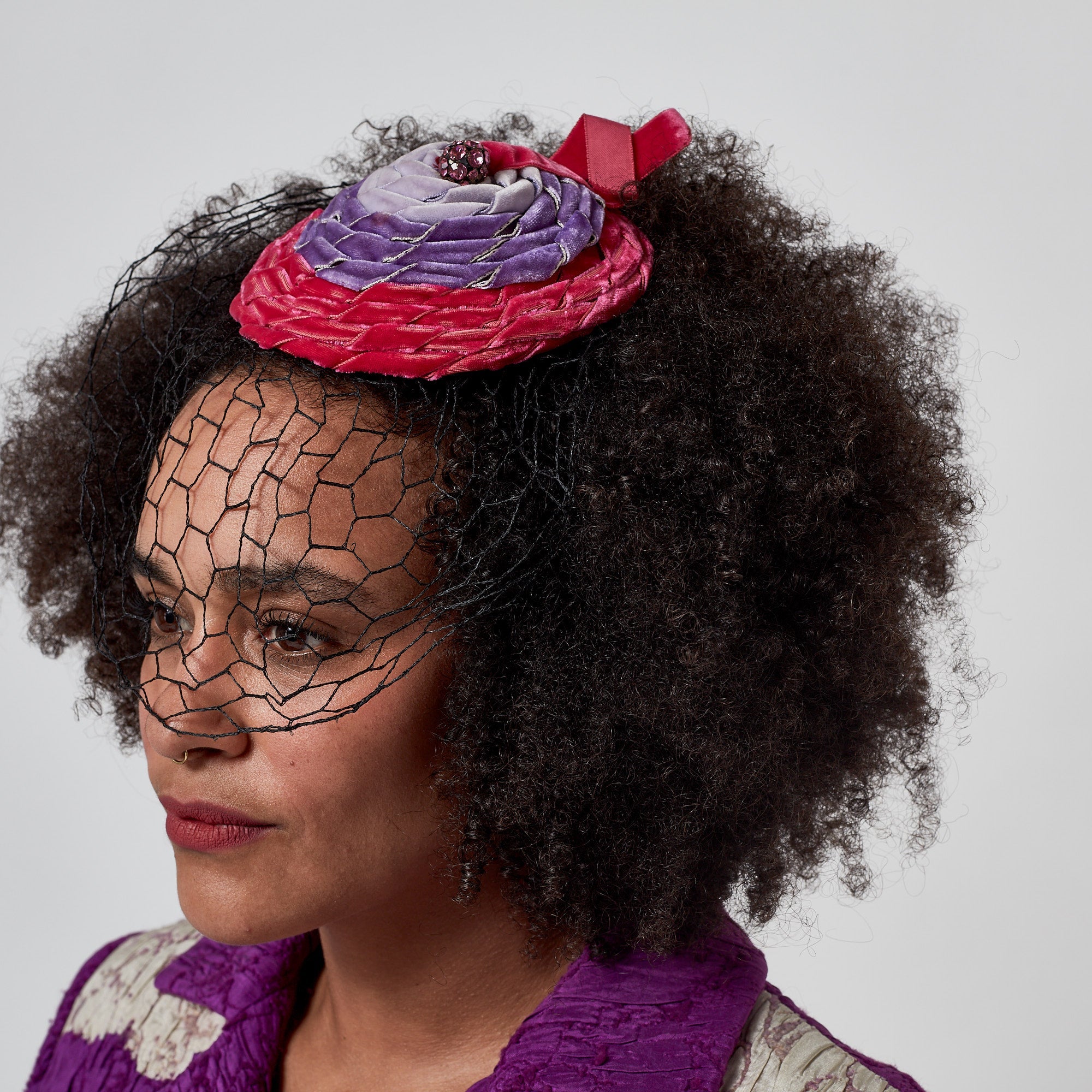 This is a really unusual hat design probably from the late 1940s to early 1950s and almost like a fascinator. It is made up of folded velvet ribbon in wide bands made into a circular hat topper. It is comprised of the most gorgeous coloured velvet - pale lilac, a darker lilac and pink. There is a bow detail to the top and a prong set pink rhinestone button too. Most hat toppers of the day were designed for formal events and were particularly popular worn to the back of the head. This piece can be positioned towards the front of the head at a jaunty angle for a more modern look.