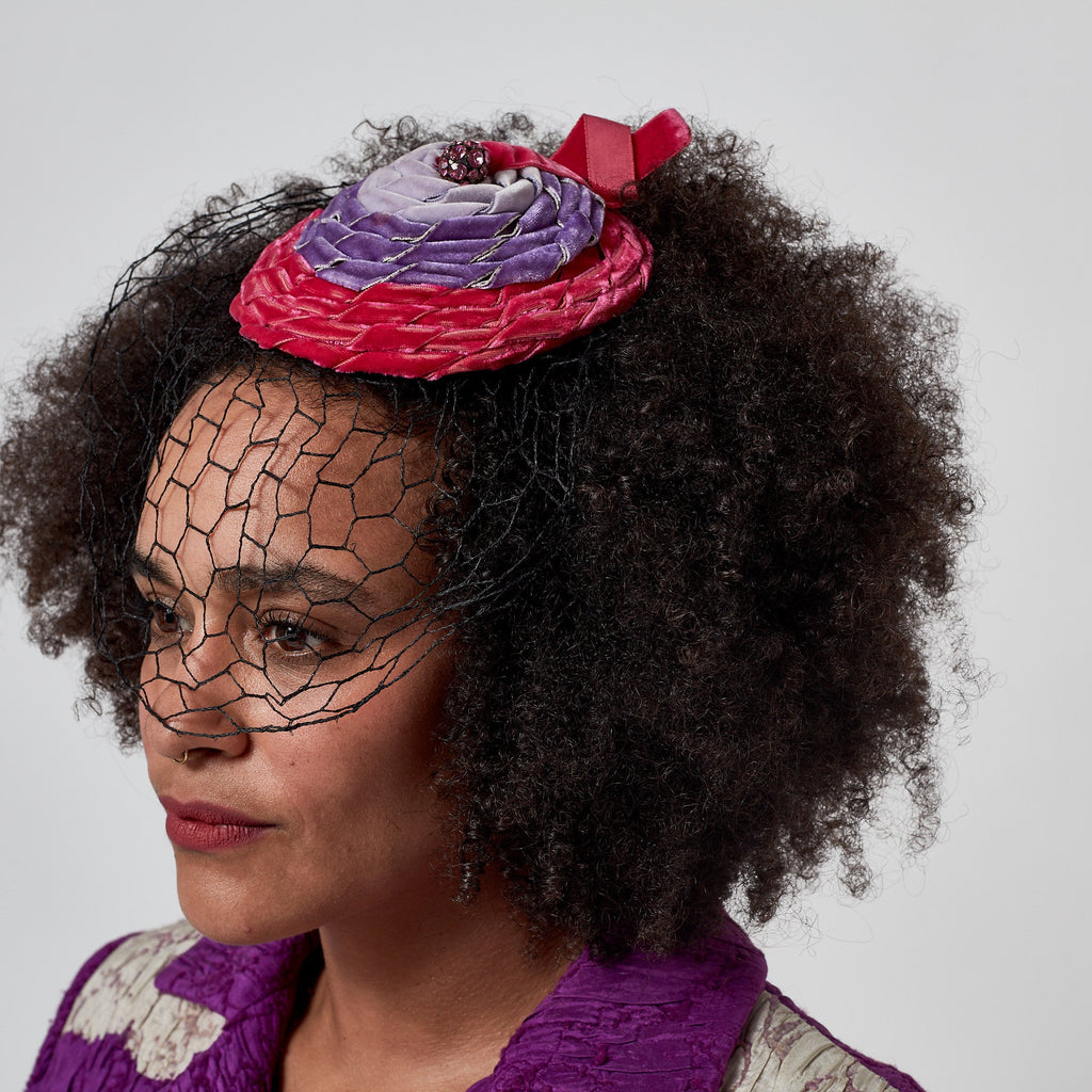1950s Pink & Purple Ribbonwork Veiled Hat Topper