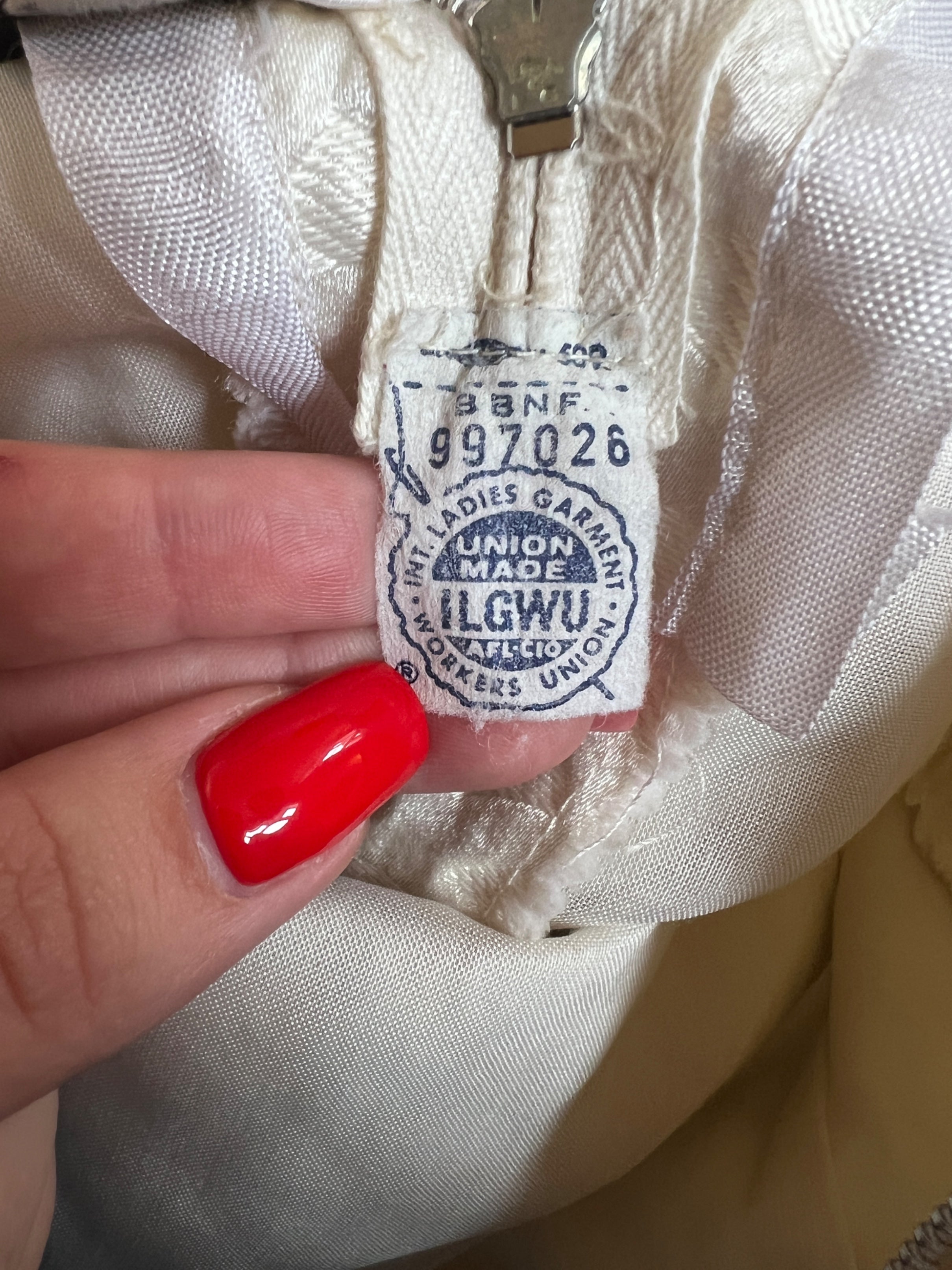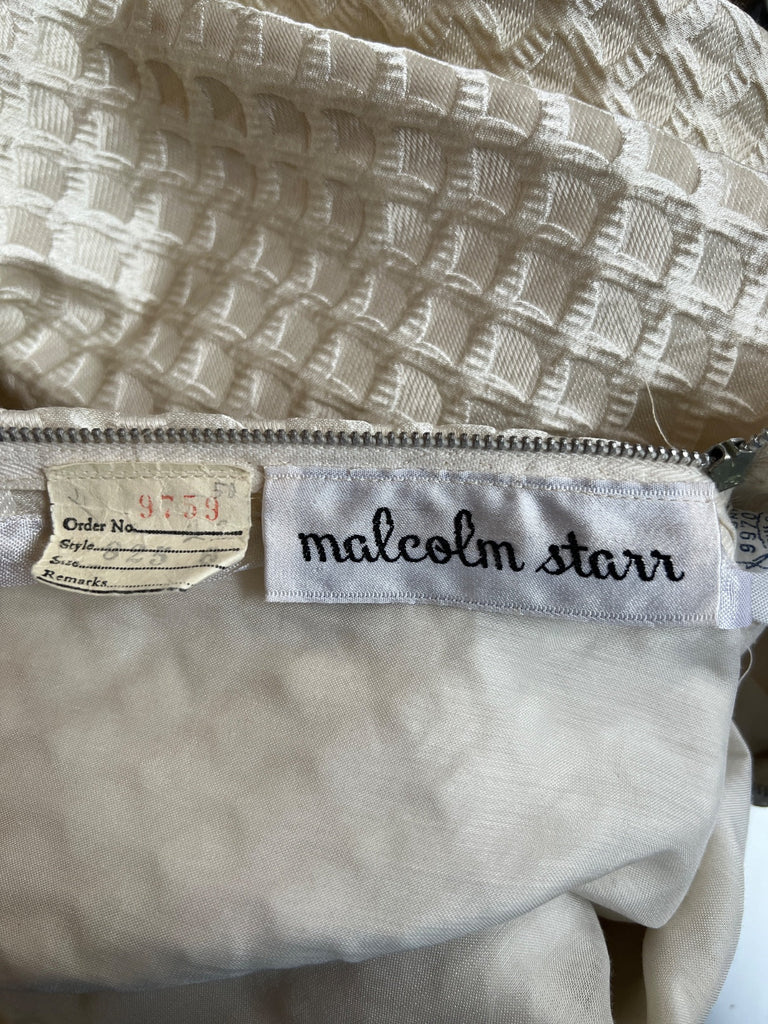 Malcolm Starr made hugely popular evening and wedding dresses throughout the 1960s and 1970s and his collections retailed in the finest department stores throughout the USA. Simple shapes, such as shift-dresses, empire line cuts and sculptural forms, were the designer's signature, often finished with flamboyant detailing. It's pleasing to see that this dress also retains the Saks Fifth Avenue label and the ILGWU union label which dates the dress to between 1964 to 1973.