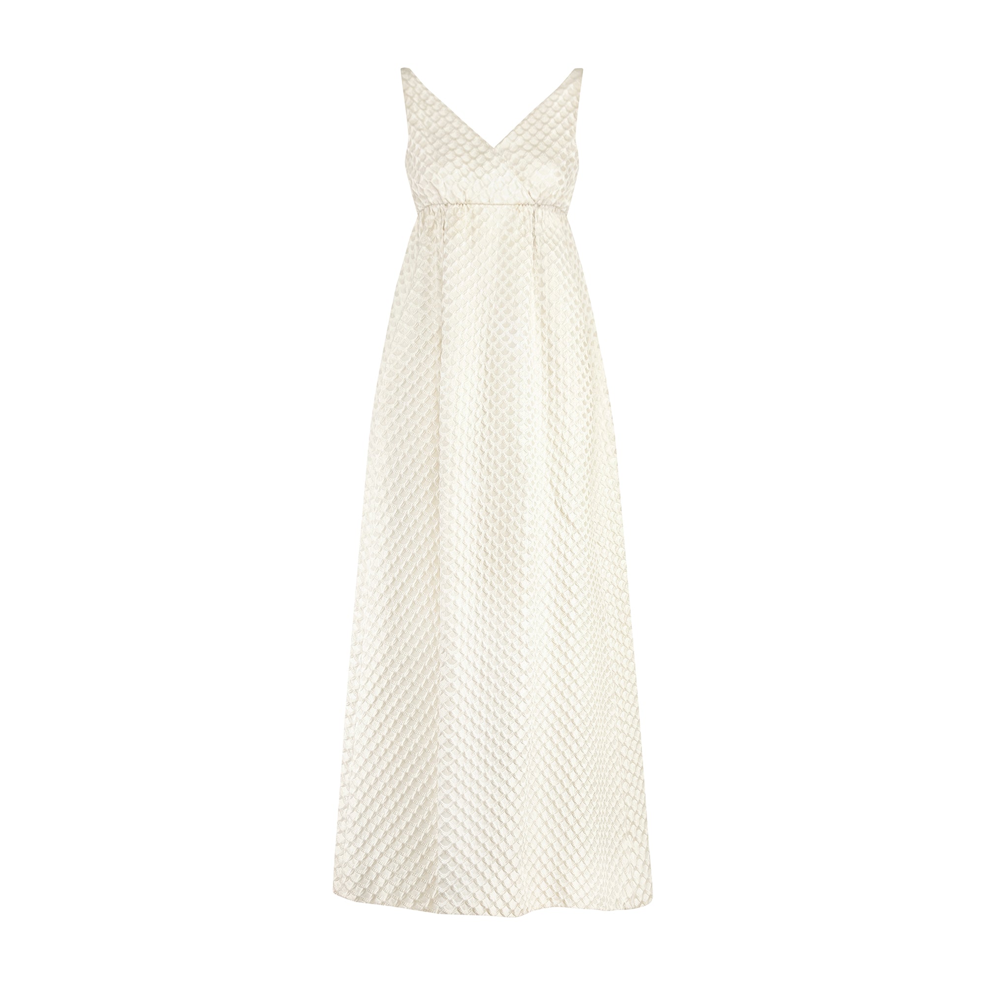 This maxi dress is tailored to a classic empire silhouette that falls to the ankle. The fabric is stunning, a thick brocade with a criss-crossing pattern, a slight sheen and a 3D texture. The wide straps give way to a cross-over neckline. Below this, the dress is shaped as an empire-line cut with soft pleating under the bust that adds an elegance typical of this era. This pretty dress is an off-white to pale cream colour and lined in tonal satin. It is secured with a hidden, tonal zip along the back.