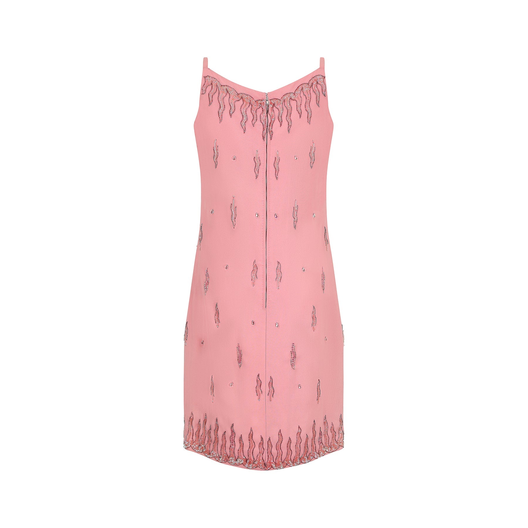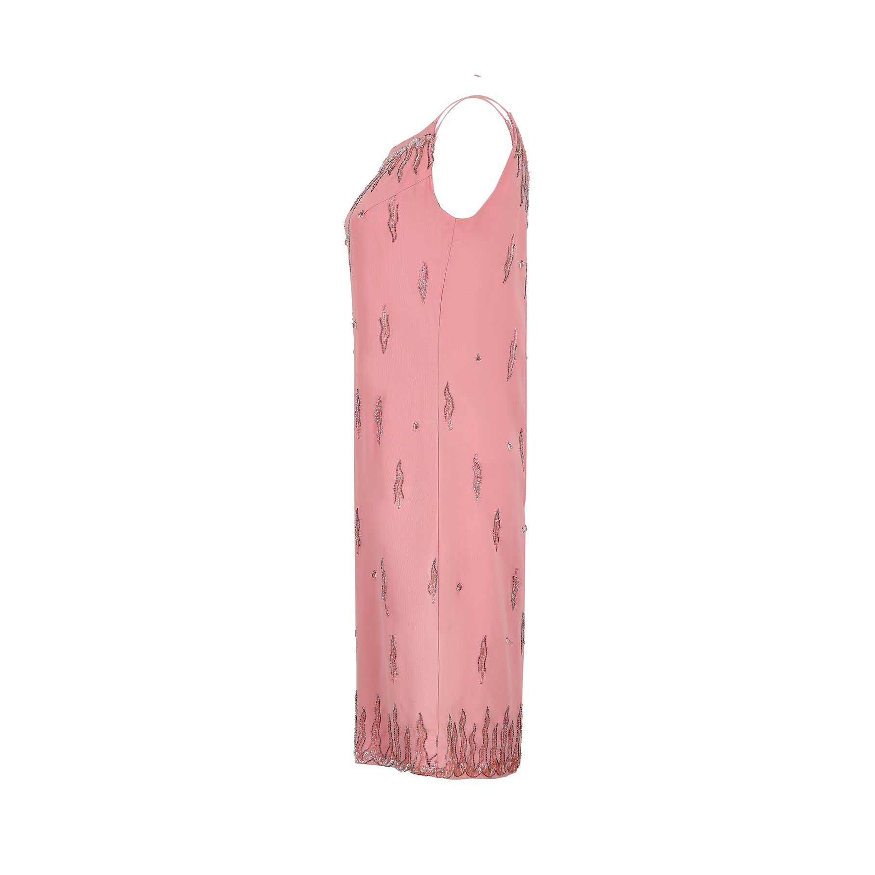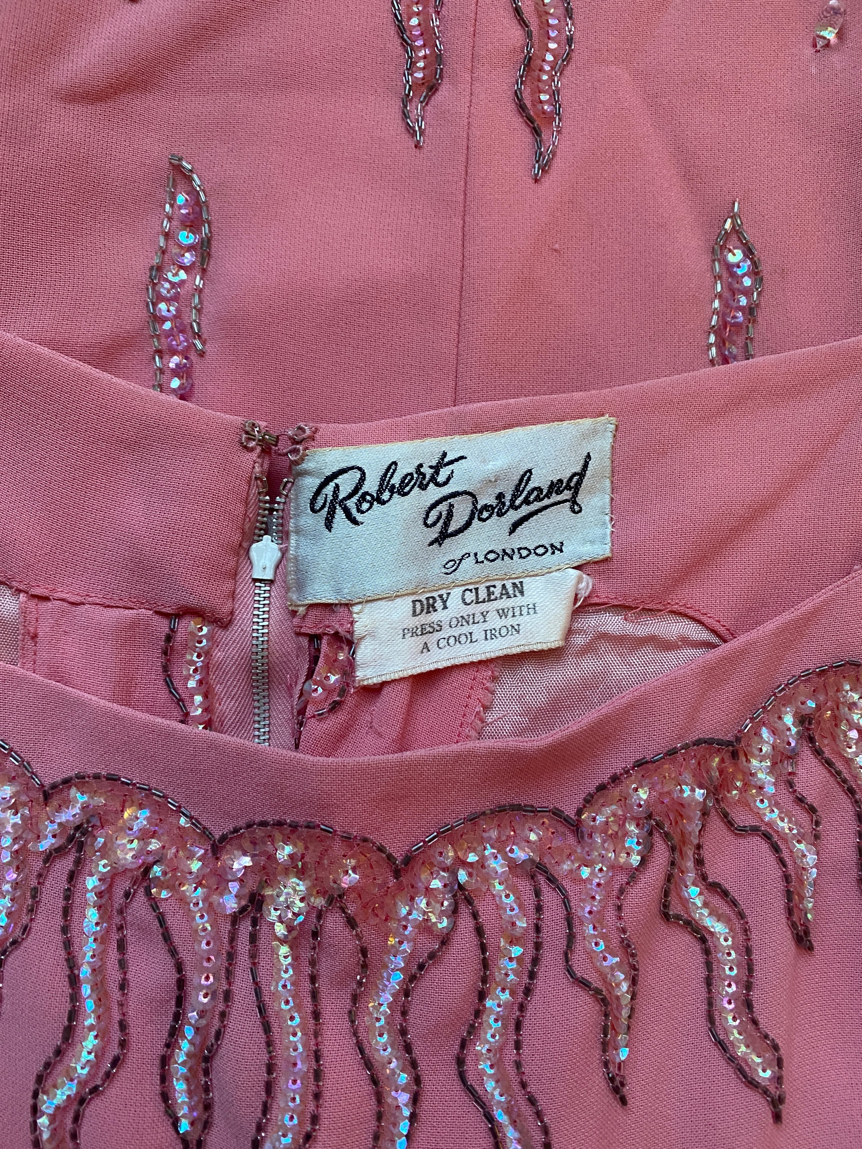 I really love the simplicity and cut of this 1960s Robert Dorland dress. The unusual sequin and beaded arrangement which runs along the neckline and skirt hem reminds me of the shape of a candle flame. The design also individually features in the composition together with scattered singular glass tear-drop beads. It has a high boat neckline and a simple shoulder strap. The shape is very much the same to the reverse. It fastens with the original metal zip and hook and eye. The material is a bright pink, medium weight rayon, crepe-like fabric.