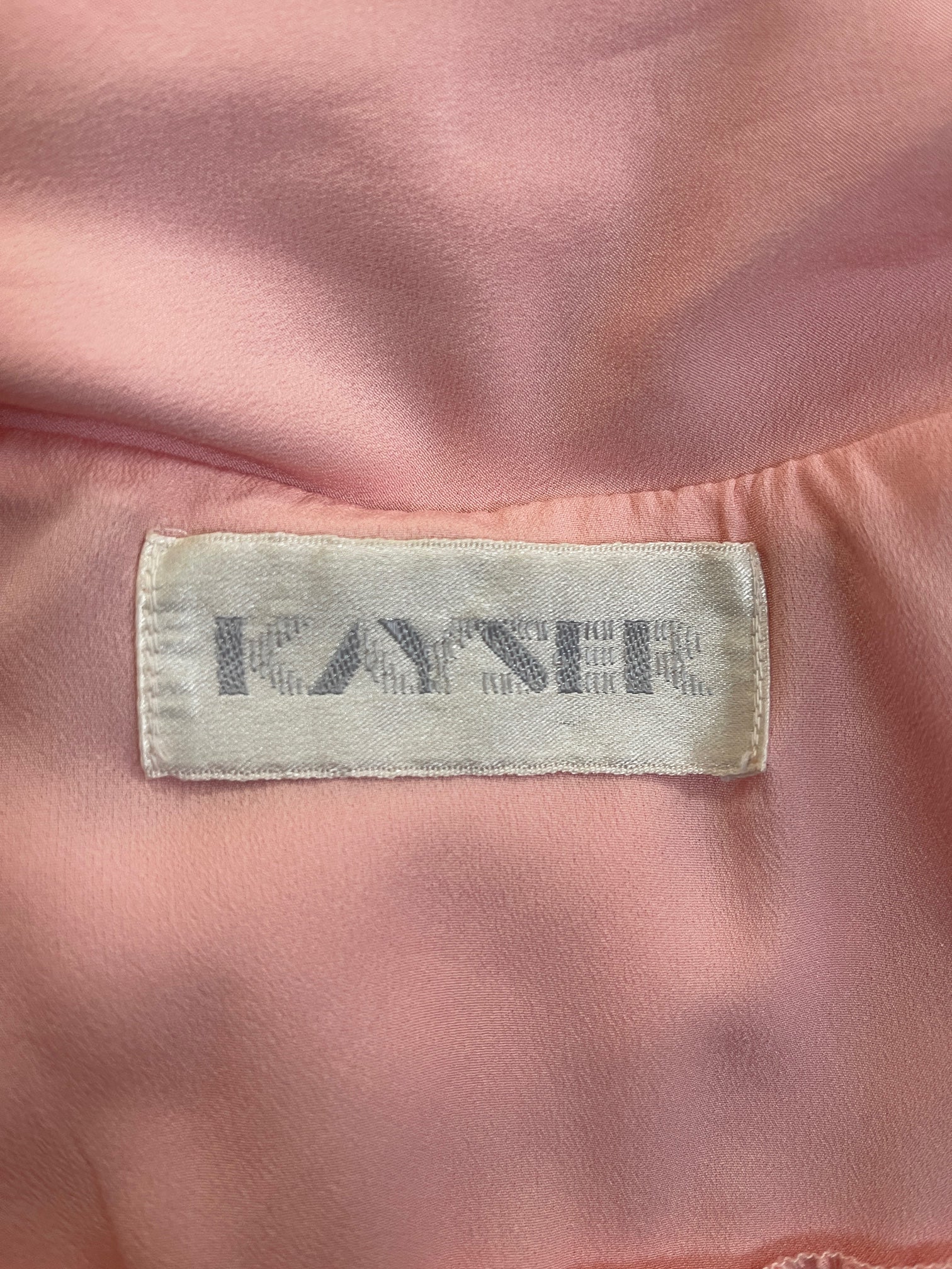Vintage slip dresses are highly collectable and this is a truly lovely high-end example. They are prized for their wearability and the luxuriousness of the fabrics as well as the simple grace of their silhouettes. This two-piece trousseau, a candy pink confection, was made by American brand Kayser in the 1970s. Tailored to a wide, flowing style, the slip dress has a V-neckline and thin spaghetti straps. It has a ruched empire-line waistband that sits under the bust and gives way to a full skirt. The skirt is decadently trimmed along the bottom with layers of white machined lace, pink grosgrain ribbon and knife pleated panels of pink cloth. The slip dress is unlined. It comes with a coordinating lace-trimmed robe. Tailored from the same pink cloth, it has generous bell-sleeves with large ruffled cuffs trimmed with white lace. The robe has a point collar alongside a wide Peter Pan collar/cape trimmed with white lace that drapes across the shoulders. It can be buttoned with two faux mother-of-pearl buttons at the collar and tied with pink fabric ties at the neck.