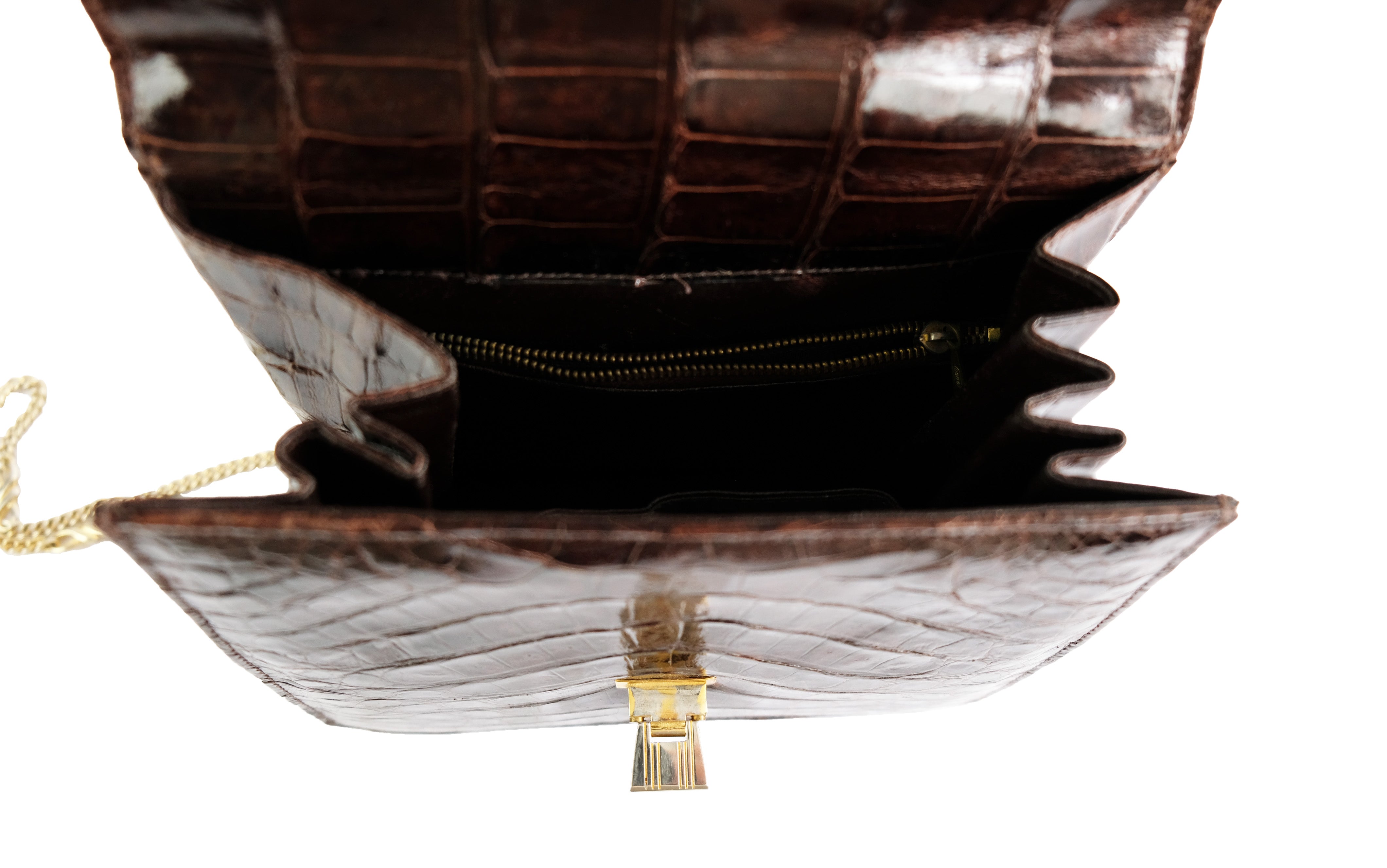 A cute 1970s Vintage  Deco-style handbag in shiny brown reptile skin, possibly alligator, unbranded.