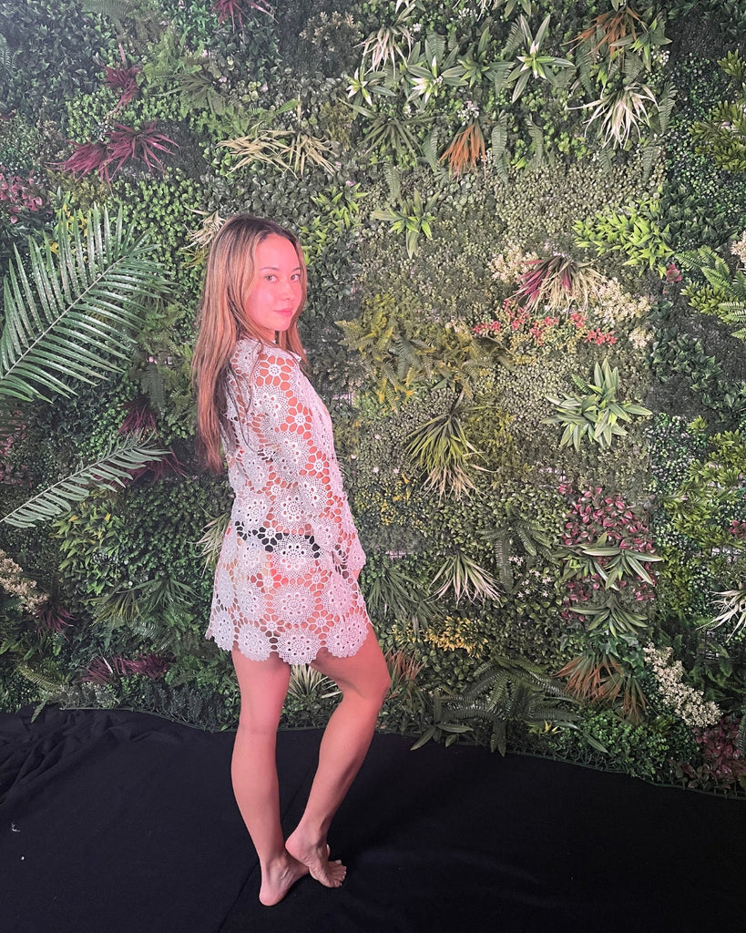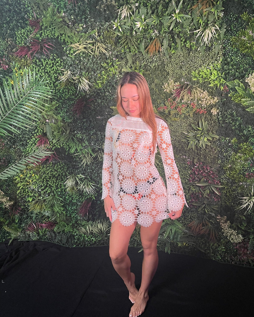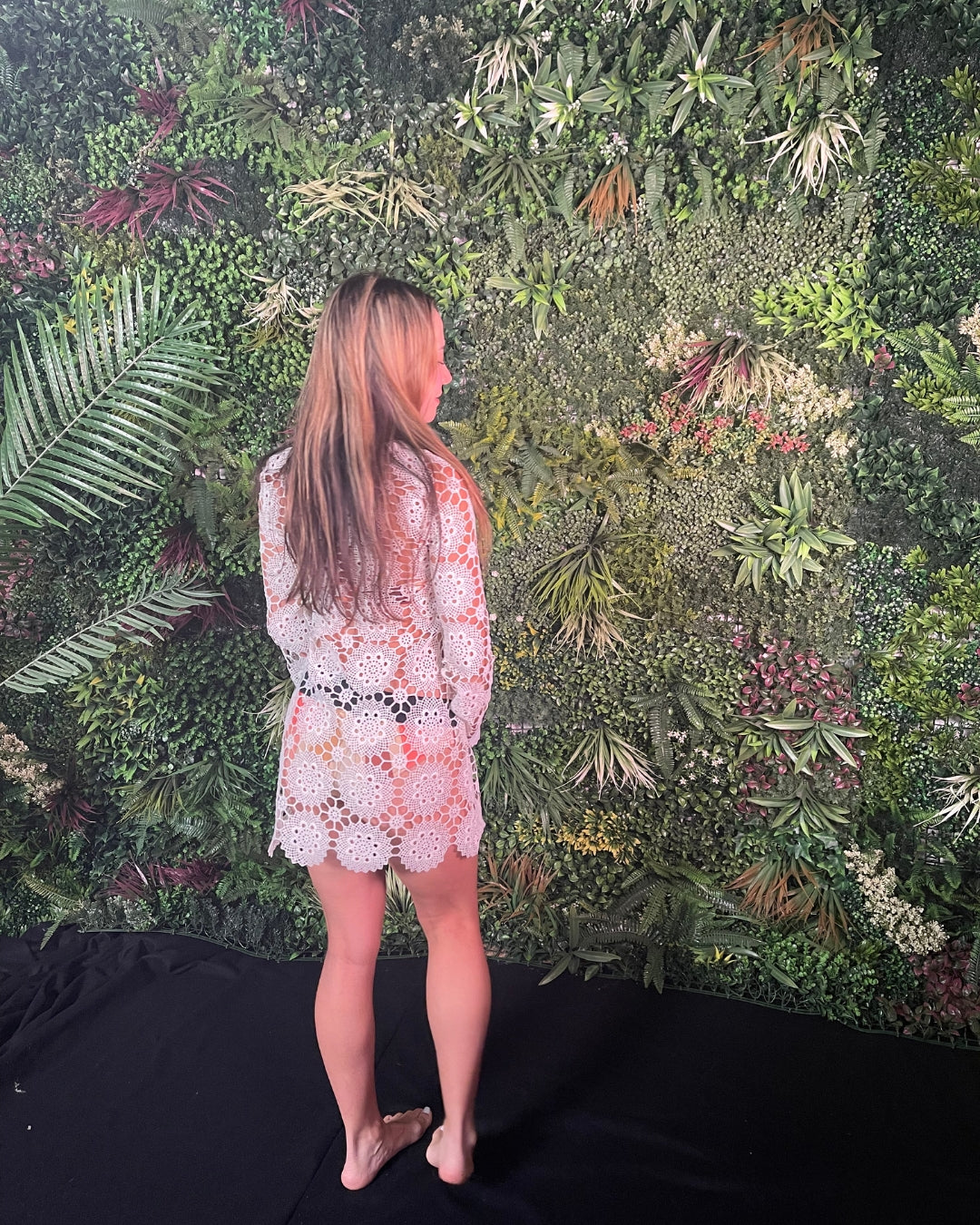 This bohemian mini-dress was crafted in the 1970s by an unknown designer. Crafted entirely from crochet and therefore completely see-through, it has a wide neckline with swinging, flared angel-sleeves. Woven from white manmade thread, the crochet knit recalls doilies and is detailed with psychedelic flowers and star-filled circles. Pretty scallop hems finish the cuffs and bottom hem, whilst the neckline is finished with a crochet trim woven to look like a row of leaves. The back has a small keyhole cut-out and fastens with a mother-of-pearl button at the rear of the neck.