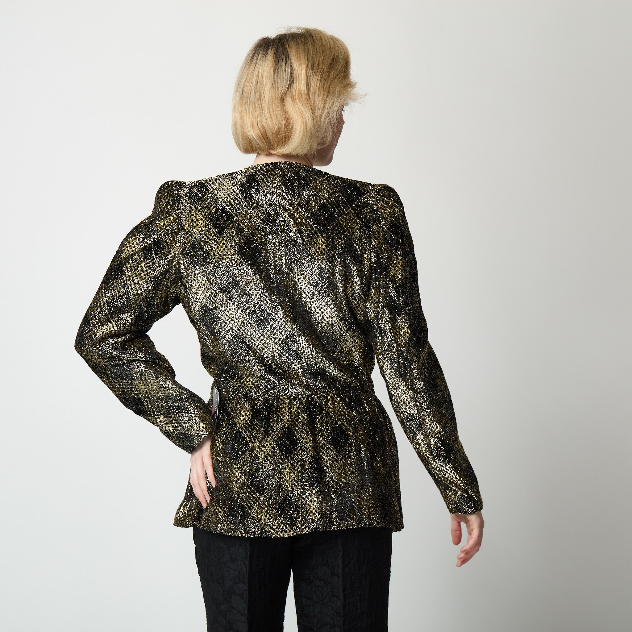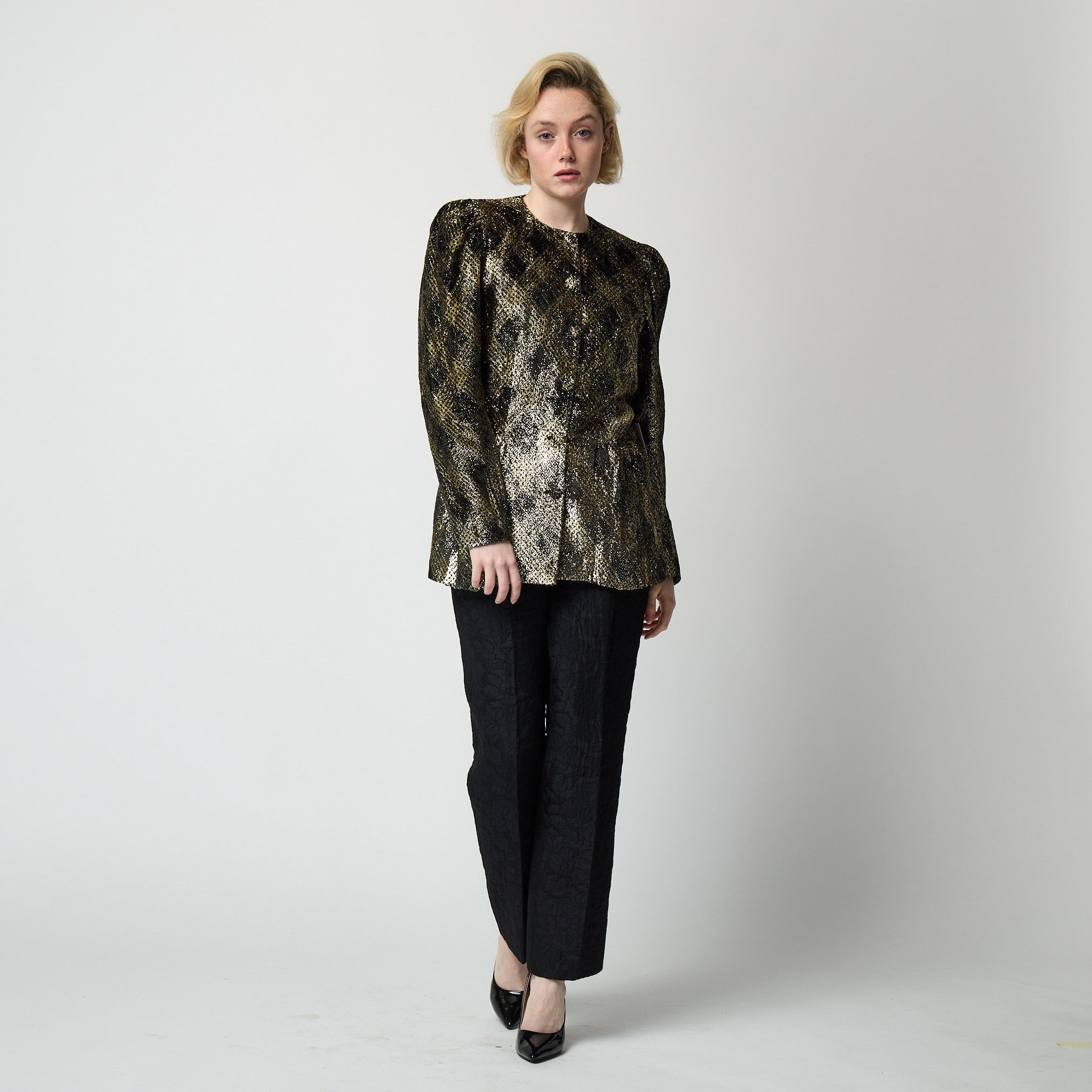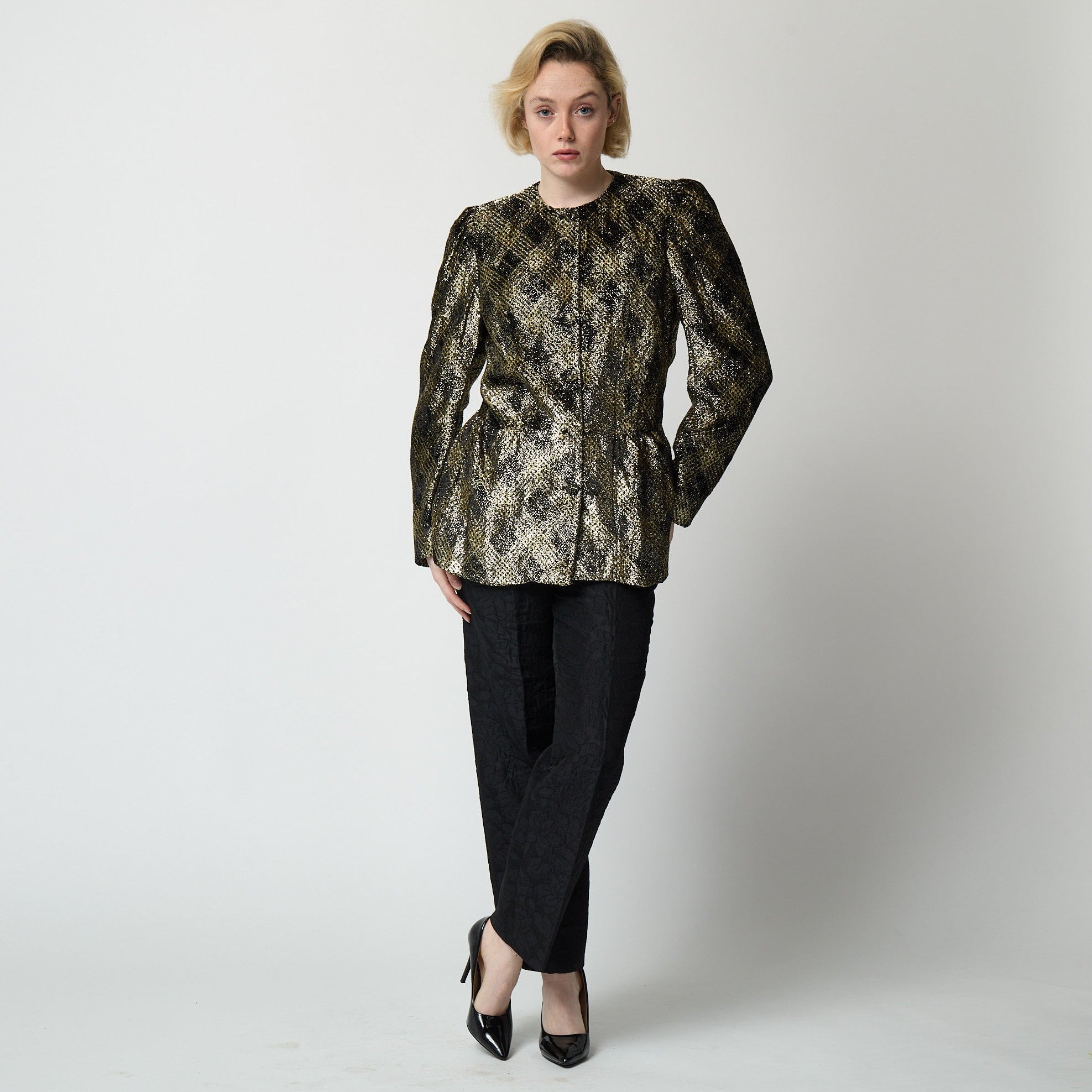 Made in Italy in the 1980s, this glistening lurex jacket dates to the era of excess. Tailored from the most fabulous fabric - a furry black chenille shot through with gold lurex in a gingham pattern - it plays homage to the high-octane glamour of the house’s early years. Cut to a boxy style, it is collarless and fastens down the front with luxurious buttons covered in coordinating fabric. It has a cinched waist, pockets and puff-sleeves which adds volume at the shoulders. The jacket is lined with black satin which is woven with the brand logo.