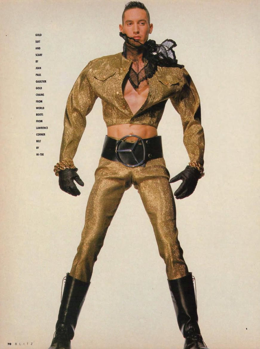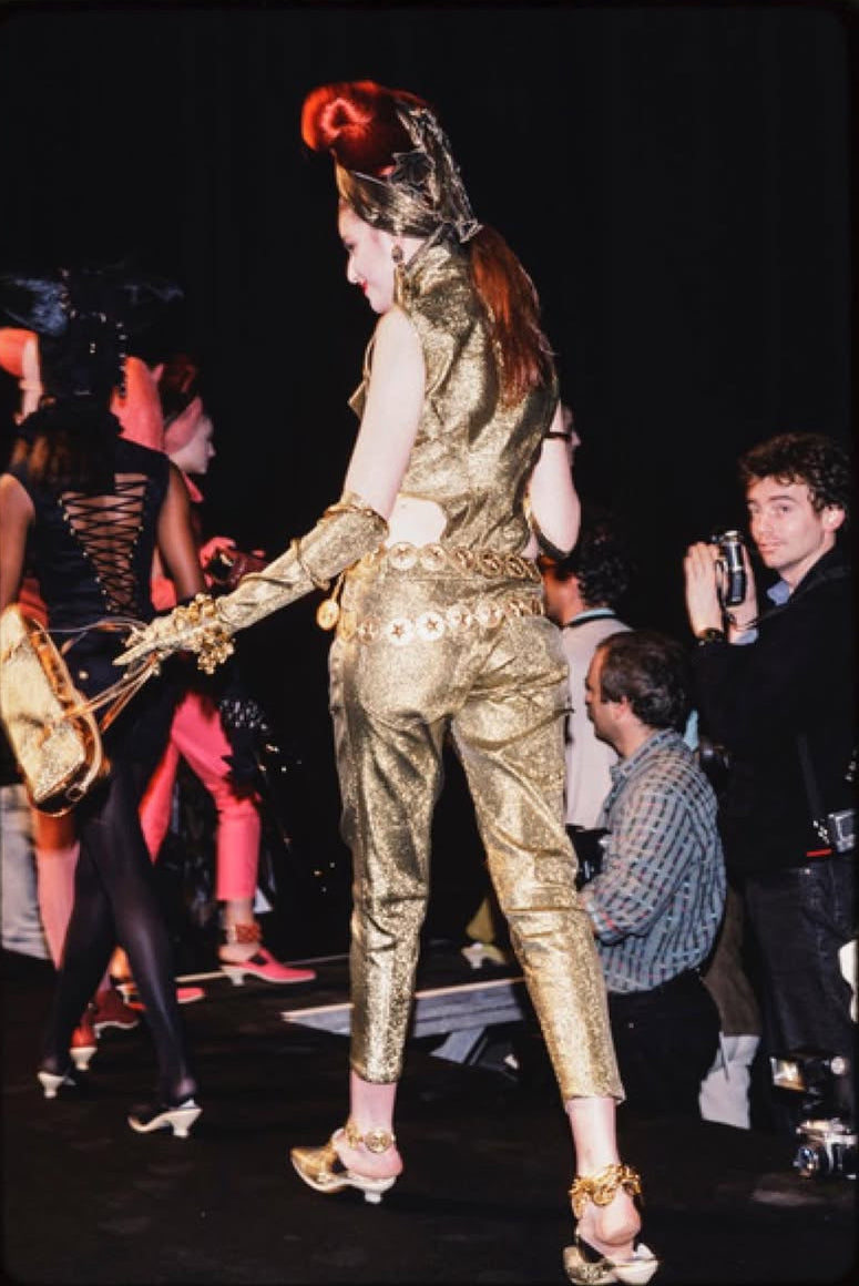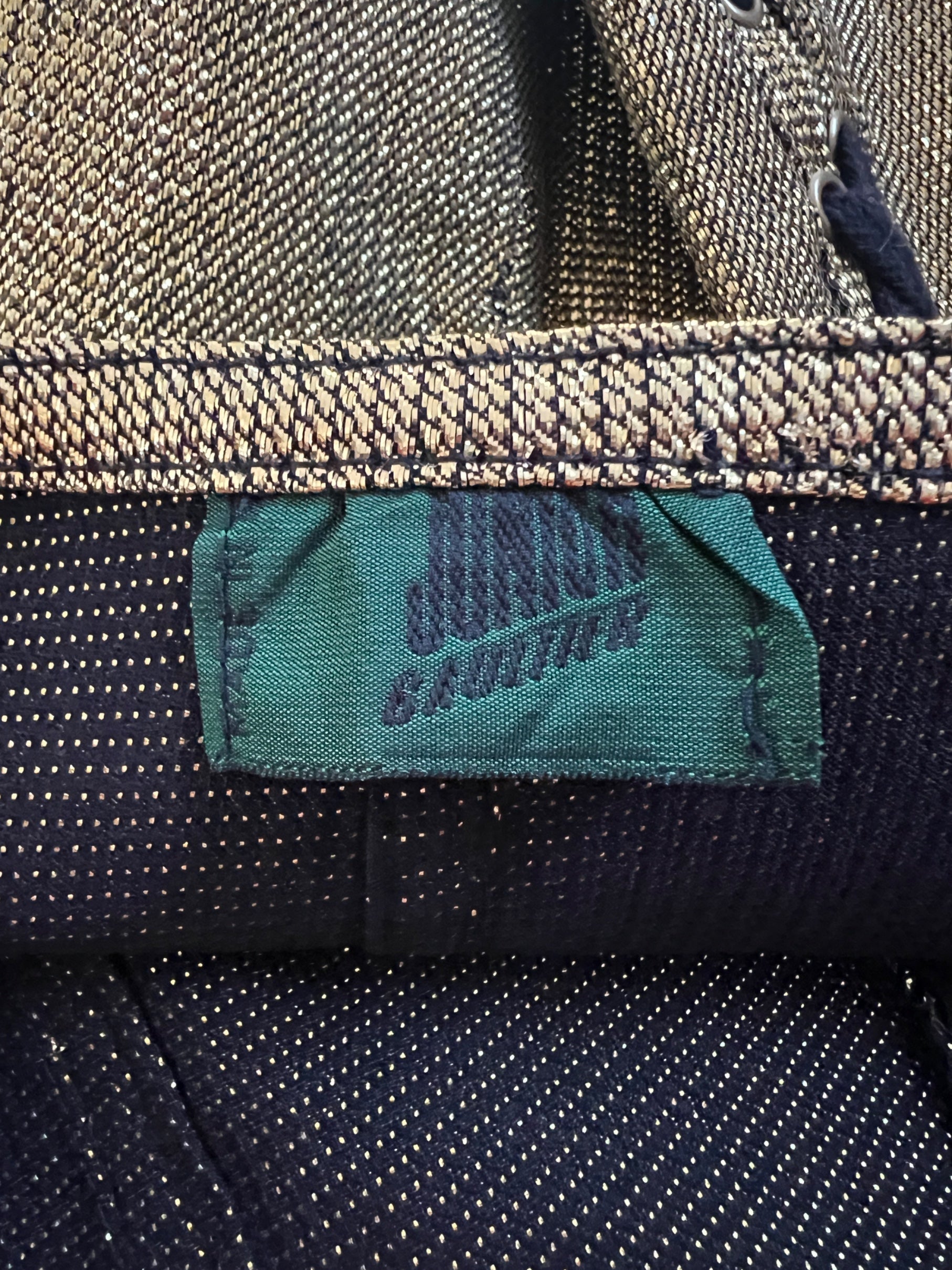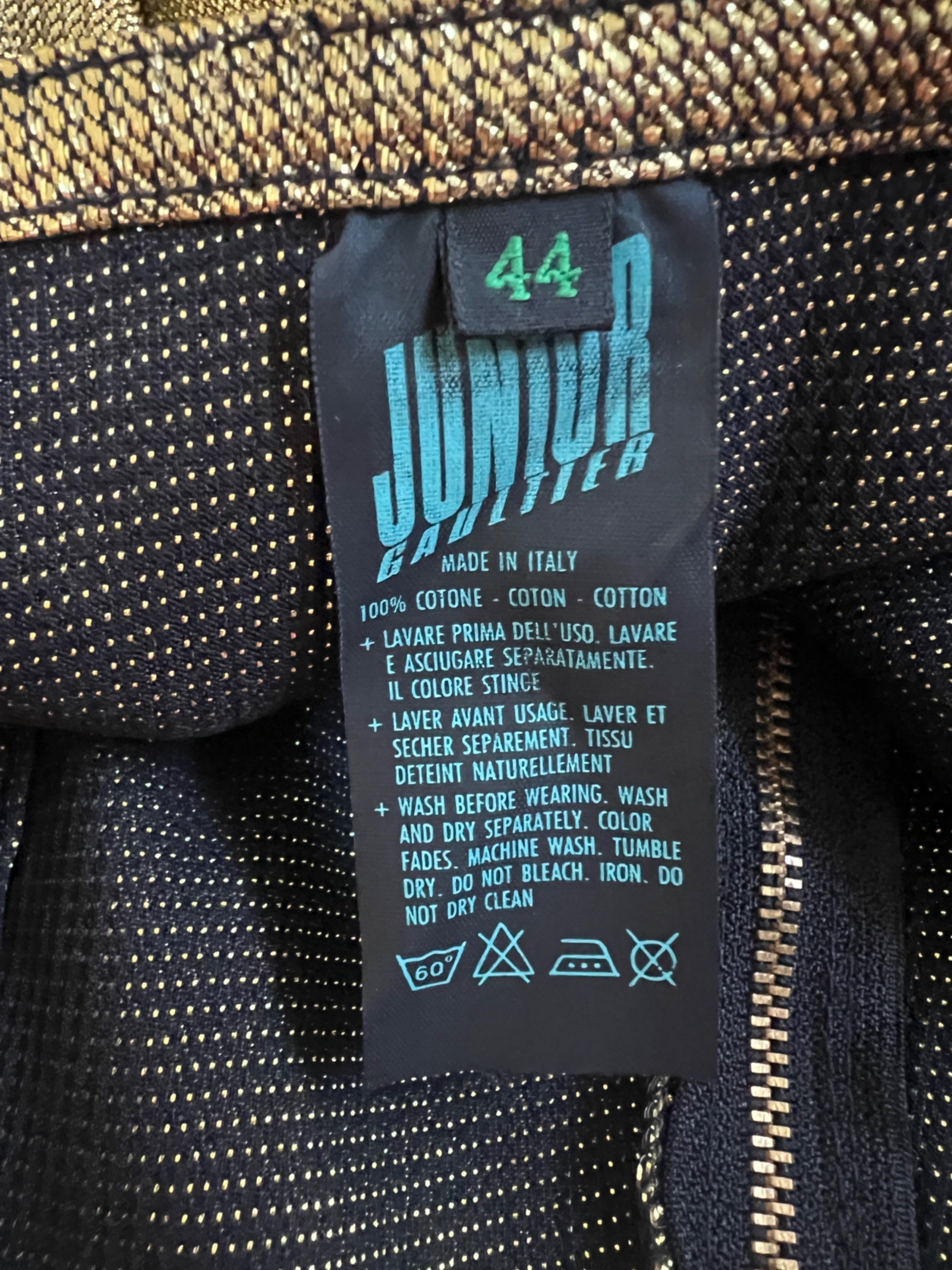 From the late-1980s, these magnificent, metallic Jean Paul Gaultier trousers are a rare find and in virtually unworn condition. A very well documented design of the iconic French designer’s Spring 1989 collection and made for his Junior line. The fabric is mesmerising; gold lamé thread woven into neat rows that glitter as they catch the light. Cut to a high-waist, slim-fit cigarette silhouette, the sides are laced with thick black shoelaces threaded through gold-tone metal eyelets. This lacing adds a punk twist typical of the label at this time. These trousers are secured at the back of the waist with a hidden tonal gold-tone zip and hook-and-eye clasp. These trousers are unlined and the reverse of the lamé thread shows as black. The label reads “Junior Gaultier” in black font on dark green cloth and the original tag is still attached.