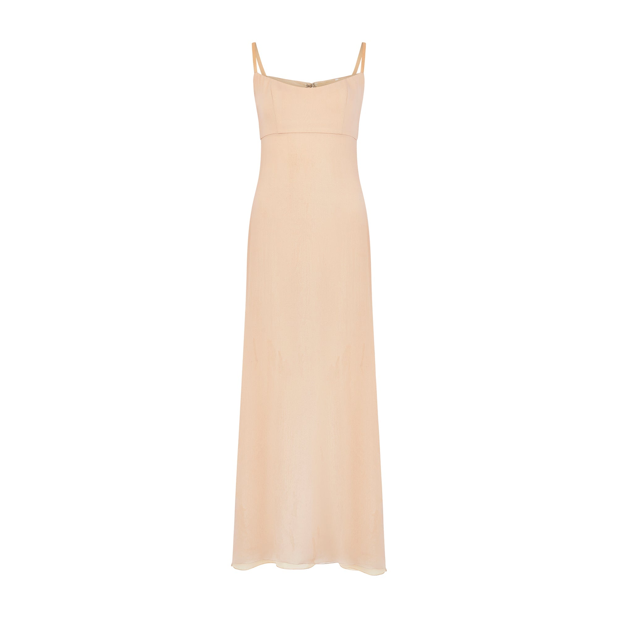 This late 1990s to early 2000s Jacques Azagury evening gown is a tailored from romantic nude silk chiffon. It is inspired by antique slip-dresses and features a structured bust which is boned at the front and back. Underneath, a sheath silhouette falls the length of the dress to the floor. The straps are crafted from nude mesh that plays to the underwear-as-outerwear feel. The back of the dress fastens with a hidden tonal zip and hook-and-eye clasp. It is fully lined with pale peach silk.
