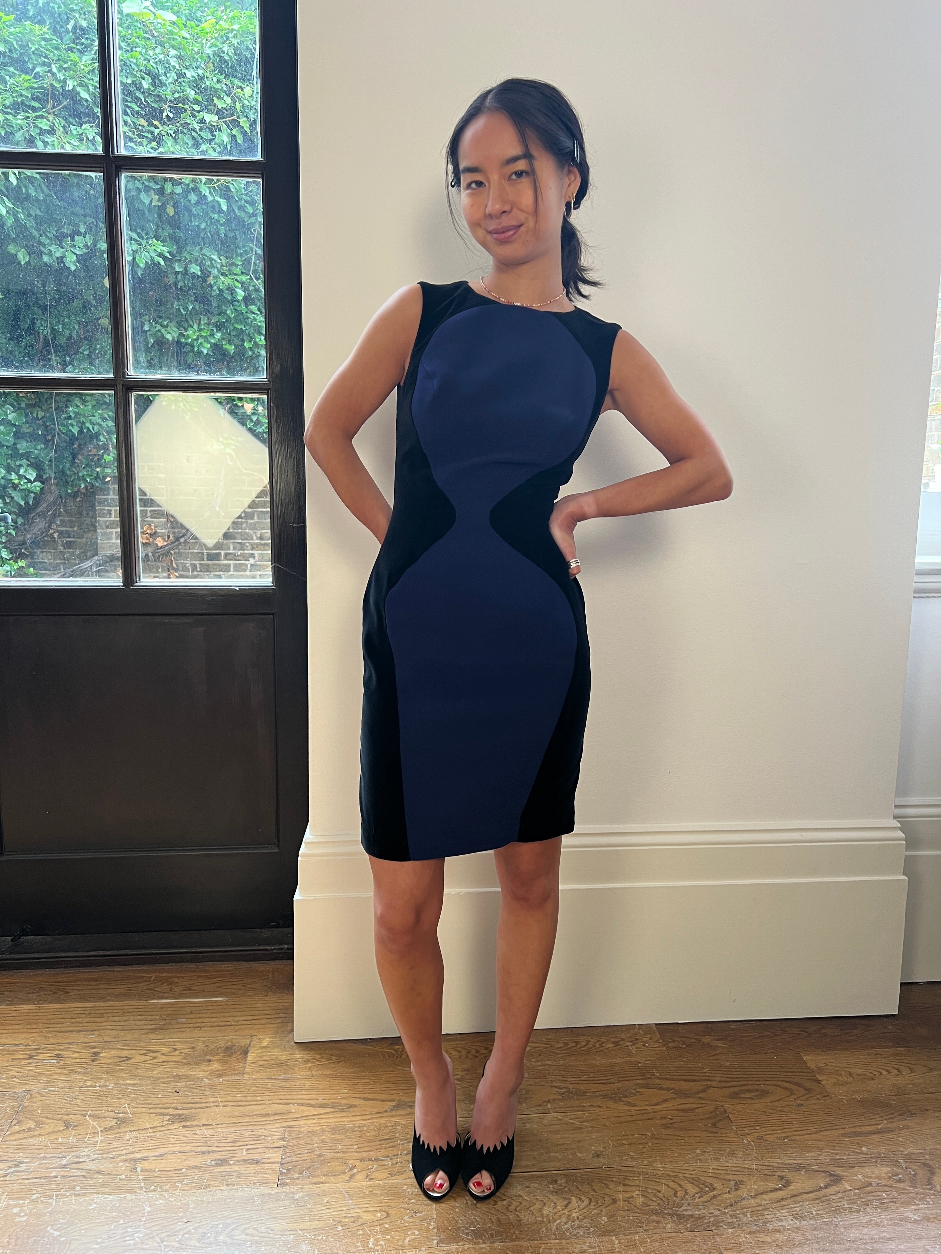 This incredible late-1990s Mugler dress creates the most flattering and feminine silhouette for the wearer. Made from thick black velvet with indigo blue, almost purple fabric panelling, its tailoring creates a beautiful hourglass illusion and recalls a couture suit that walked the runway as part of the Spring 1998 Couture collection. The front features a rounded neckline and seam detail around the bust, while the back fastens with a central zip and hook and eye closure. The back also features a black velvet bow detail, complete with four poppers which join together to conceal the zip placket beneath. The skirt is finished in a classic pencil shape, making this the perfect dress for a smart cocktail party, or as a piece of sophisticated workwear. It is in fabulous vintage condition with no stains or faults to note, and would best fit a 6 UK, or 2 US. Our model is a UK 6-8 and 5ft 4in (163cm) and this dress fit her well.