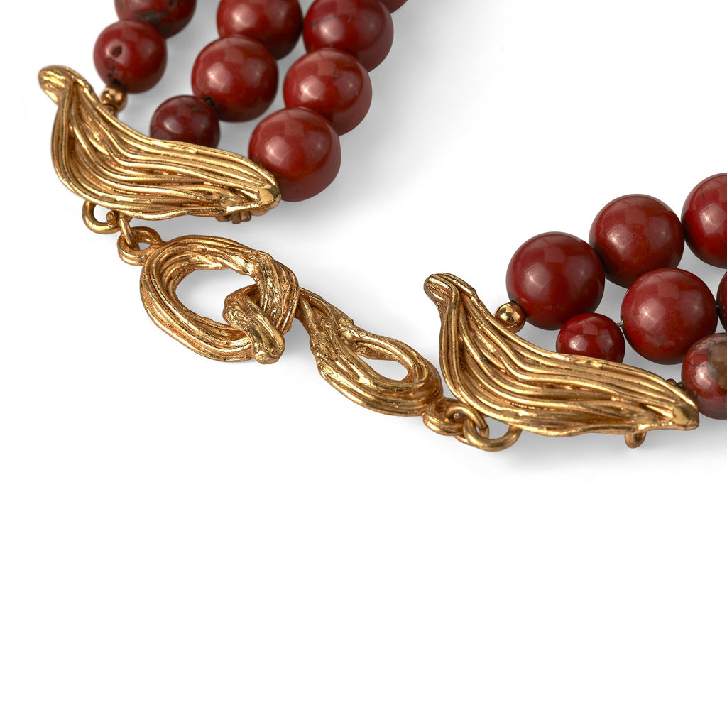 This substantial and weighty necklace is threaded with real reddish-brown polished agate stone beads. The stand-out detailing is the three large sun motifs in gold-toned metal that adorn and intersperse the beaded strands. The large central sun pendant features a brown wooden circle hanging from it, finished with a smaller gold-toned metal sun. The back of this wooden circle is finished with a metal plaque engraved with “Yves Saint Laurent Rive Gauche” and “Made in France”. The necklace closes with an elaborate gold-toned metal S-clasp that displays the organic metalwork shapes that became a signature of the fashion house.