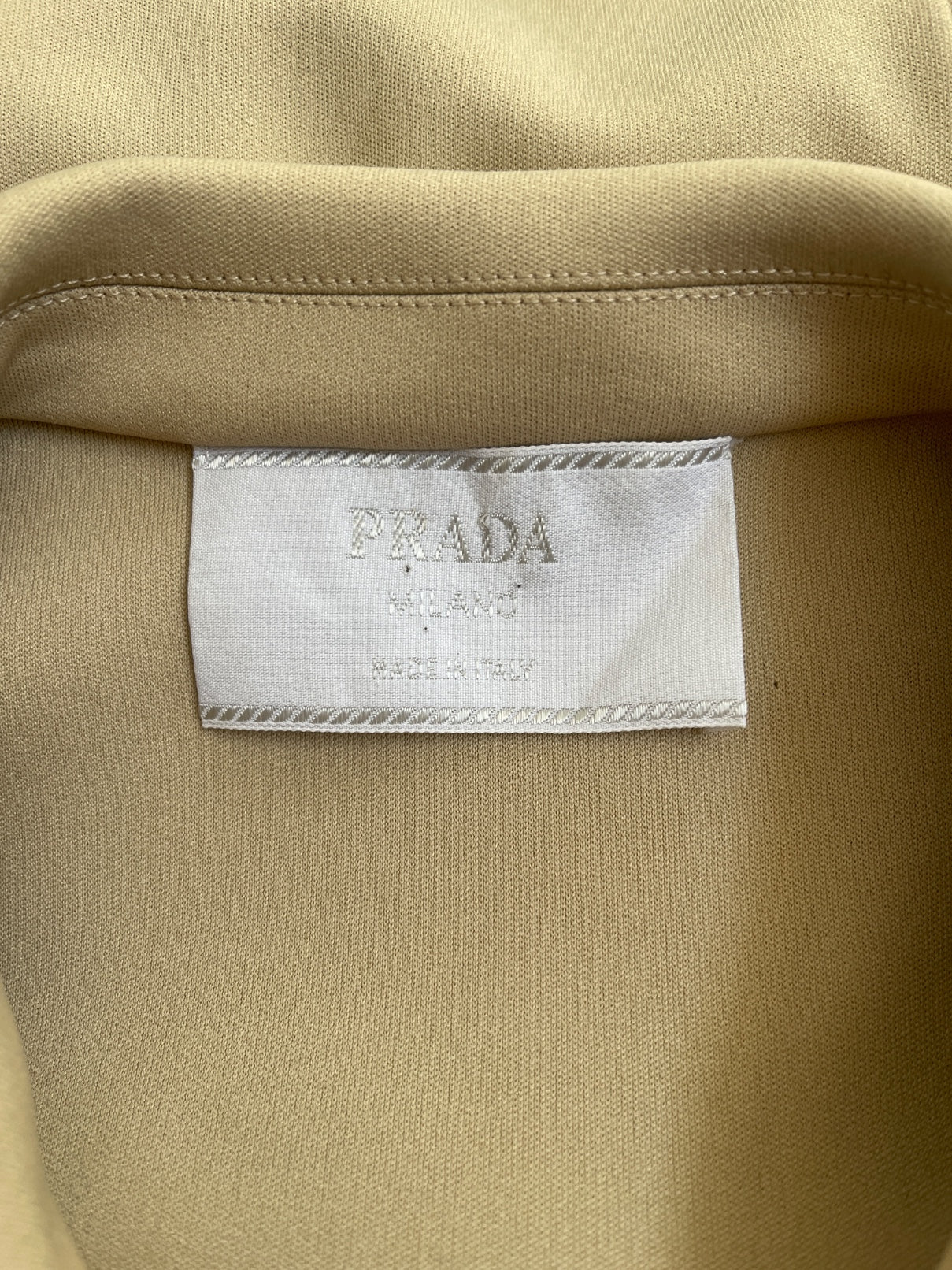 This two-piece ensemble was designed as part of Prada’s Fall 1996 collection. Vogue said retrospectively of the collection that it “managed in that inimitable Prada way to destabilize stereotypes and assumptions about propriety, class, gender, and beauty.” Tailored from a thick beige synthetic cloth with a weighty, smooth feel, the top is cut to a tunic-length and is sleeveless. It is styled like the safari suits so popular in the 1970s, but given a minimal 1990s spin. It has a pointed, button-down collar and fastens along the front with tortoiseshell plastic buttons. The panelled construction is broken by large angular patch pockets at the hips. There is a coordinating belt with a large circular tortoiseshell plastic buckle. The skirt is tailored from the same fabric. It is cut to a high-waist mini-skirt shape with a single pleat at the front. It fastens at the left hip with a hidden zip and hook-and-eye. Both pieces are lined with a sheer tonal satin.