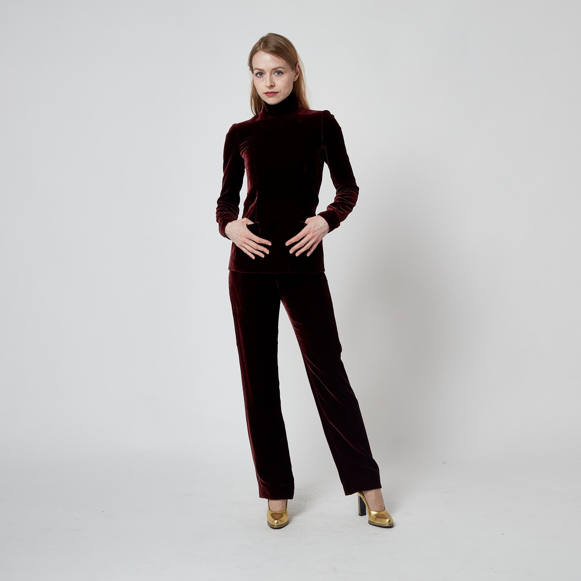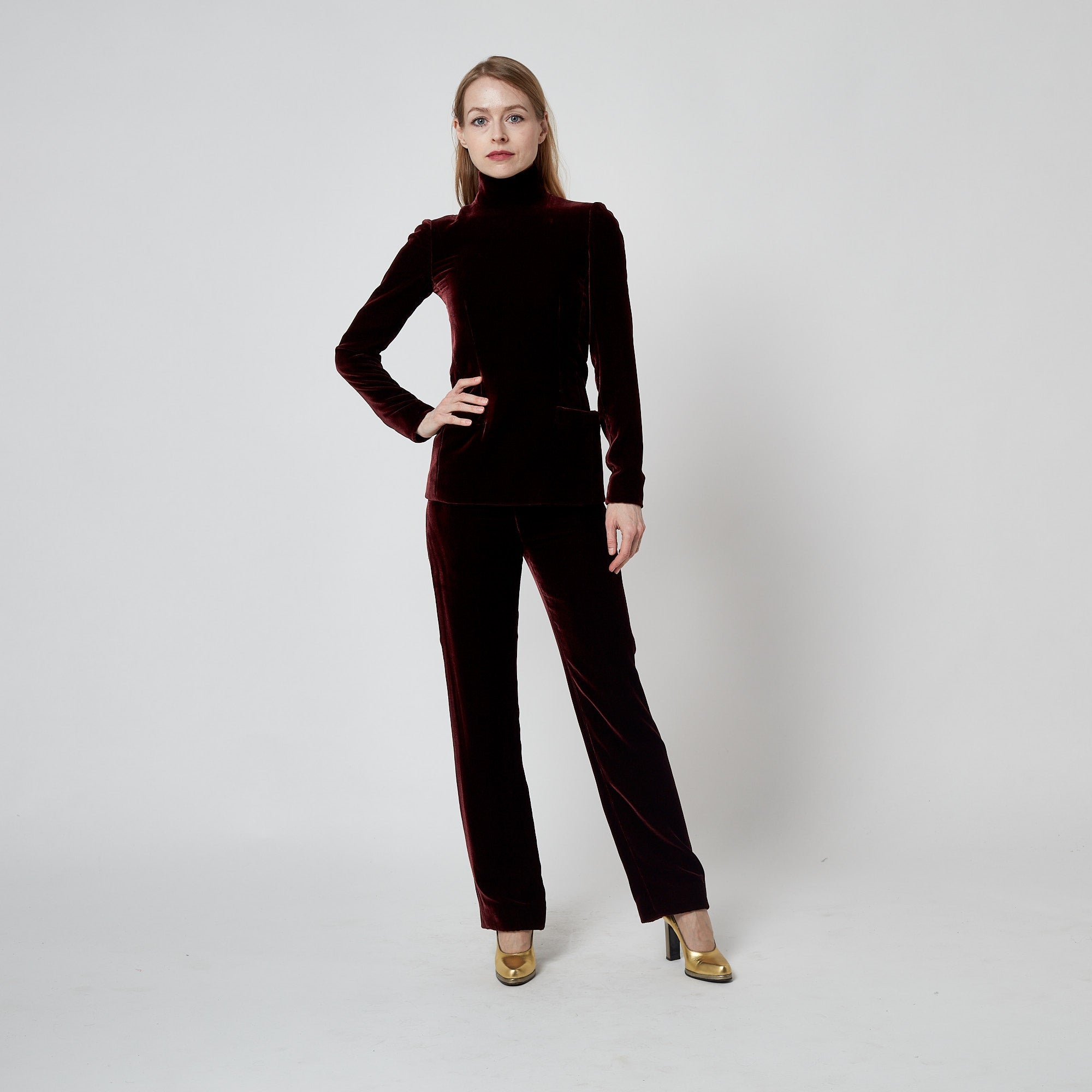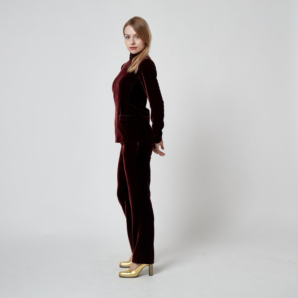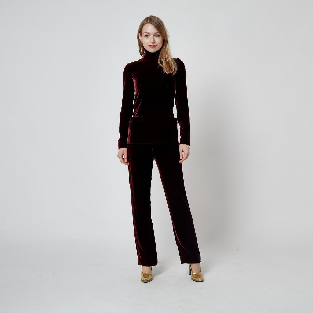 Tailored from buttery soft silk velvet in a deep red wine burgundy hue, the top has a tunic silhouette with a graceful high-neck, slim sleeves and elongated body. It has darts that are sewn upwards from the bottom hem which means the form follows the curves of the body. The raised neckline and back of the top are fastened with a hidden tonal zip and hidden, fabric-covered snap closures. The trousers are cut to a high waist and fasten at the left hip with a hidden hook-and-eye and a tonal zip with fabric pull. They have a wide, straight silhouette. Both the top and trousers are lined throughout in dark aubergine silk-satin, as are the patch pockets. The labels on these couture-made pieces are exquisite; the words “Gaultier Paris” are woven into pale peach lace.