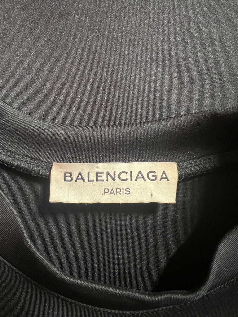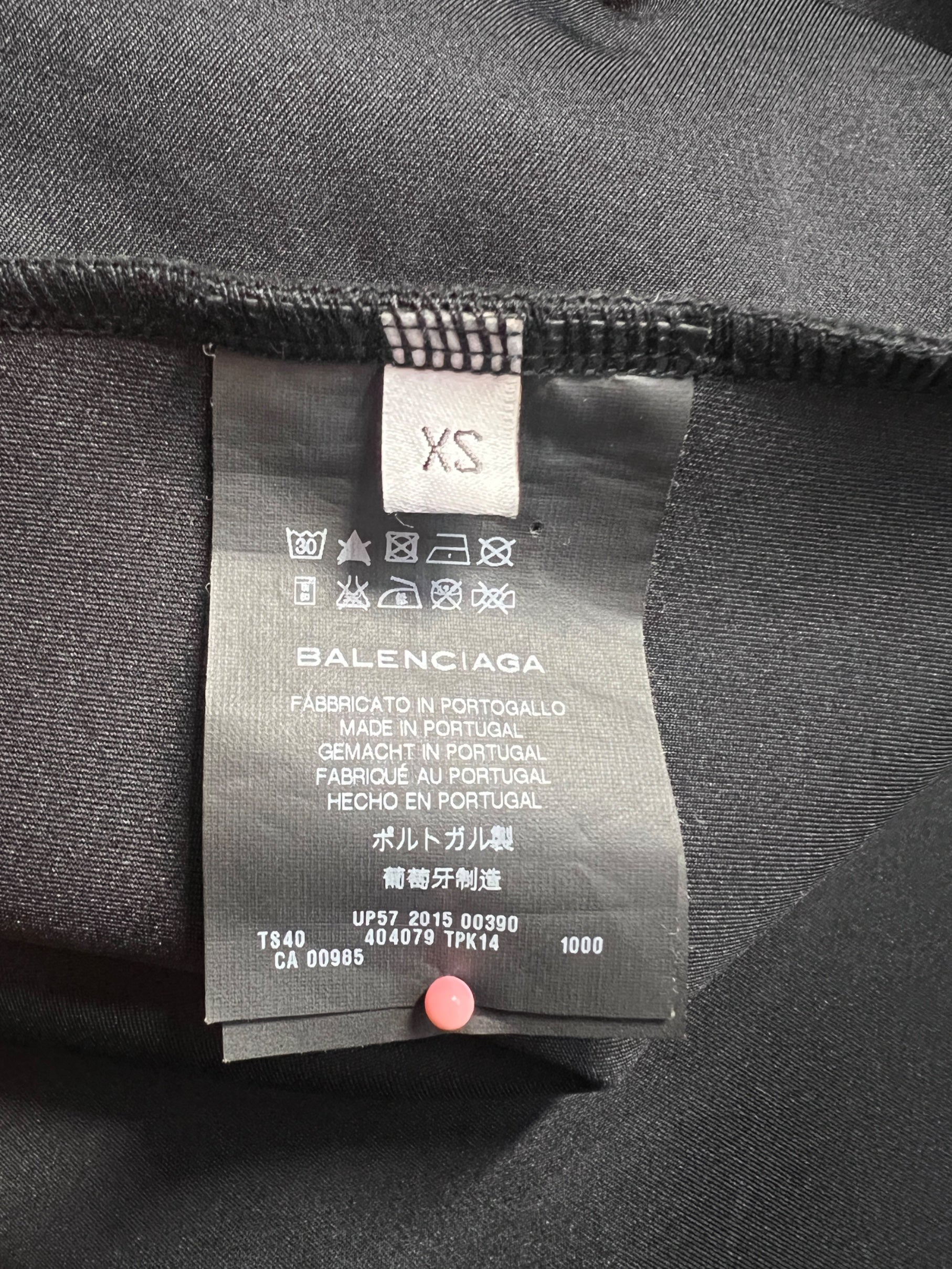 This chic Balenciaga black dress is from the Fall 2015 collection and was designed by Alexander Wang. Tailored from smooth, bouncy neoprene, it is cut to a relaxed, sleeveless style with a rounded neckline. The silhouette is cocooning and draws on silhouettes innovated by the brand’s namesake founder, updating them with a streetwear feel for the 21st century. The neckline is rounded like that of a t-shirt and it has sleeveless, tank-top style arms. The front of the dress is draped in a fold-over manner and pinned with an elaborate, large brooch pin which slots between two silver-tone rivets. These pins were referenced many times on the runway looks and it is crafted from silver-tone metal and adorned at the top with a large faux pearl surrounded by silver petals - a refined detail that elevates this casual silhouette to Balenciaga-level opulence. This dress is unlined.