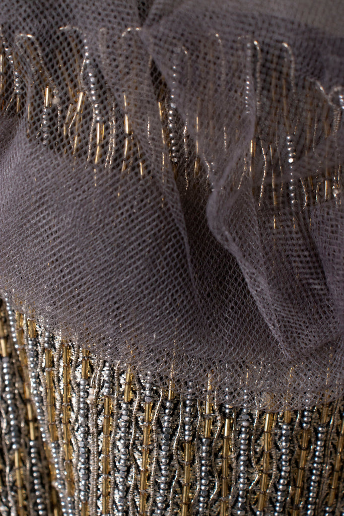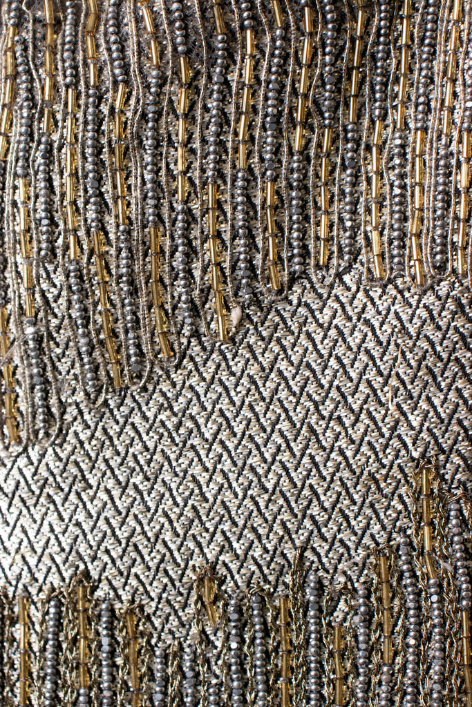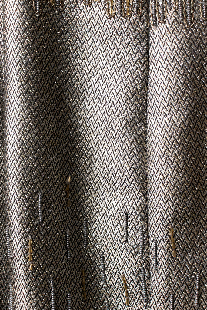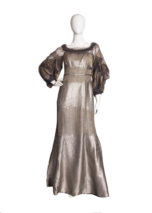 This stunning gown makes a bold impression! Crafted from a heavy woven silk and polyester blend, it features intricate silver and gold beadwork. The bias cut ensures a beautiful drape, while the balloon sleeves add a dramatic touch. A subtle train enhances its elegance and sparkle for evening wear. Details include tulle-trimmed boning in the bodice, a mini train, cream silk lining, and a back zipper. The semi-sheer, heavily beaded balloon sleeves hold their shape with 8-inch cuffs. Gently worn with tags, it has a faint interior stain on the back train.