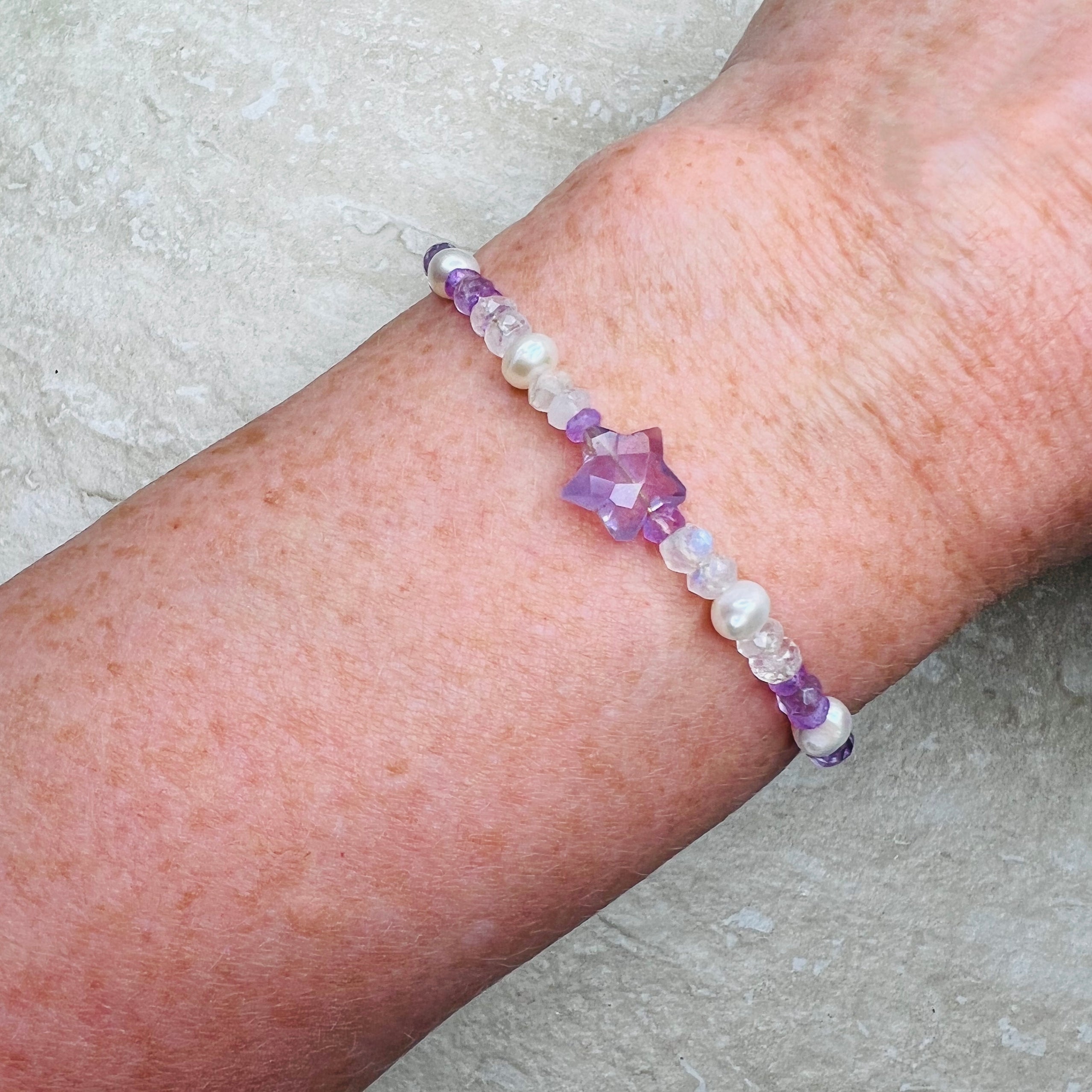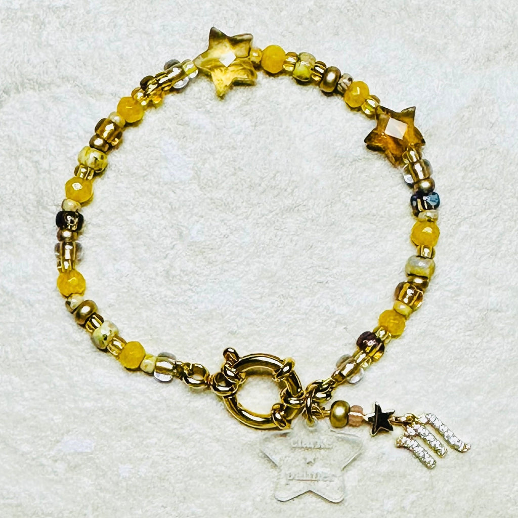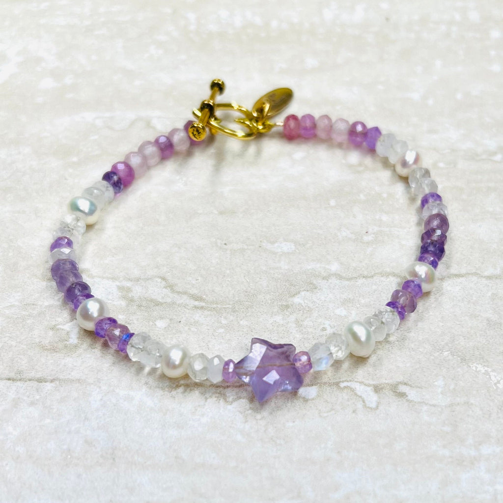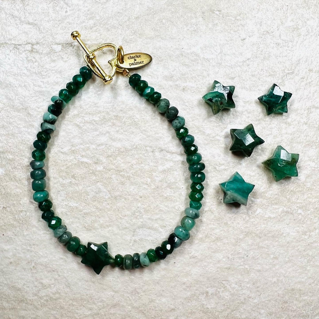 Hand made from sustainably sourced hand cut real gemstone star and rondelles, it has a 24kt gold vermeil heart shaped clasp.