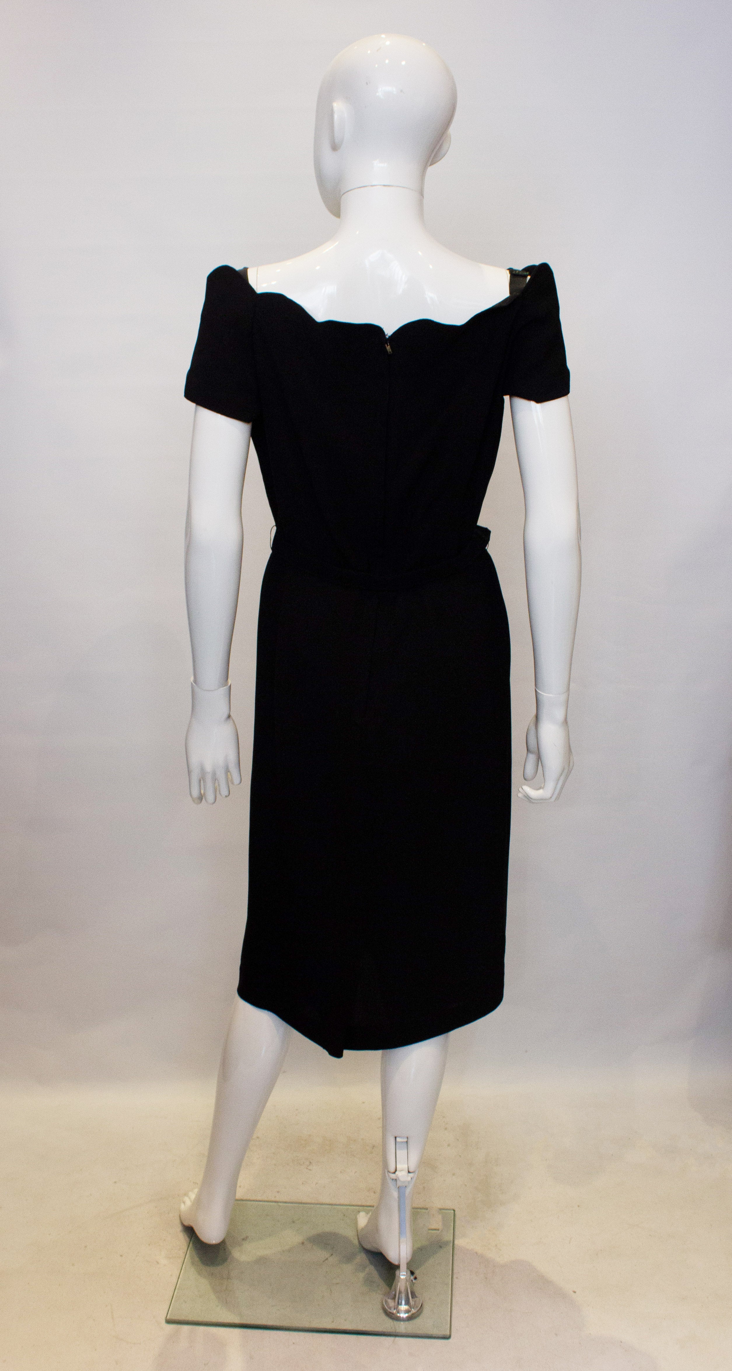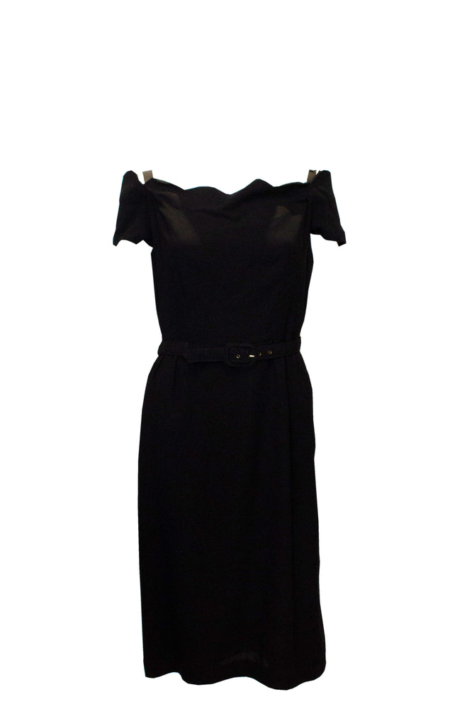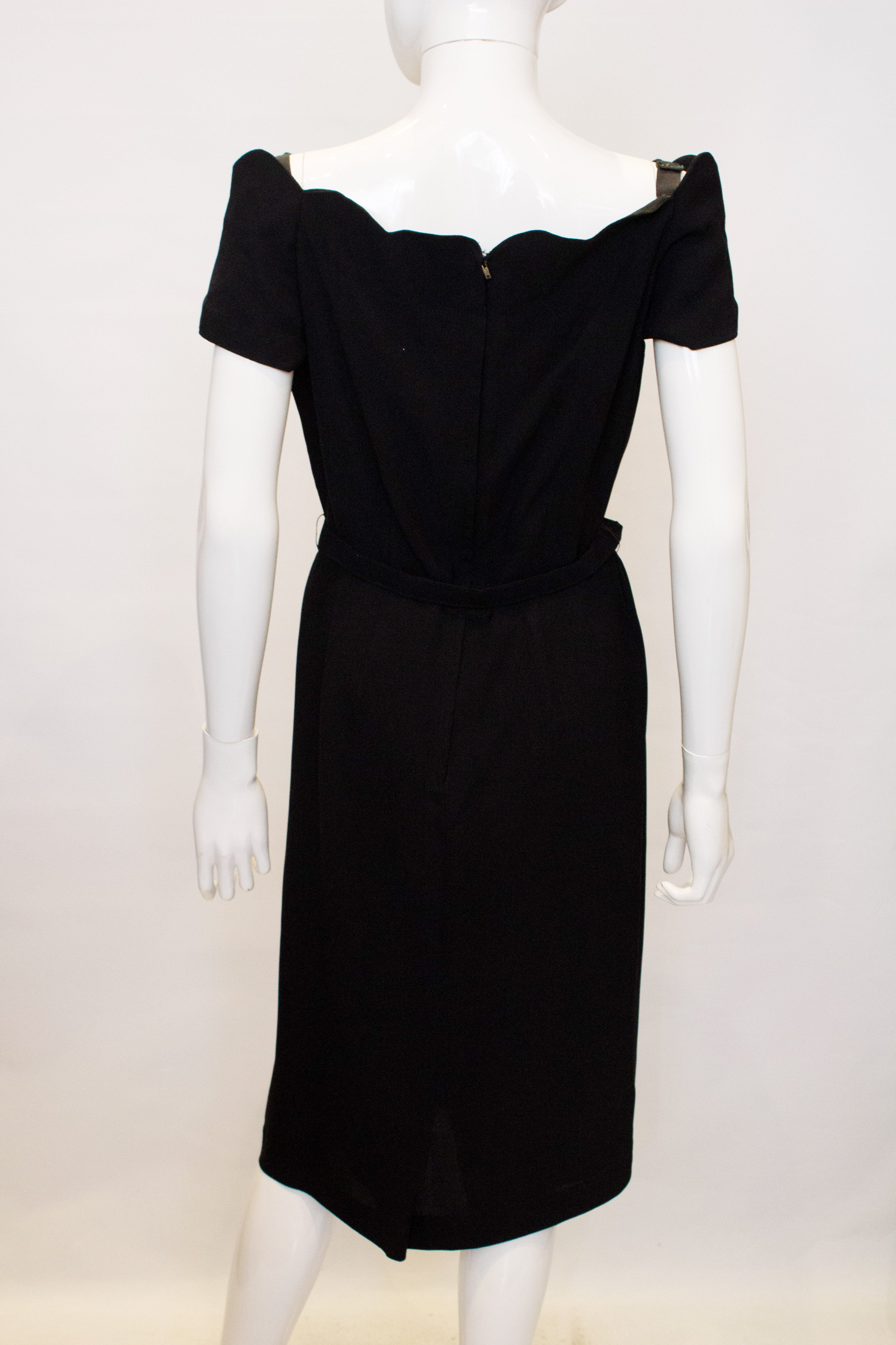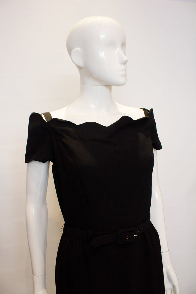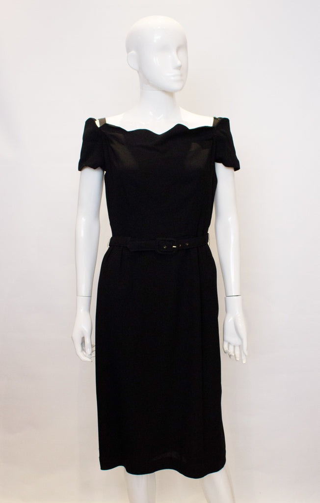 A chic vintage cocktail/ dinner dress by Linz Line. The dress has a scalloped off the shoulder neckline and is fully lined. There is gathering at the waist, a self fabric belt and central back zip opening.