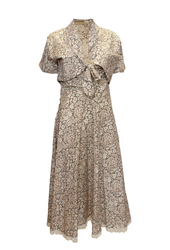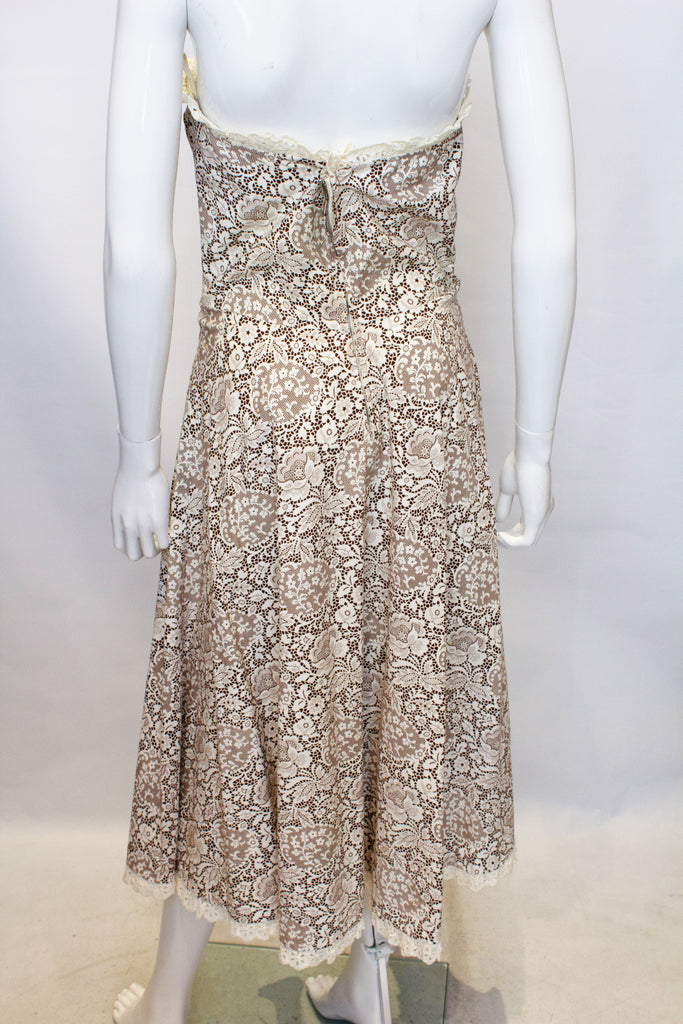 A fun vintage dress by Horrocks with a matching bolero. The dress is in a brown and white print with a lace frill at the hem. The dress has a sweetheart neckline, boning in the bodice and a central back zip. The bolero has a shawl collar and central back zip. Measurements: Dress bust 38'', waist 29'',length 43'' Bolero bust up to 41'', length 14''