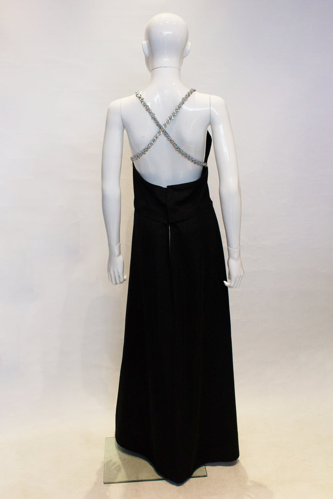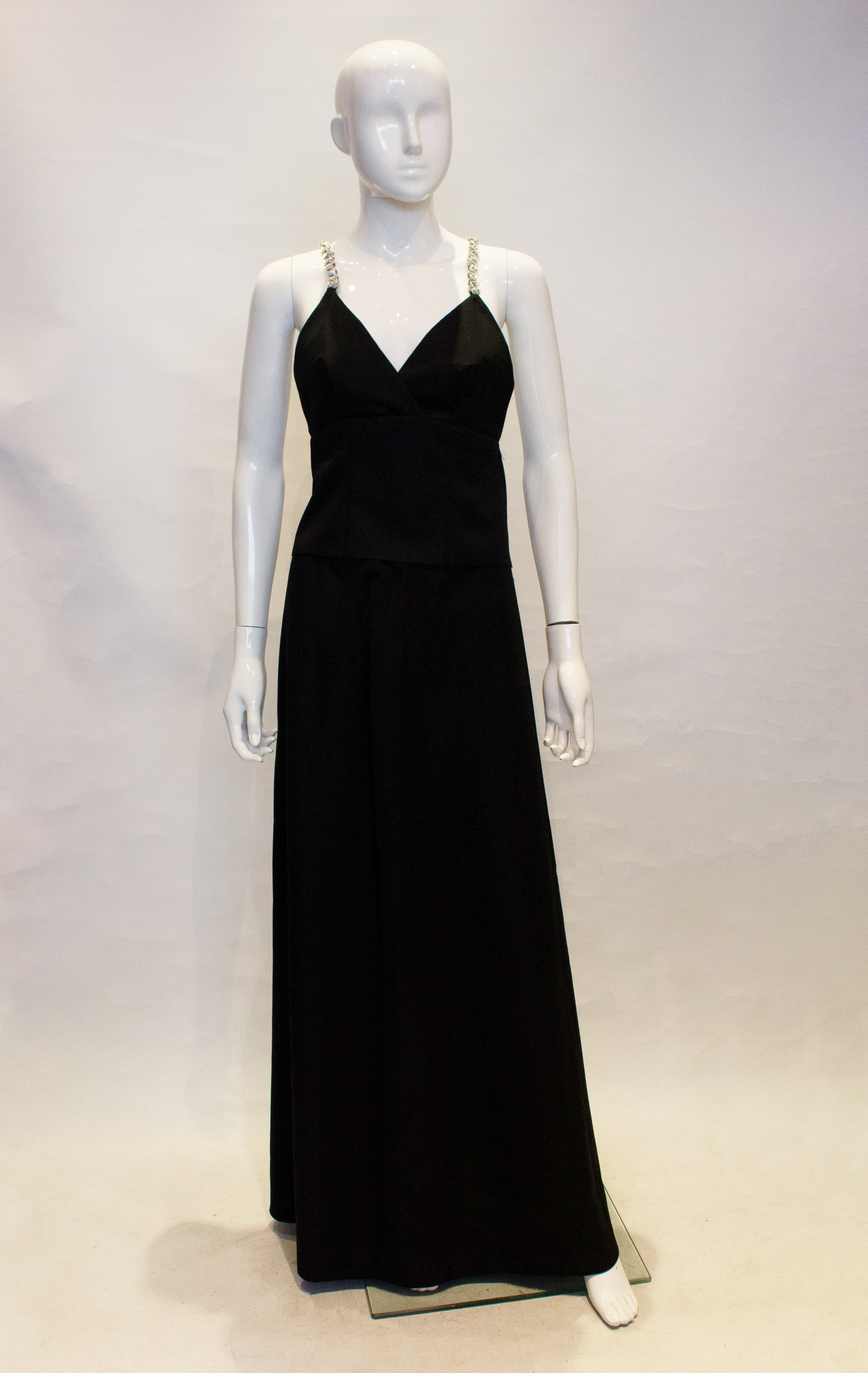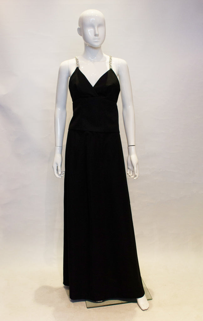 A homemade but headturning two piece from the 1970s. In a black crepe fabric the top has crossover back straps in sequins with a zip fastening. The skirt is A line with a back central zip. Measurements: Bust 36'', waist 31'' ,length 45''