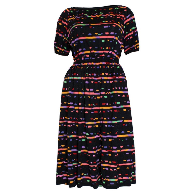 A wonderful Missoni skirt and top , made for New York department store Bonwit Teller.The top has an elasticated ribbed hem, and the neckline and sleeve have knitted edges.The skirt and top are made of cotton with a stunning multi coloured print. The skirt has an elasticated waist and two pockets. They are marked size M and the top is bust 37'', length 19, and the skirt is waist 30'', length 27''.