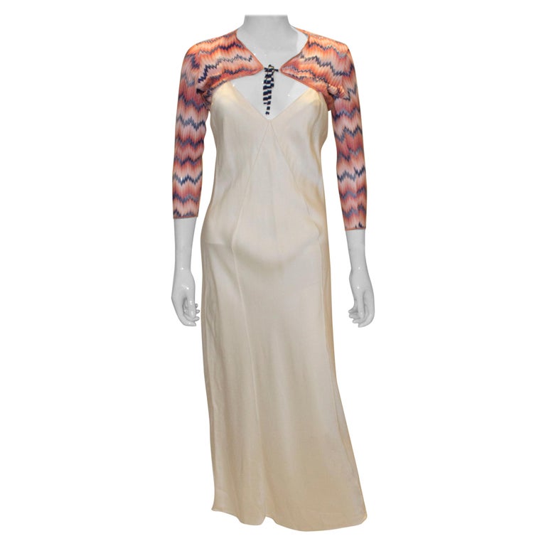 A pretty shrug by Missoni, brown label. The shrug is in a mix of peach, blue and white with blue and white stripe ties.