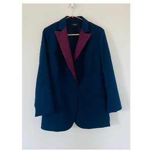 This Akris X Hermès blue blazer presents a unique aesthetic built from upcycled items. No new fabrics or garments were used in this signature design that combines these elegant brands.