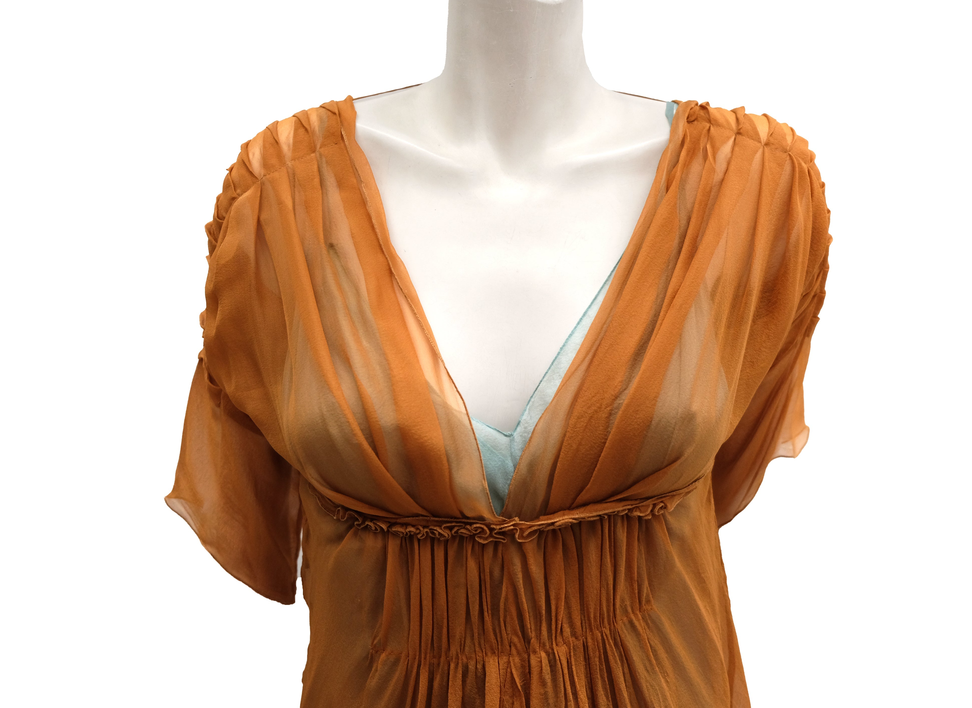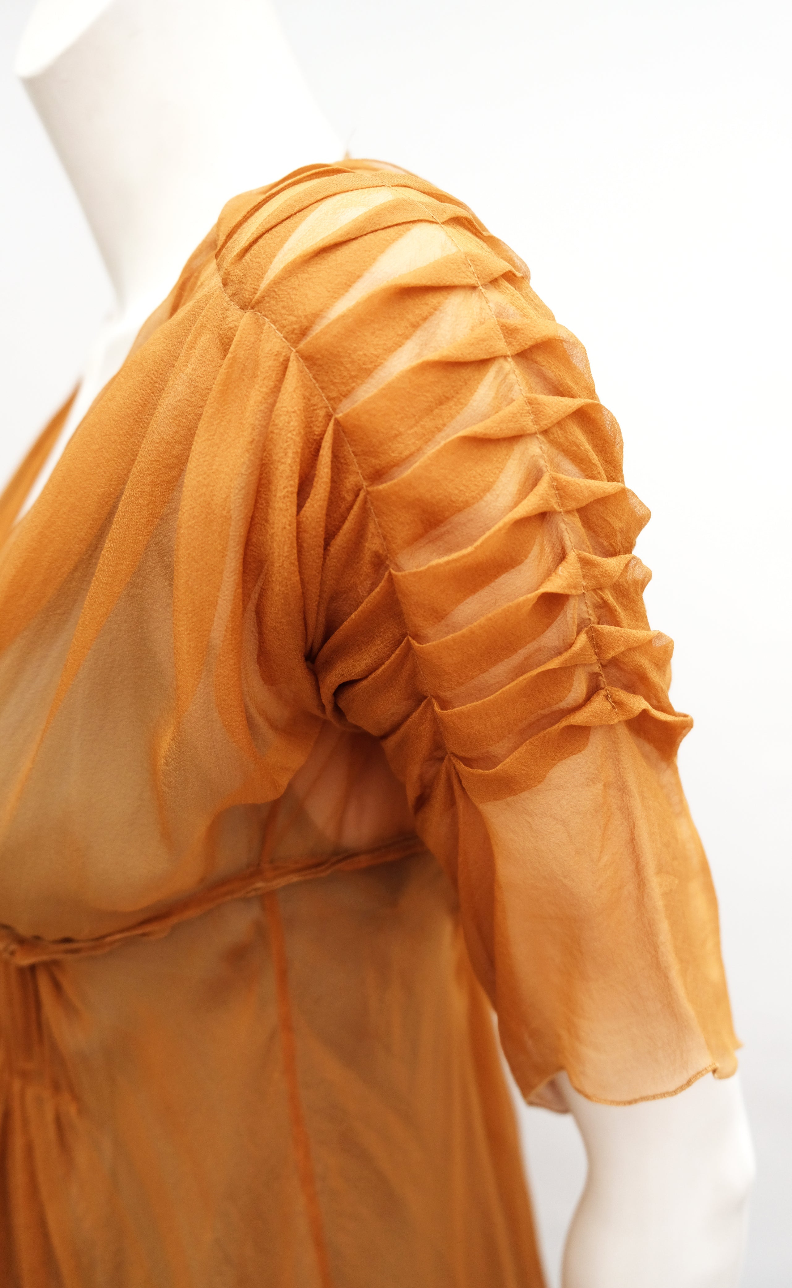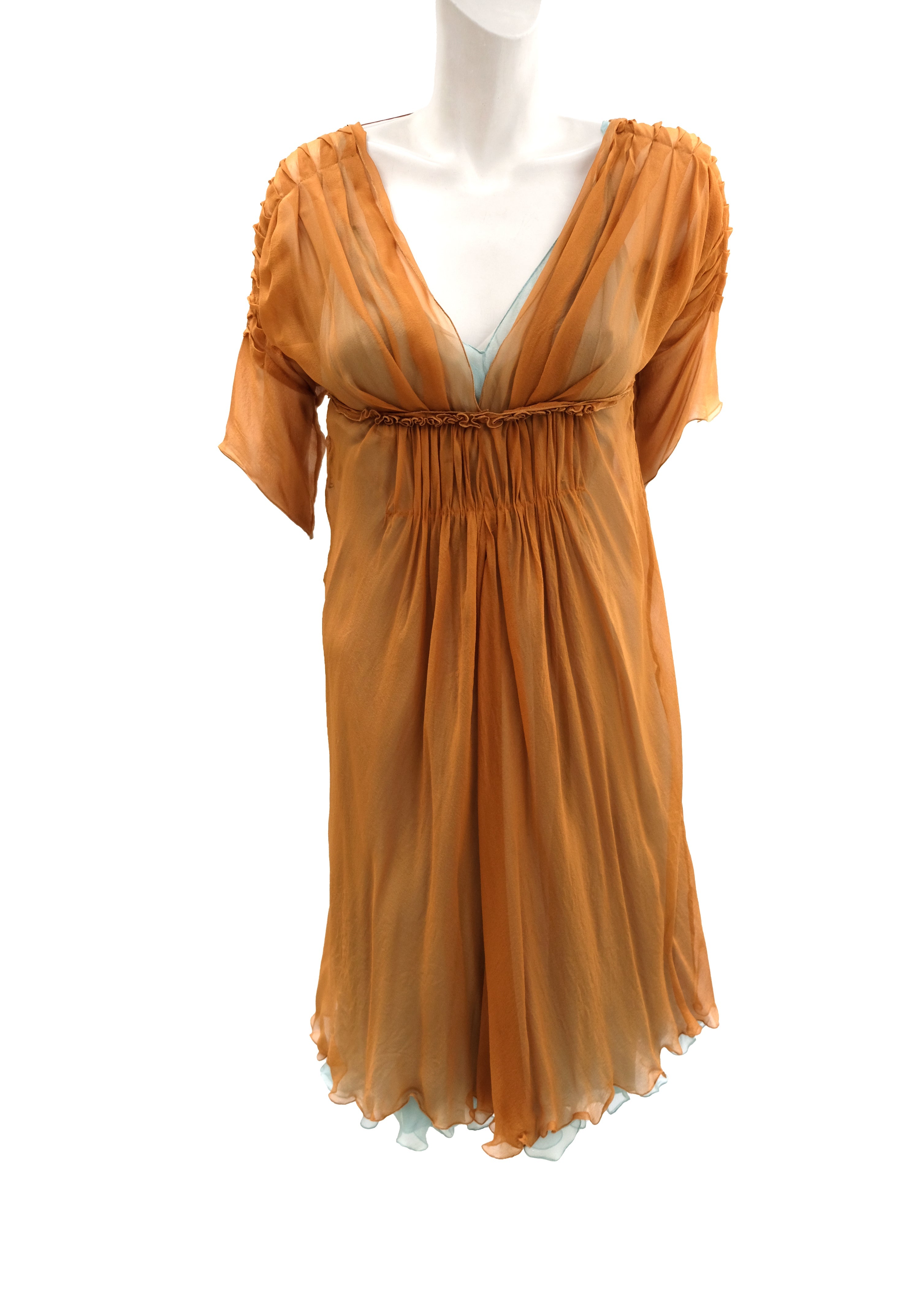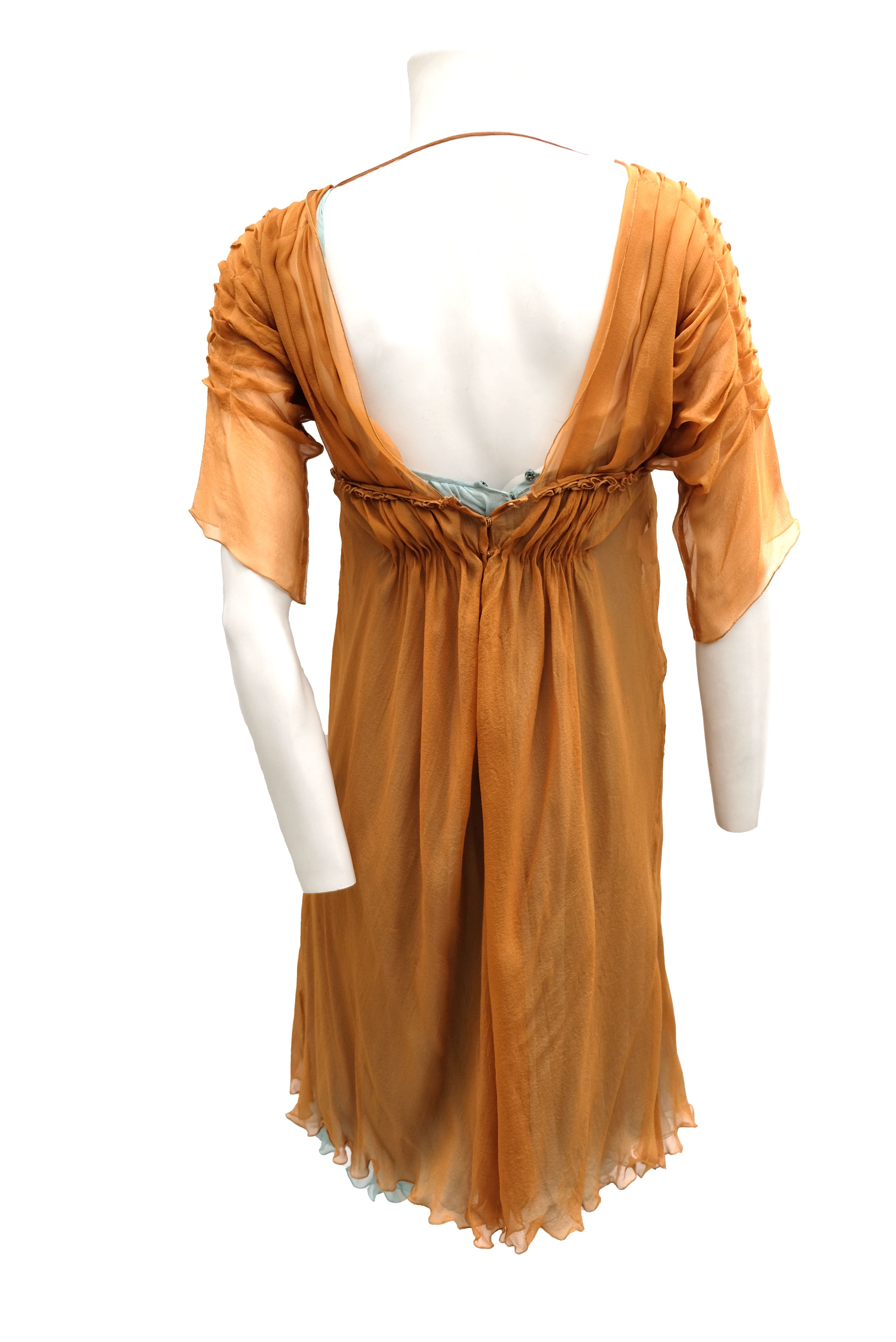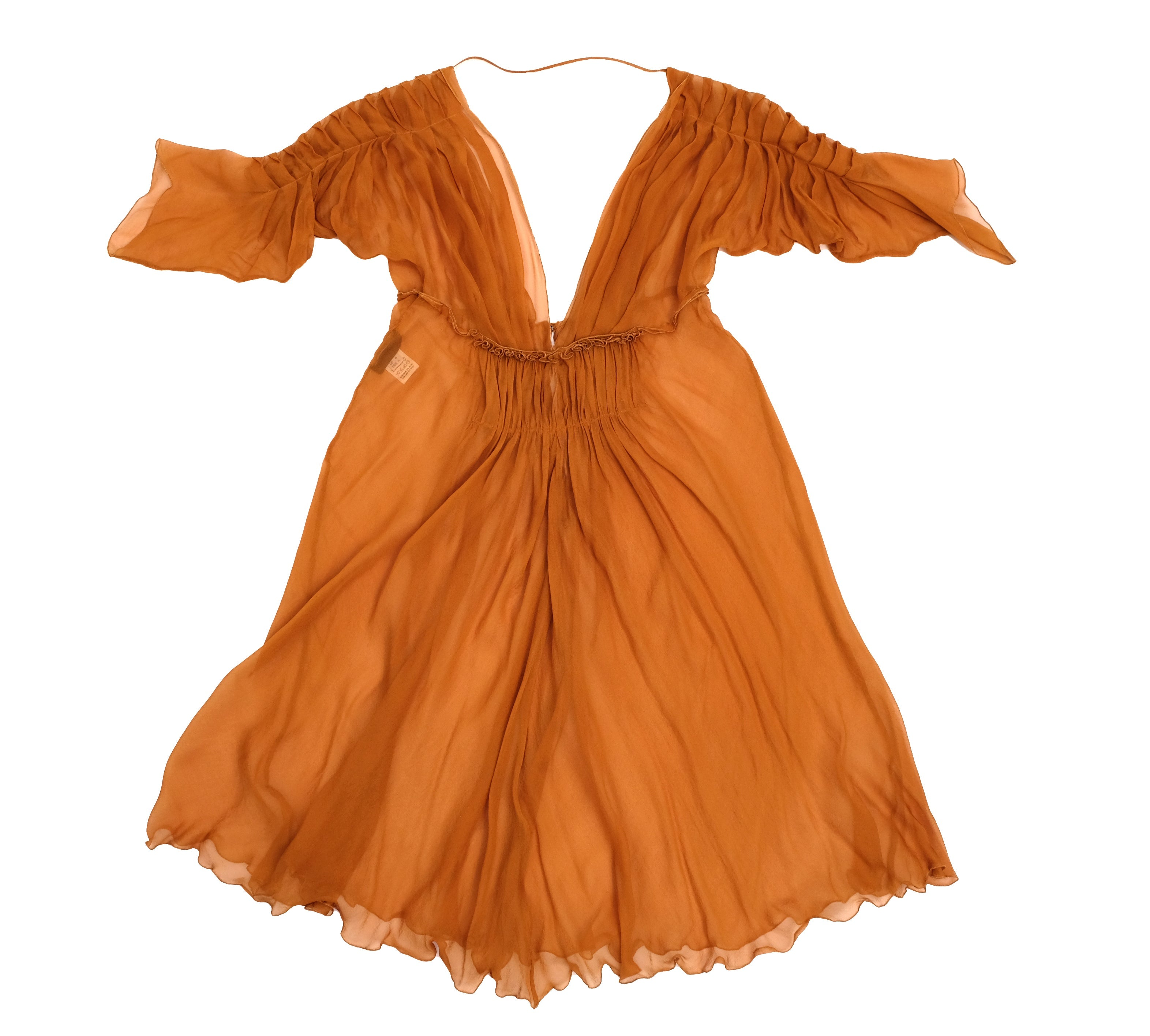 The top layer is made of gossamer thin sheer bright copper coloured silk chiffon. Pleated at the shoulders and elbow length sleeves. Plunging neck, gathered under the bust and at the waist. Knee length. Delicate tiny popper fastenings at the back.