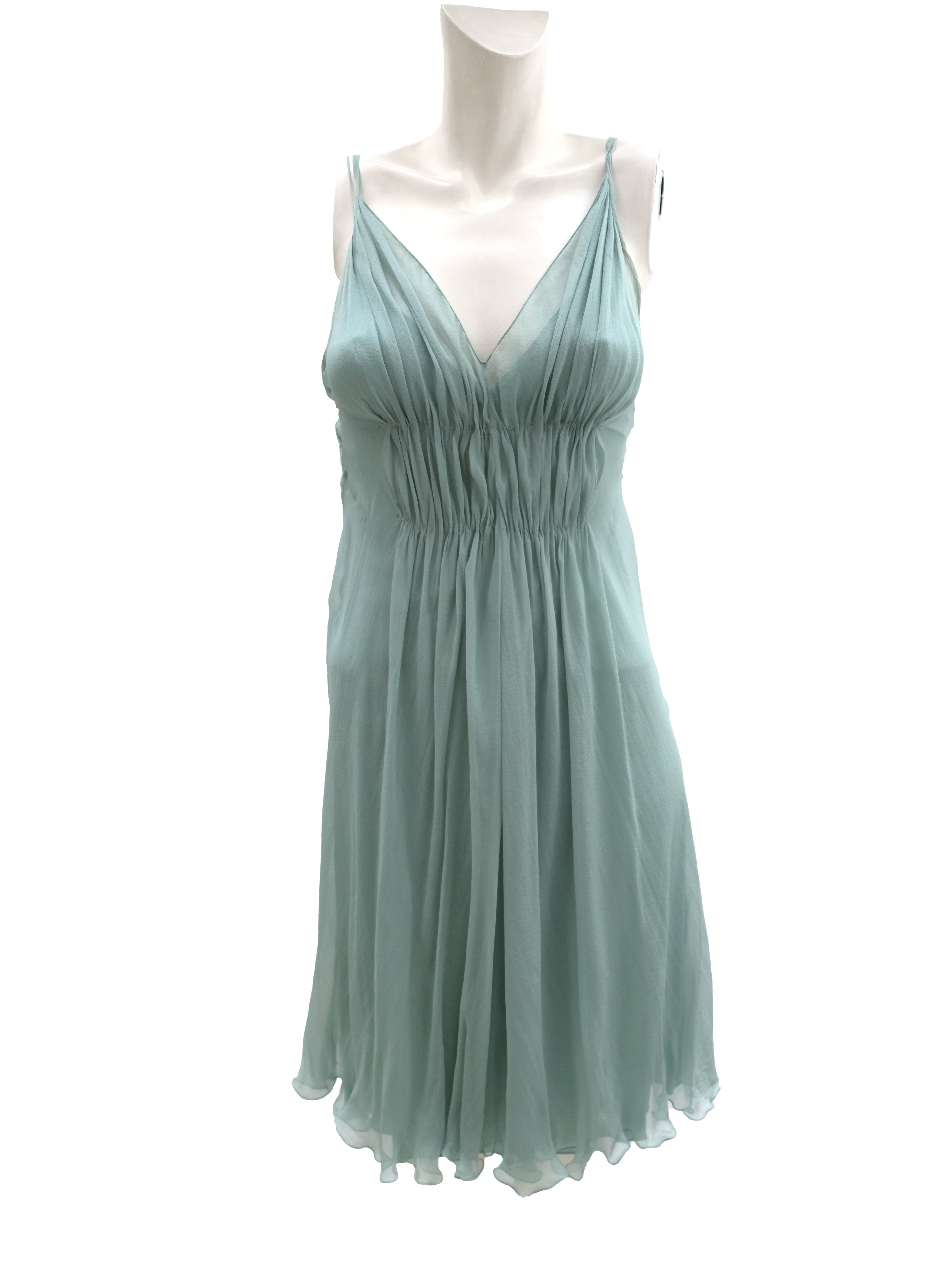 Slip in pale duck egg blue, with a strappy middle layer in the same colour chiffon, gathered at the bust. Deep V neck, very fine shoulder straps.