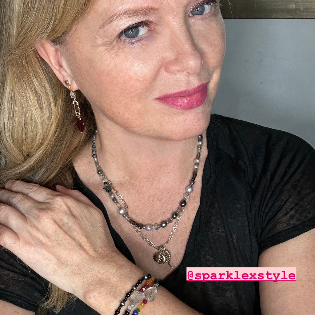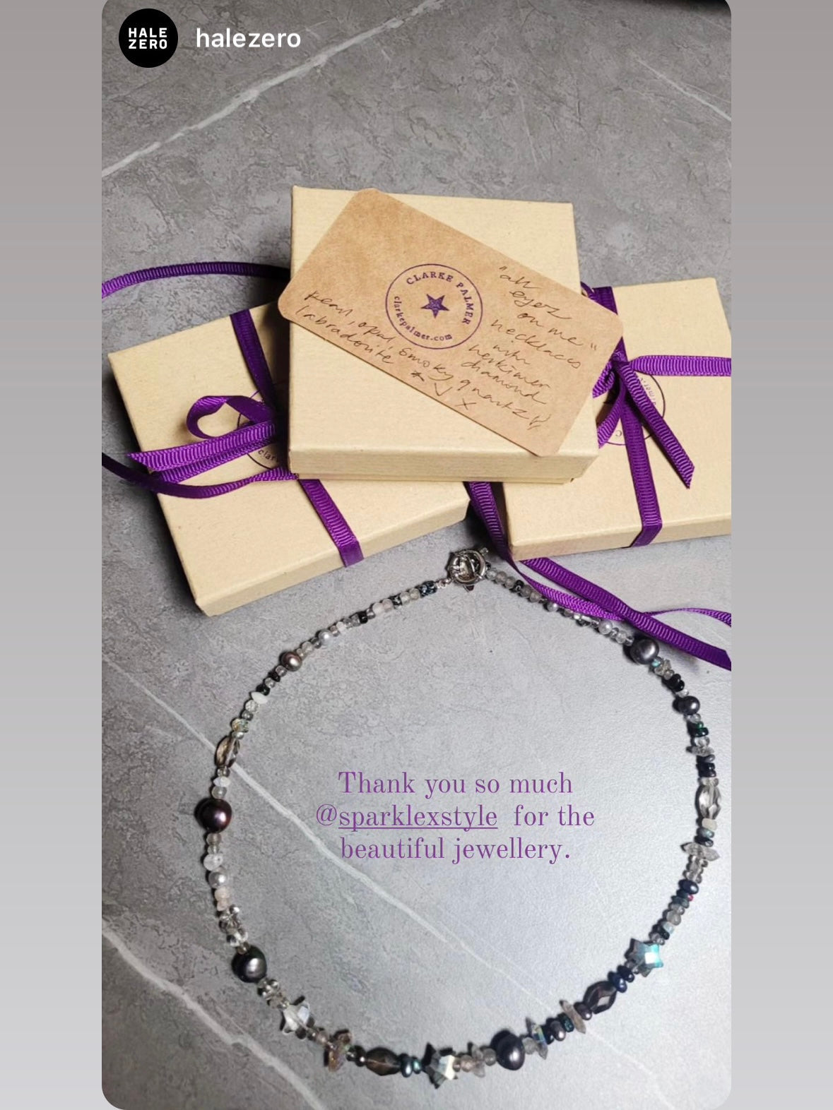 This beautiful necklace is available in four styles and all feature three hand cut gemstone stars, smooth and faceted rondelles, precious metal coated Herkimer diamonds, opals, labradorite, pale gray and peacock pearls. As worn by DJs Hale Zero and as seen in GQ and British VOGUE.