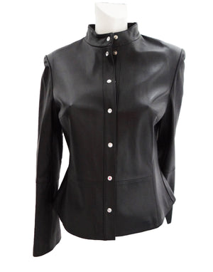 A sleek leather jacket by Anne Klein, an elegant reinvention of a classic biker jacket.