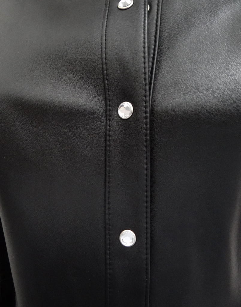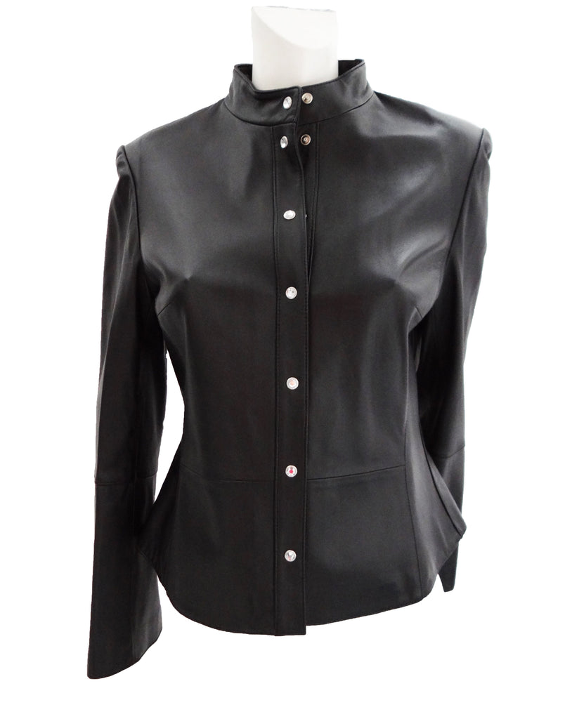 Made from high quality softest black leather, the jacket is plain in style, just over waist length, with a biker-style stand up collar. It is sculpted at the waist, and has lovely flared sleeves. The jacket and sleeves fasten with rows of faceted crystal press studs. Fully lined.