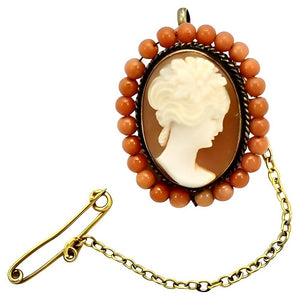 Beautiful gold plated shell cameo brooch, with rope twist detail and a coral bead surround. It has a safety chain.