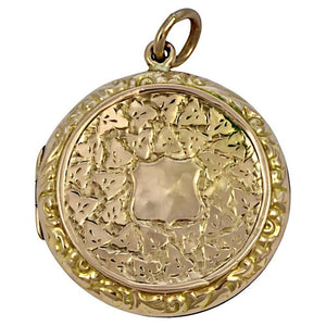 Beautiful antique Victorian 9ct rose gold back and front locket with a shield cartouche, and featuring engraved ivy leaves, and a leaves scroll design edging.