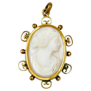 Beautiful antique carved angel skin coral cameo pendant of a lady, in a decorative gold plated setting.